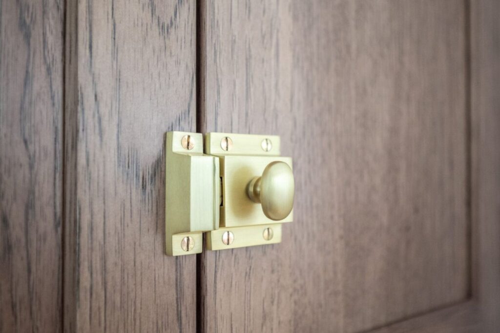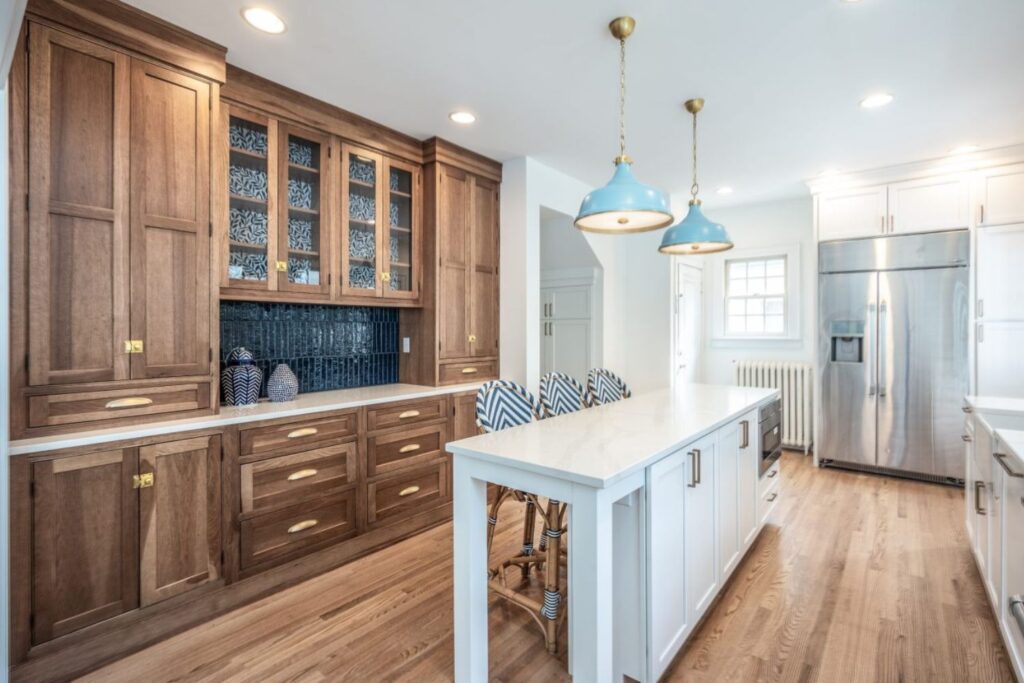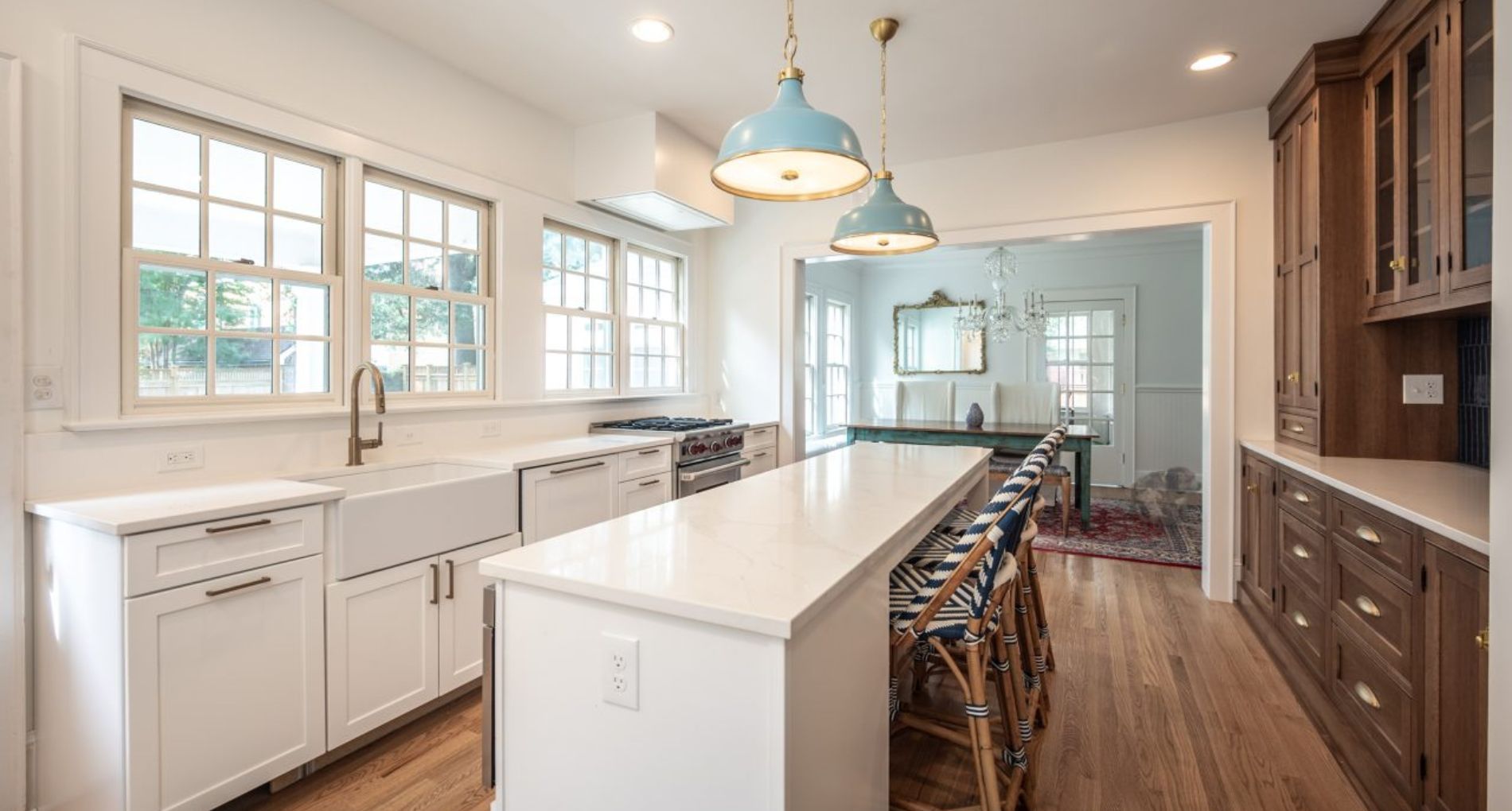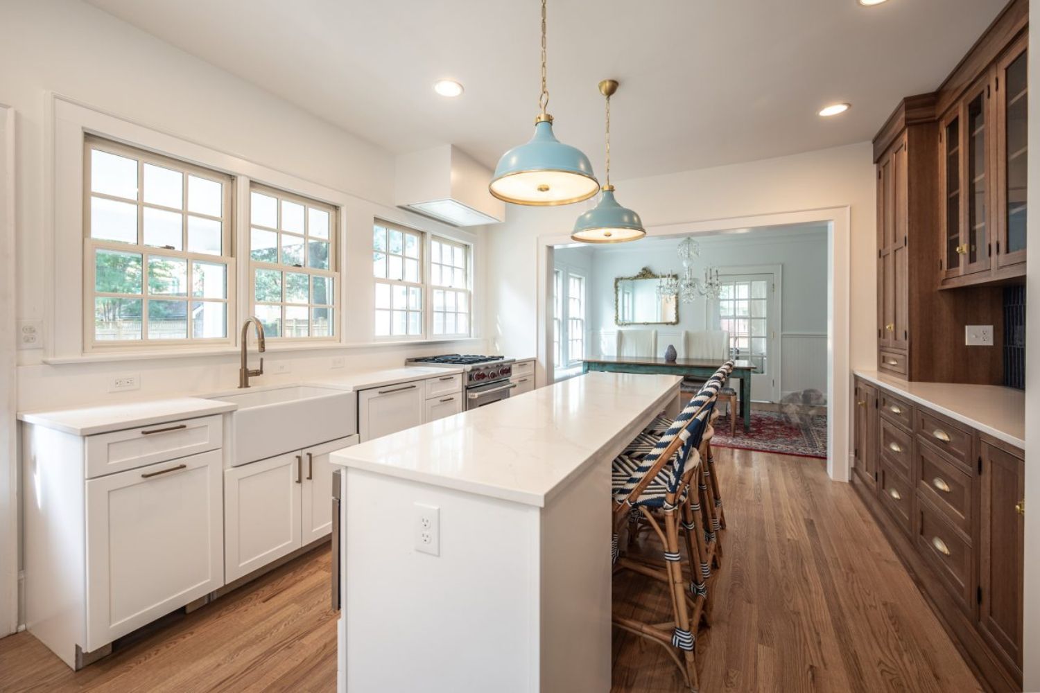 The original Belle Haven kitchen was cramped and barely functioned as a kitchen for this family of four. During this kitchen renovation, we removed unused closets and a poorly placed HVAC return duct to create much-needed space, allowing for a narrow but functional island. Brass cabinet latches accent the hickory hutch cabinets, opening up access to the dining room and better connecting the kitchen to the rest of the home.