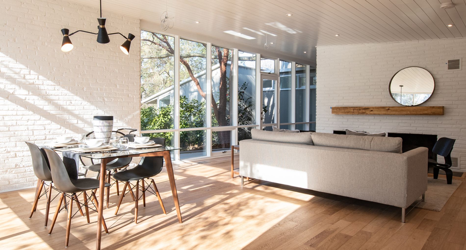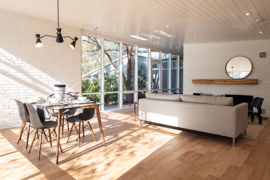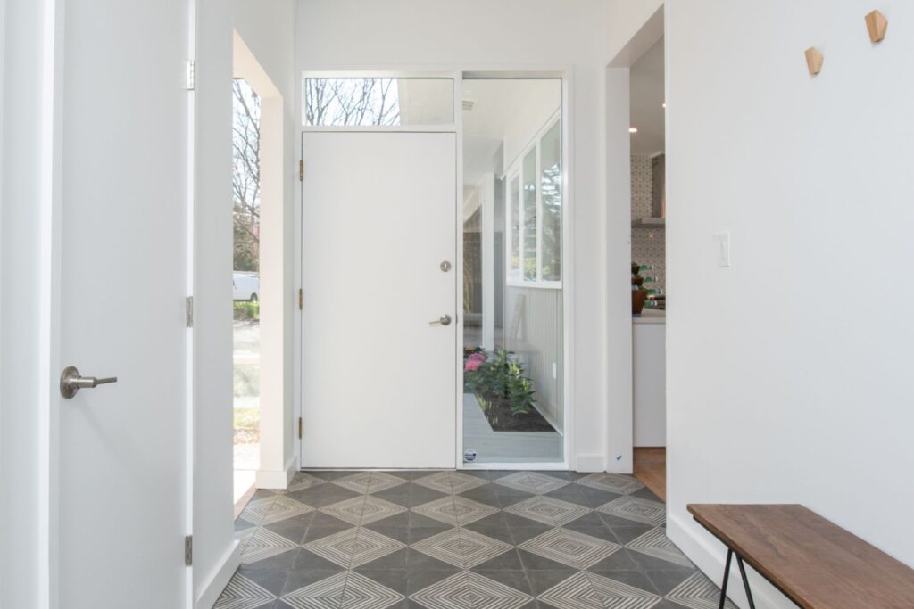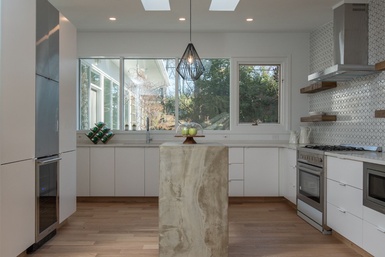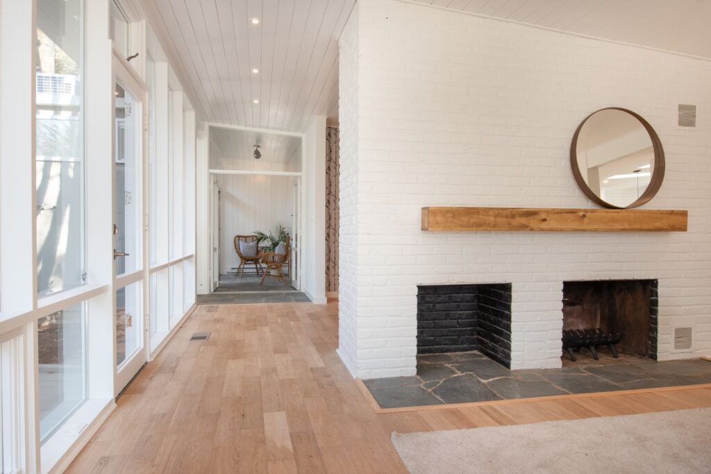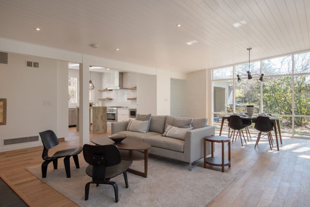 This project was a full home renovation of a custom-designed mid-century butterfly roof ranch home. The soaring ceilings were complemented with new floor-to-ceiling windows and reframed walls to create a more open living plan. Shiplap ceilings, classic tile patterns, and custom decorative concrete features add to the uniqueness of this Alexandria custom home.