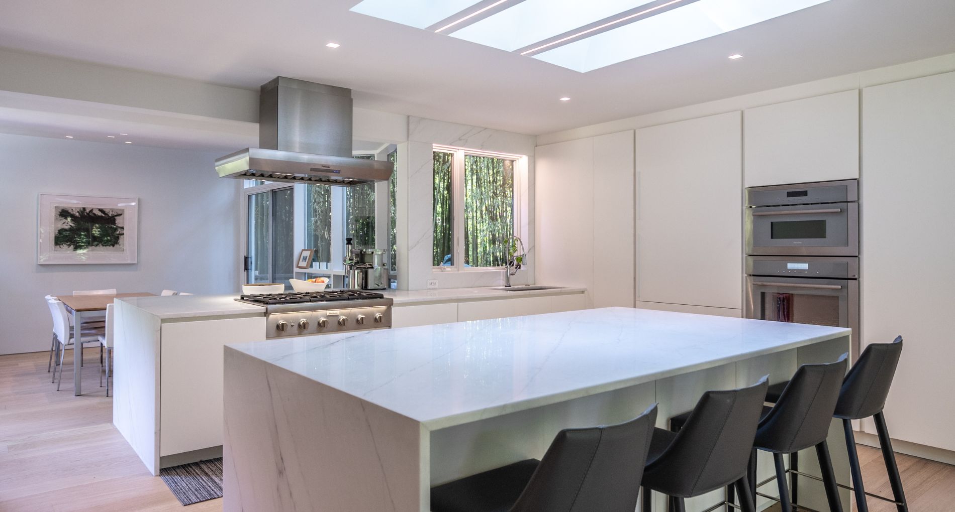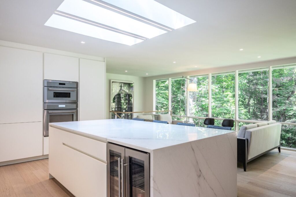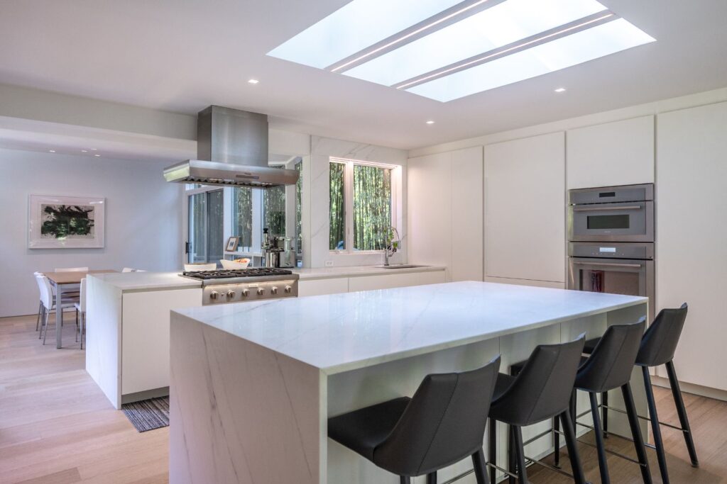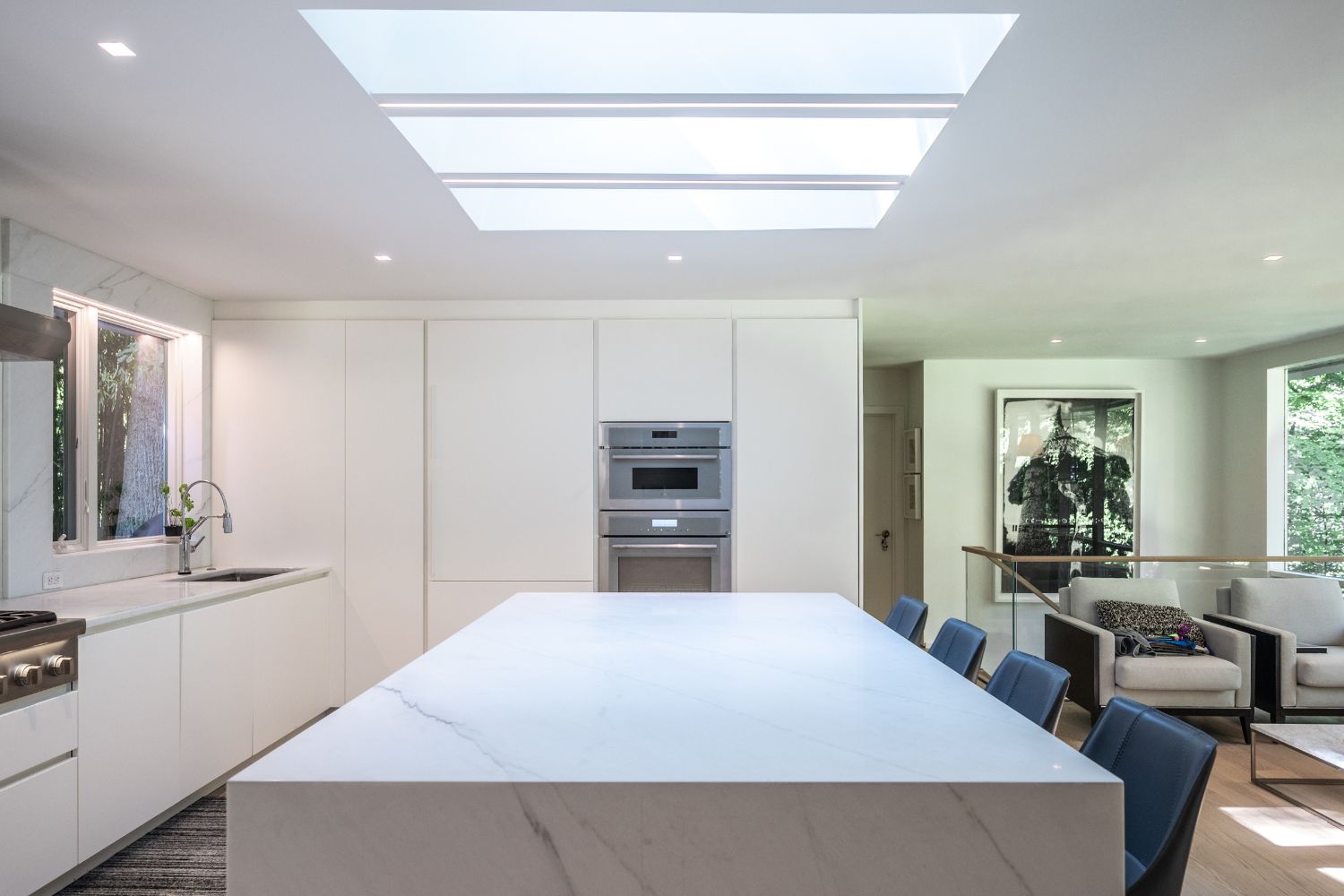 This project started small, but working alongside the clients, both architects, we were able to create a cook’s kitchen and a light and airy entertaining space. We implemented some fabulous details like shadow-line baseboards, flush aluminum floor registers, and trimless ceiling light fixtures. Ultra-modern white cabinets and white Carrara marble countertops complement new white oak flooring throughout. New glass stair railings add a contemporary flair, along with a new skylight over the kitchen island.