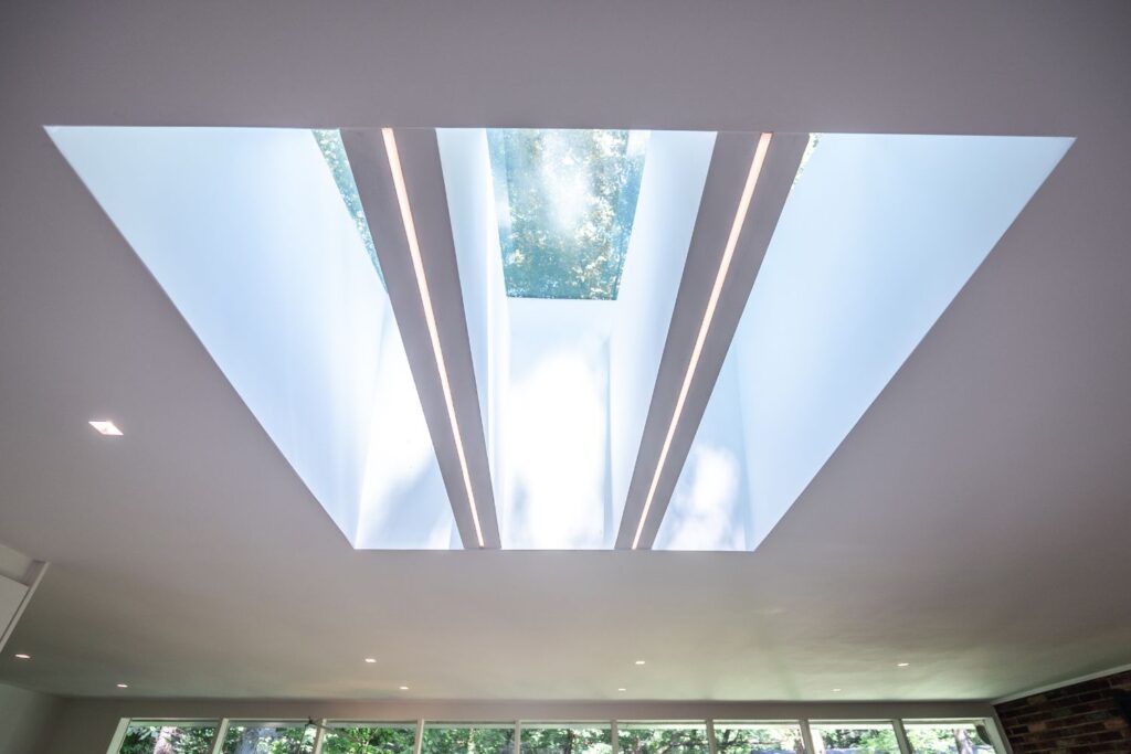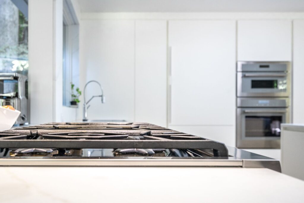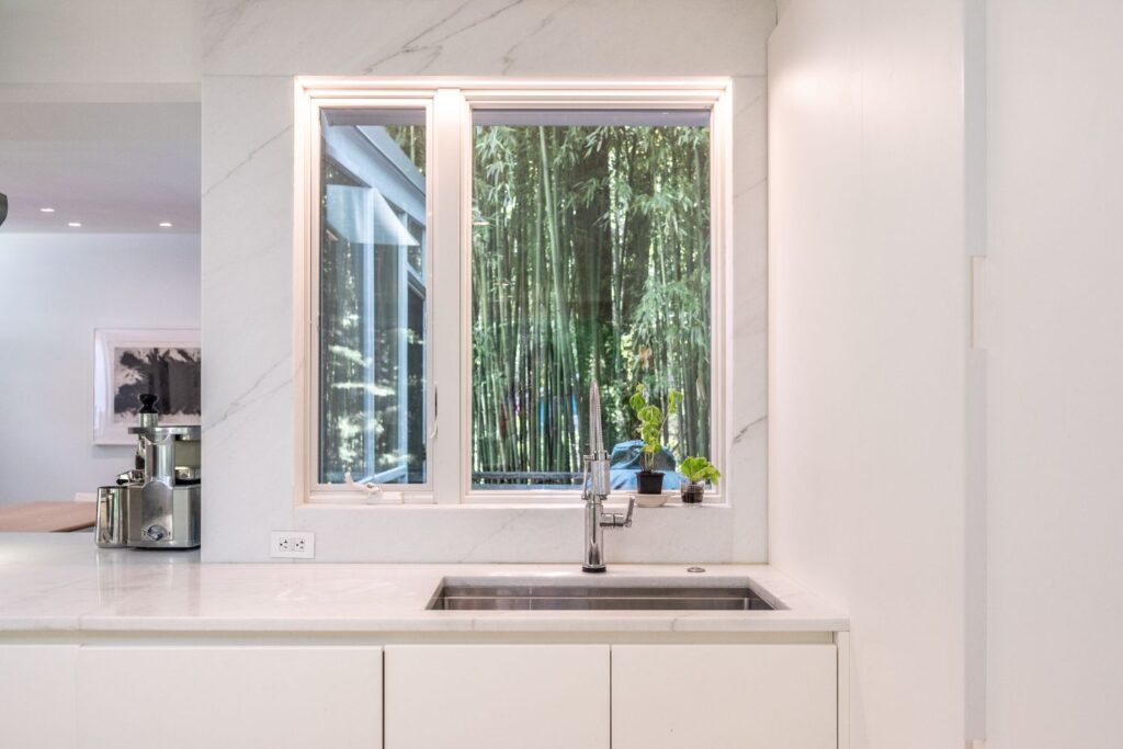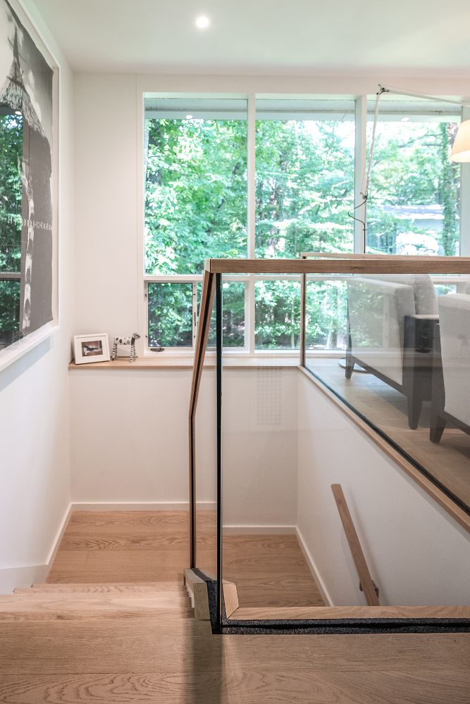 This project started small, but working alongside the clients, both architects, we were able to create a cook’s kitchen and a light and airy entertaining space. We implemented some fabulous details like shadow-line baseboards, flush aluminum floor registers, and trimless ceiling light fixtures. Ultra-modern white cabinets and white Carrara marble countertops complement new white oak flooring throughout. New glass stair railings add a contemporary flair, along with a new skylight over the kitchen island.
