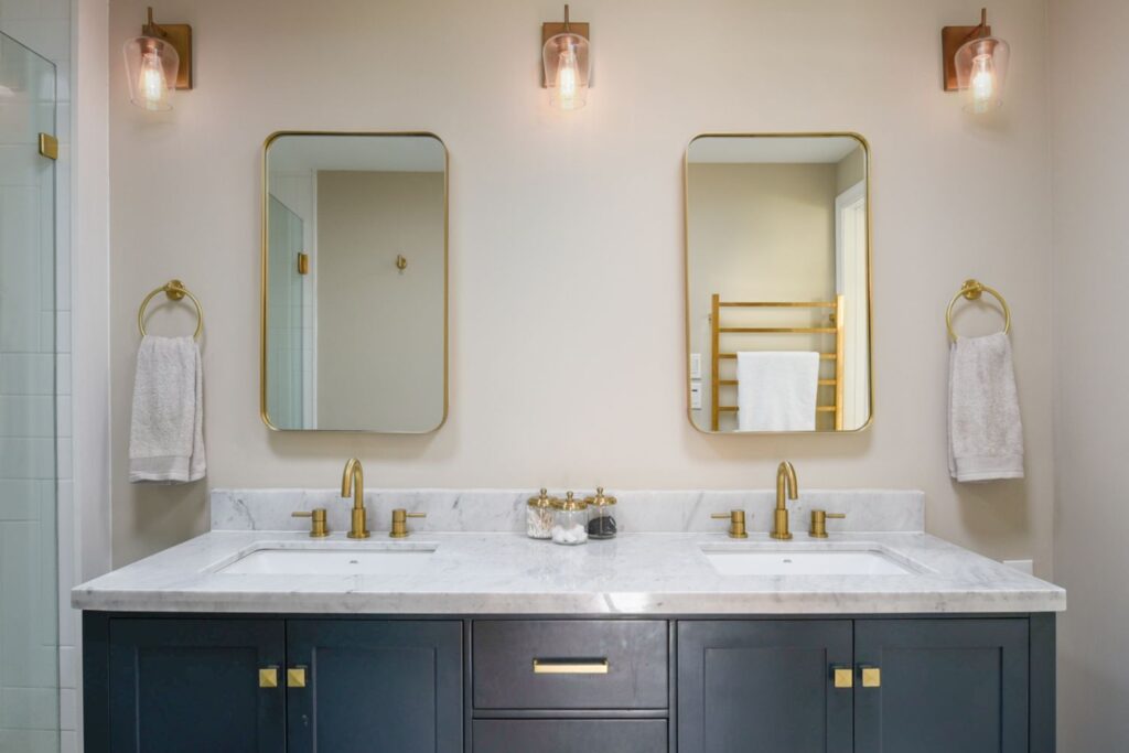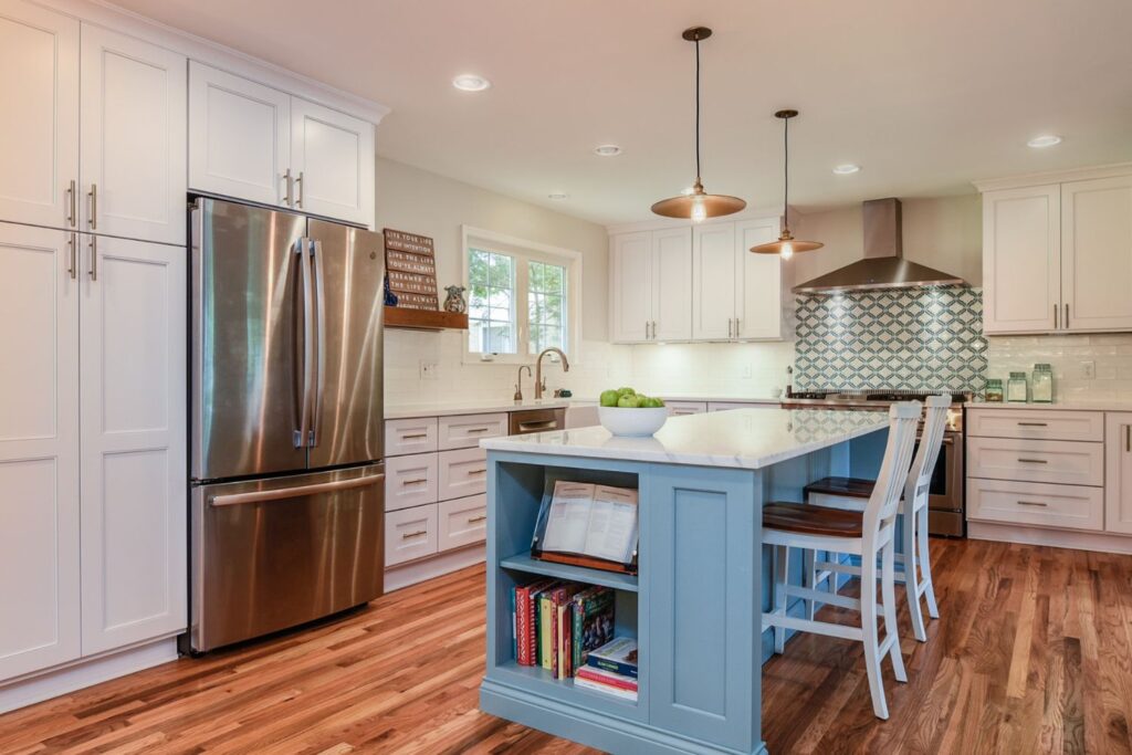 Almost every inch of this Colonial home in Alexandria’s coveted Seminary Ridge neighborhood hadn’t been touched in decades and desperately needed updating. Reconfiguring the first-floor plan allowed for an open flow from the new mudroom and laundry room off the garage through the family room and dining room, the completely redesigned kitchen, and the formal living room. The second level was also reconfigured to create a proper primary suite with a large closet, spacious bathroom, and a hall bathroom for the kids that included playful tile and wallpaper selections.