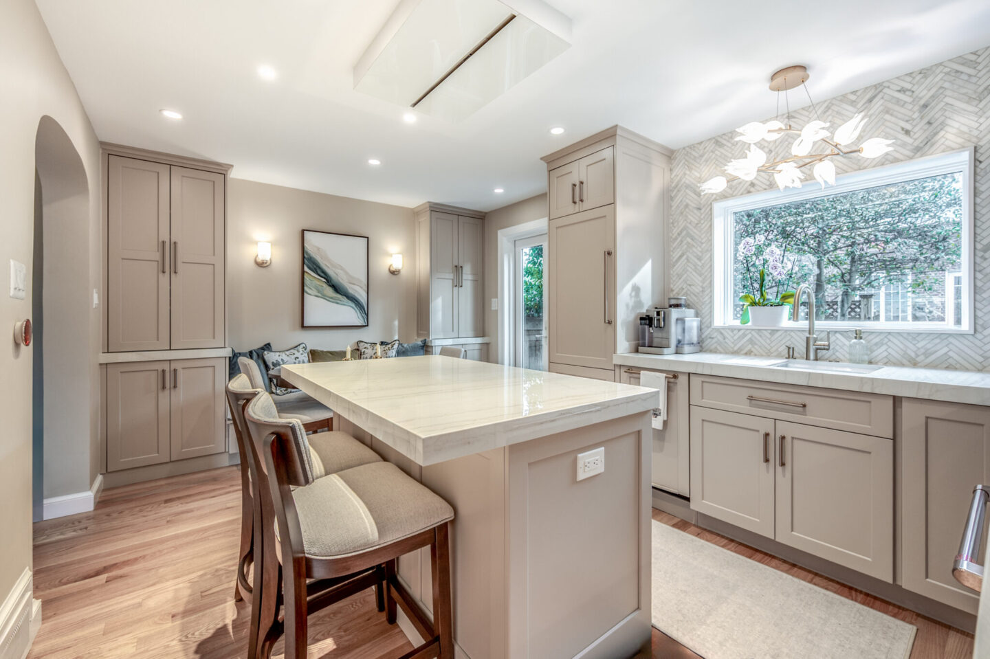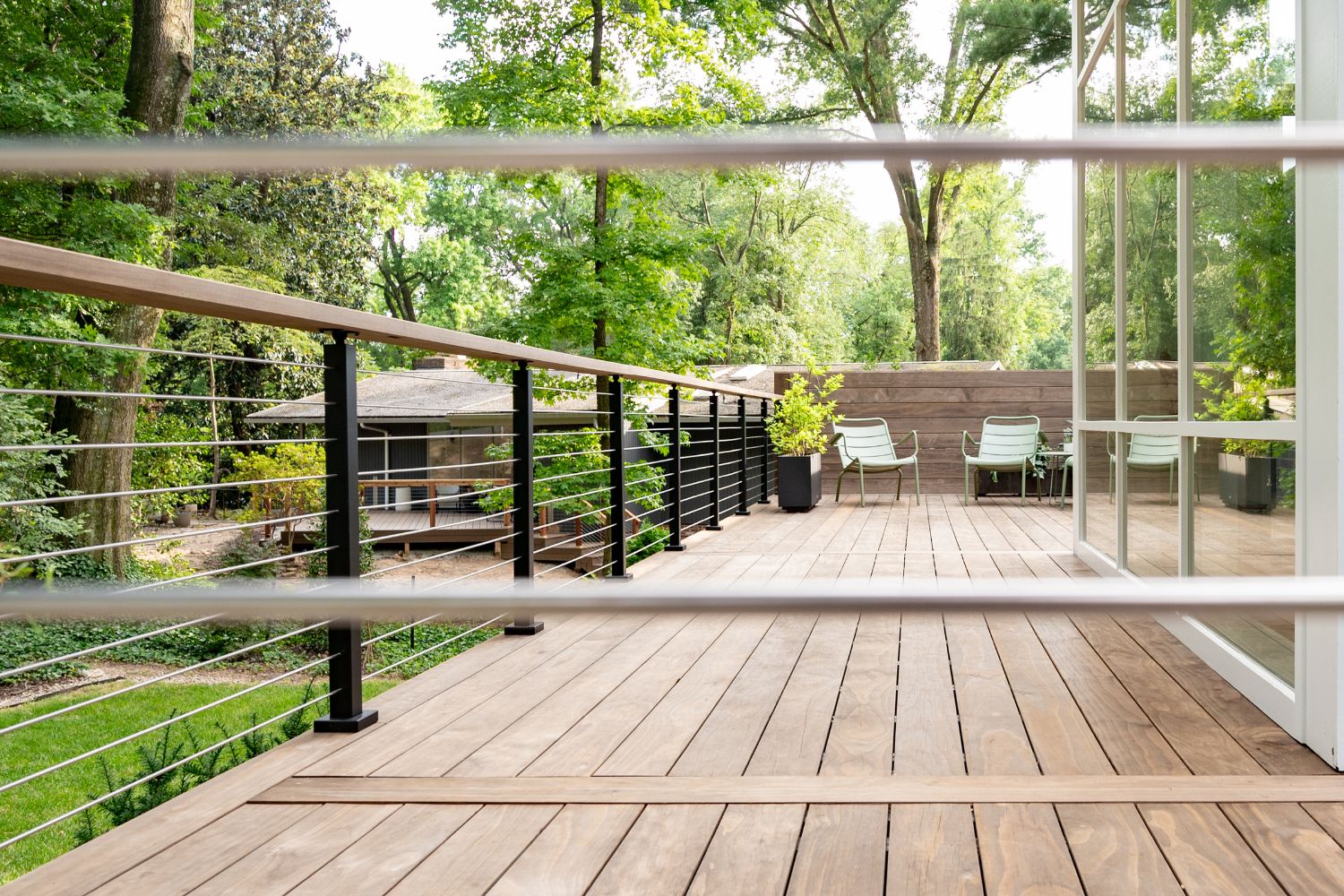 Bringing the addition into conformity with the neighborhood was straightforward, and what was constructed fits in as if it were built as part of the original home. The deck was rebuilt using a modified wood product called Kebony, which is extremely stable and naturally turns gray over time without requiring any maintenance. Stainless steel and aluminum rod railings create a minimal visual barrier from the deck, and new bluestone steps tie in the main front entry to the elevated parking pad.
