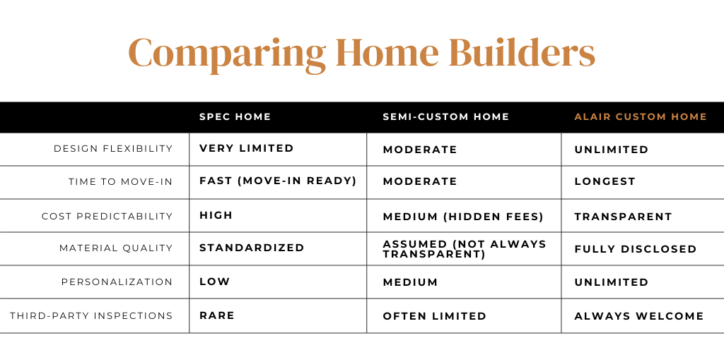 If a spec or semi-custom builder feels like the right fit, we’re happy to make referrals. But if you’re ready to create a truly one-of-a-kind home, the team at Alair is here to guide you through a custom building experience that’s smooth, transparent, and tailored to you.