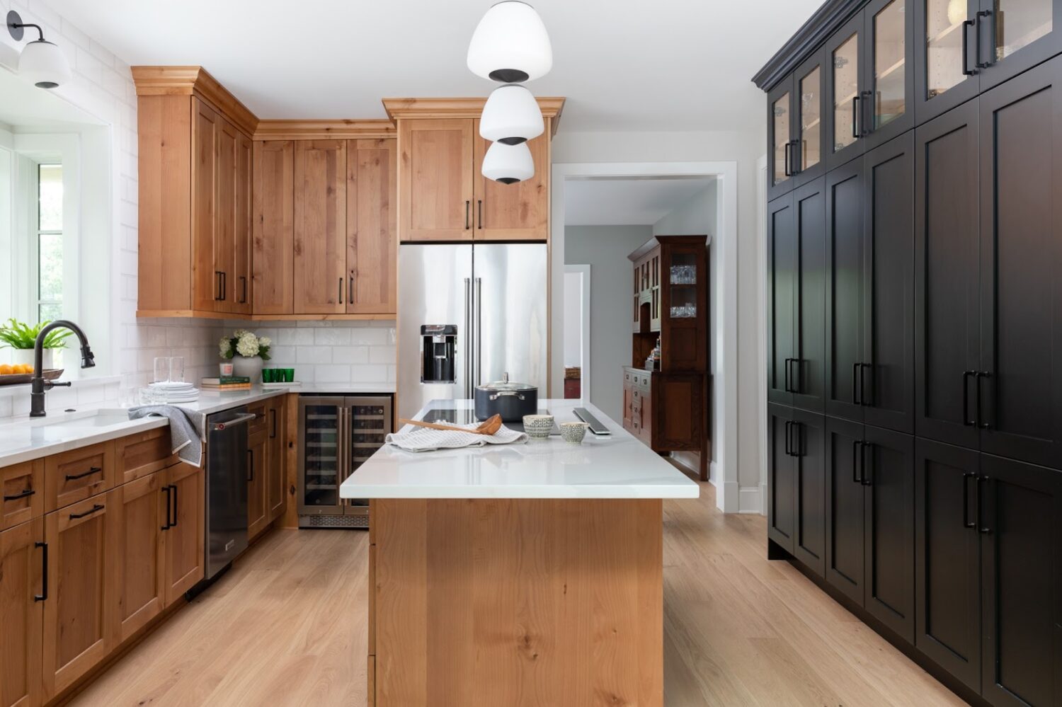When building a custom home, you have the ability to select the specific functionalities that you need, such as specialized storage cabinets, an oversized kitchen island with seating, or a built-in wine fridge as pictured in one of our recent home renovations, below.