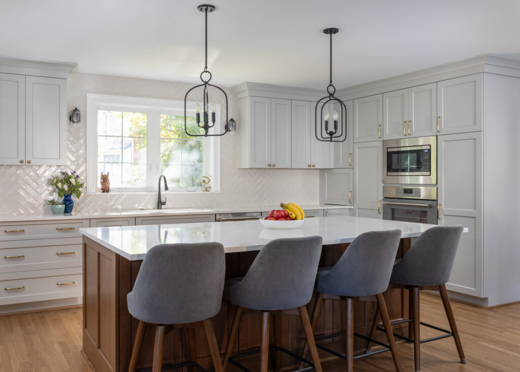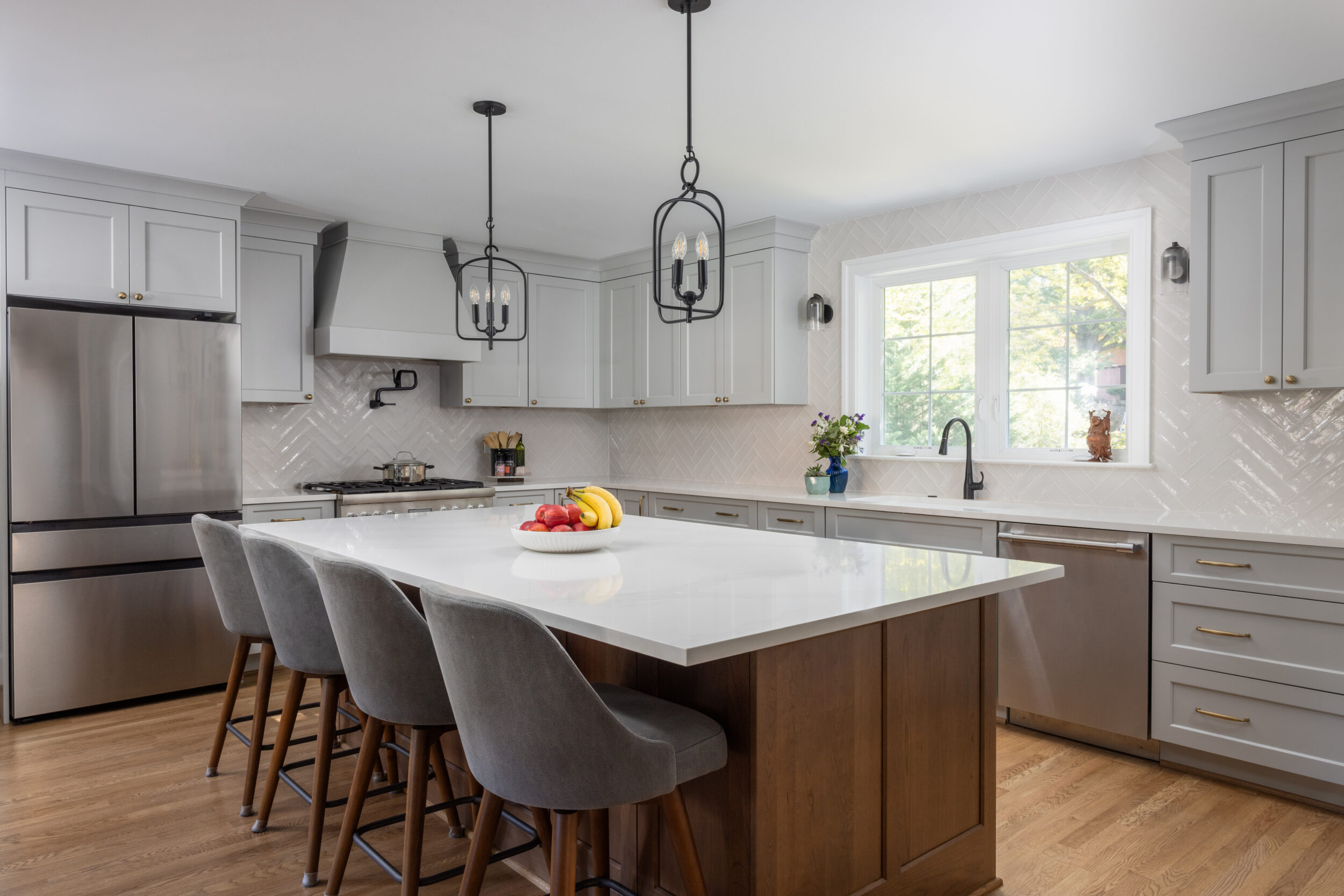 By relocating the stairwell and kitchen, the living space was opened up, resulting in a stunning five-bedroom, four-bathroom home. It features an inviting great room, a finished basement with an in-law suite, and a private balcony for the parents.