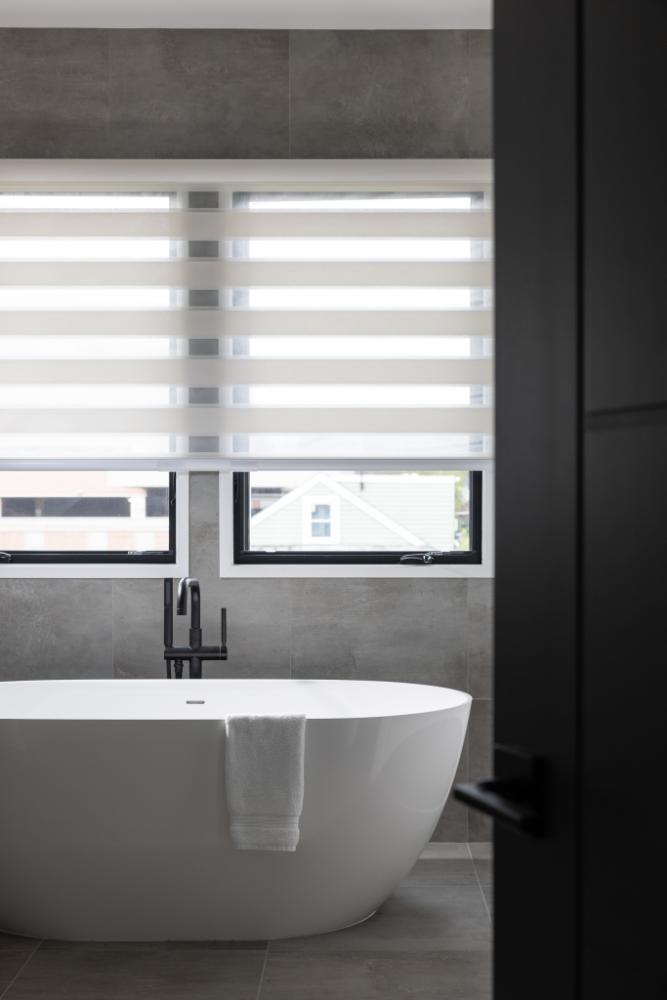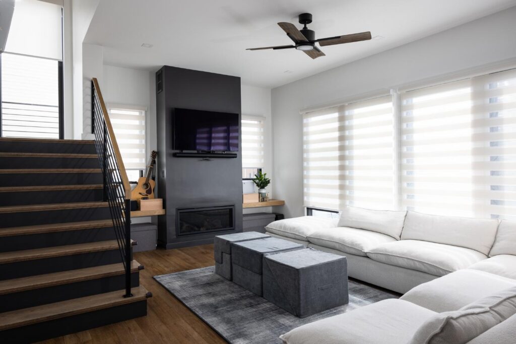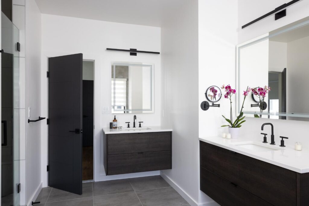 Integrated smart home features, including smart toilets that open automatically and a digital shower system in the primary bath, complement this custom home’s modern aesthetics.