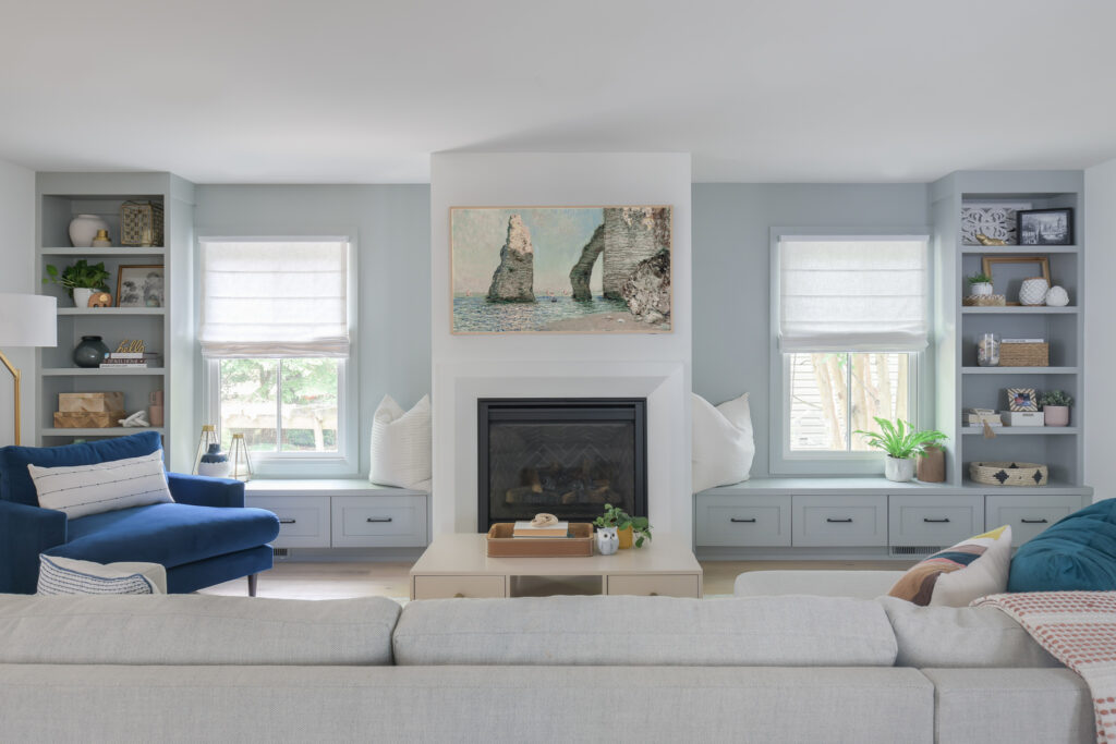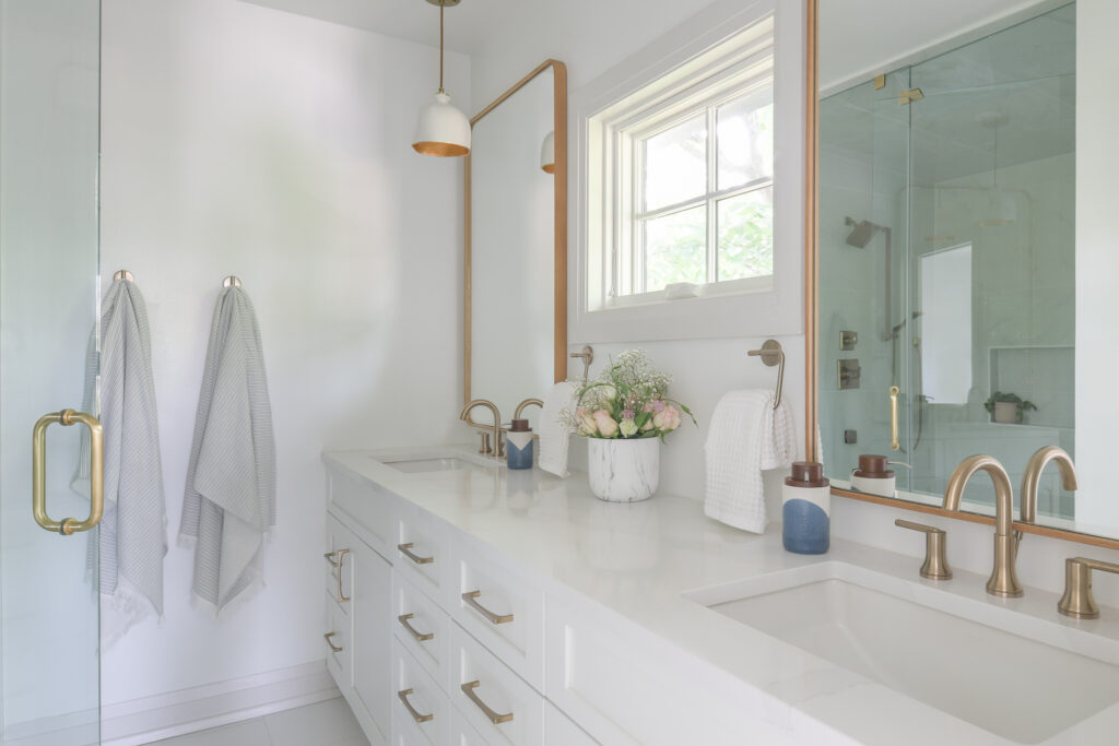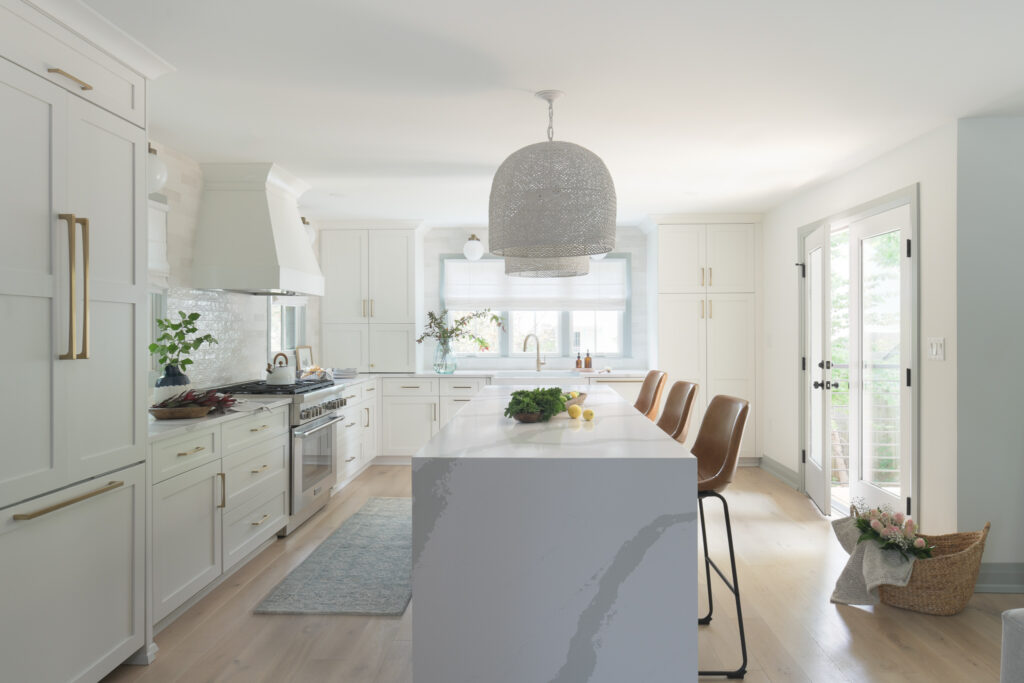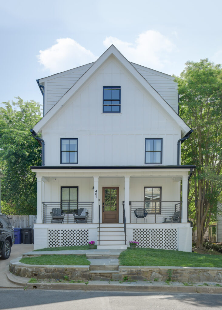 For this home remodel in Arlington, VA, we maintained the original footprint of the single-story home and added a 2nd floor, a 3rd-floor loft, a roof deck, a front porch, and a couple of balconies. The house has more than doubled in space and now boasts four bedrooms, 4.5 baths, an open floor plan, and a mudroom with designer features throughout.
