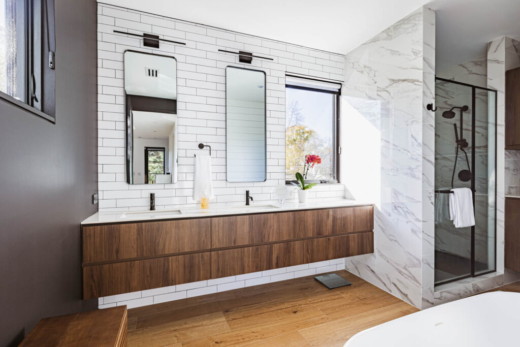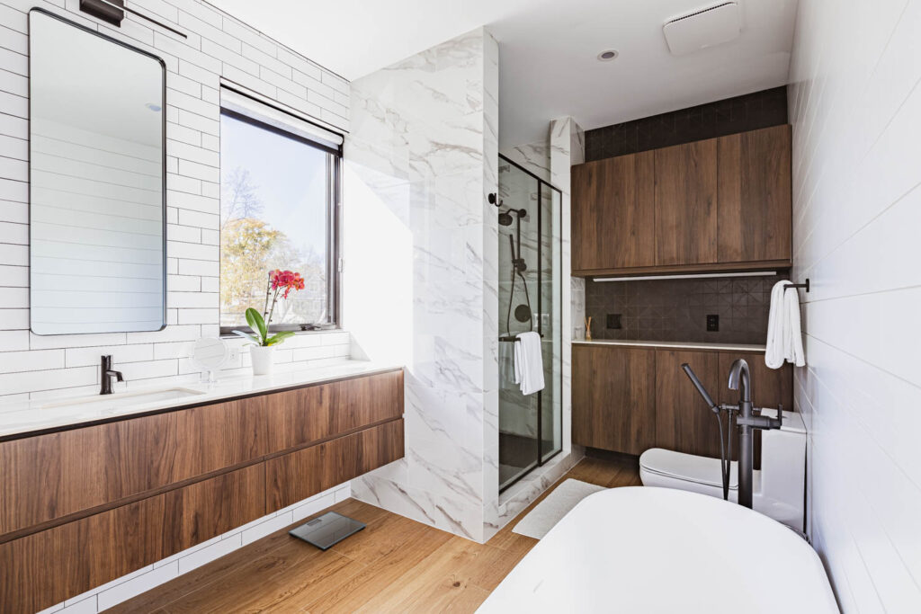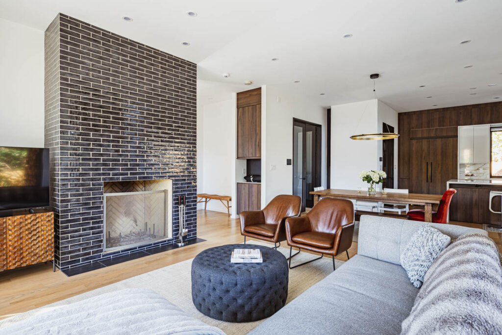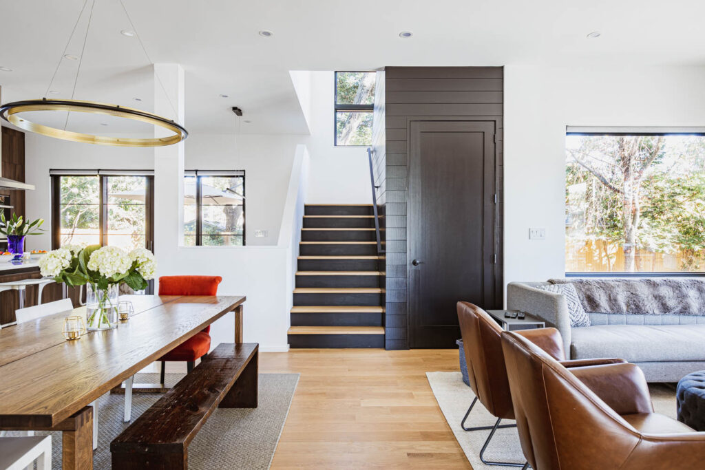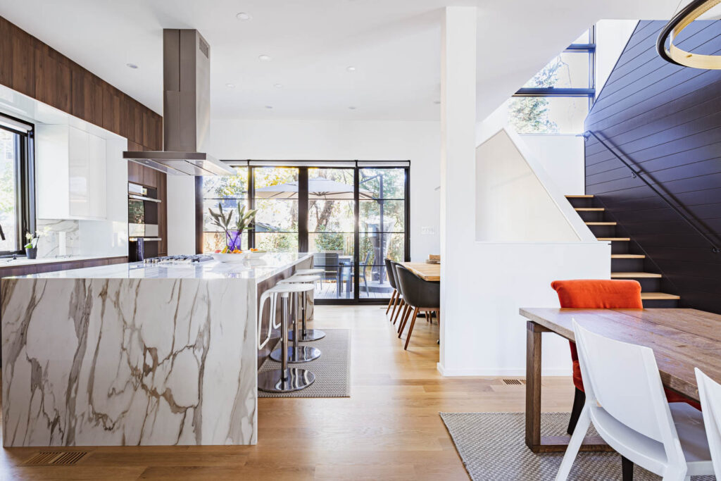 This whole house renovation used the original house footprint. Still, we increased the basement height, raised the ceiling height on the main level, and added large windows throughout to create a modern, comfortable family home.