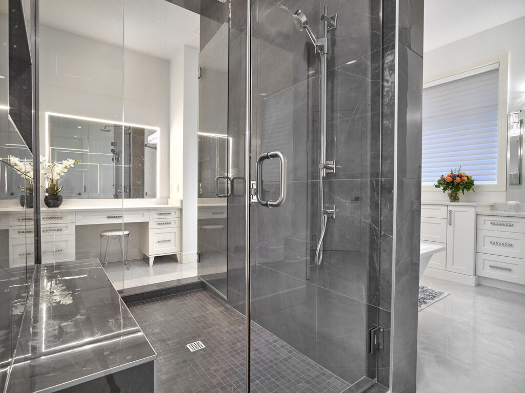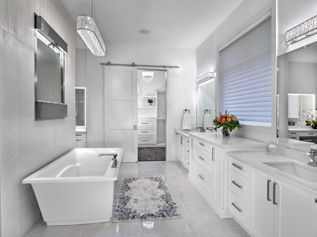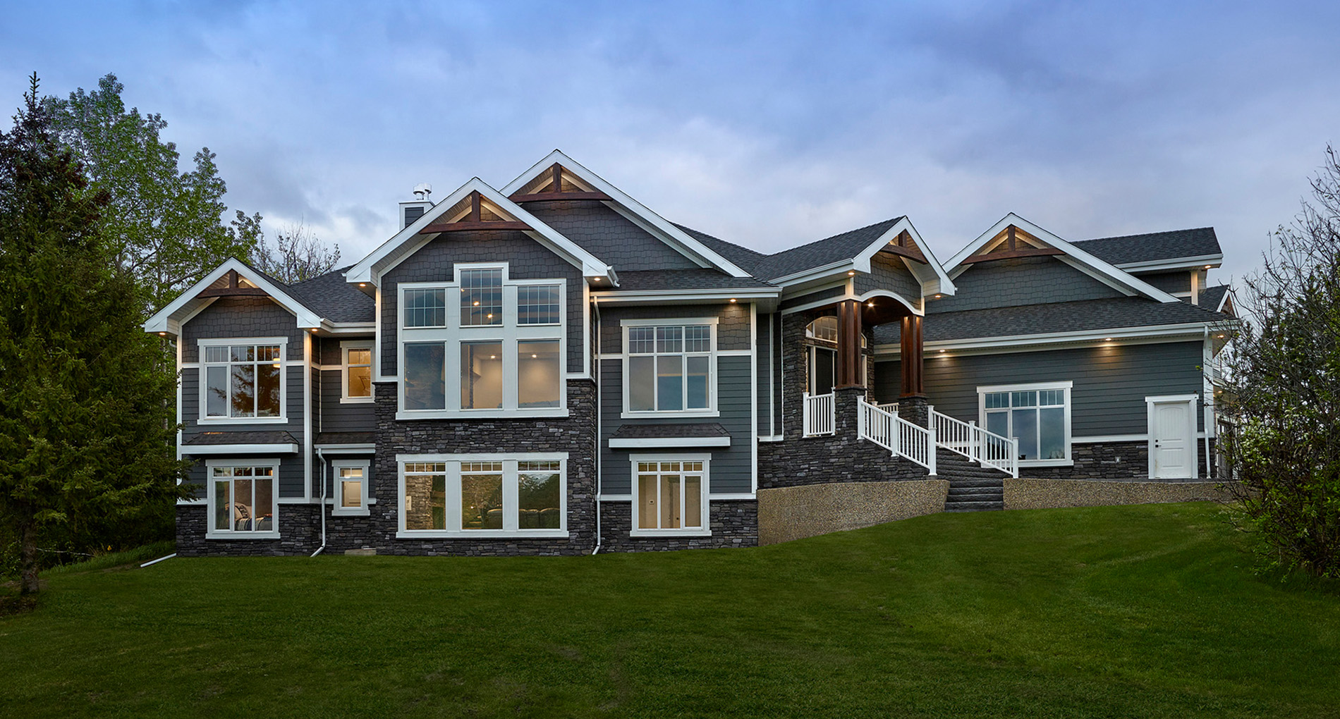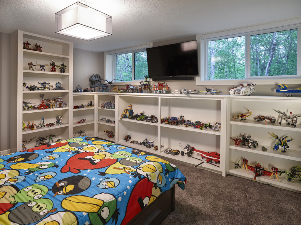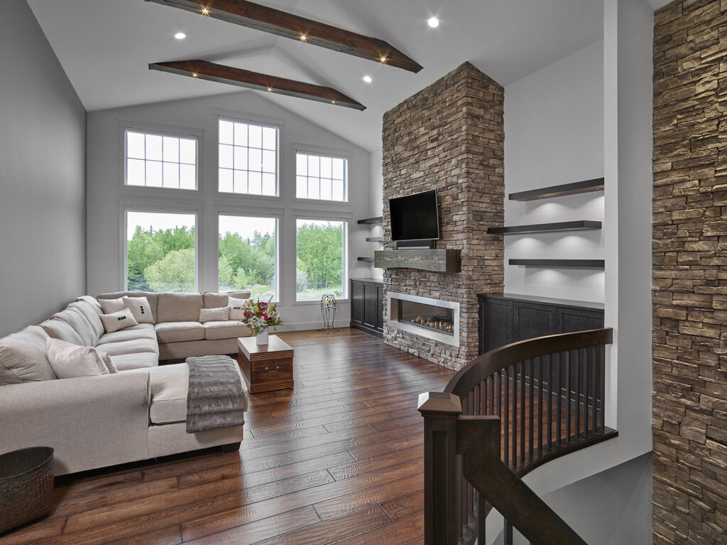 A “great room” was created on the main floor, creating a space big enough for the family to gather, and take full advantage of the beautiful scenery of the acreage. 2 spare bedrooms were added in the basement, as well as a full bar and exercise room, and theatre/gaming room. The garage was extended and 2 more bays added. Ceiling heights were raised to 10’ and 12’ feet inside the house, and the main floor was opened up to allow the natural light to flow through and light up a previously dark interior.