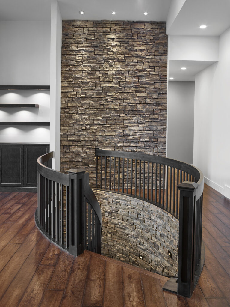 Custom beam work was done on site to add the “rustic” element to many of the rooms, most specifically the bar area. An old wine barrel was used to wrap around a structural post in the basement, continuing the rustic theme and providing a stylish way of covering a necessary structural post.