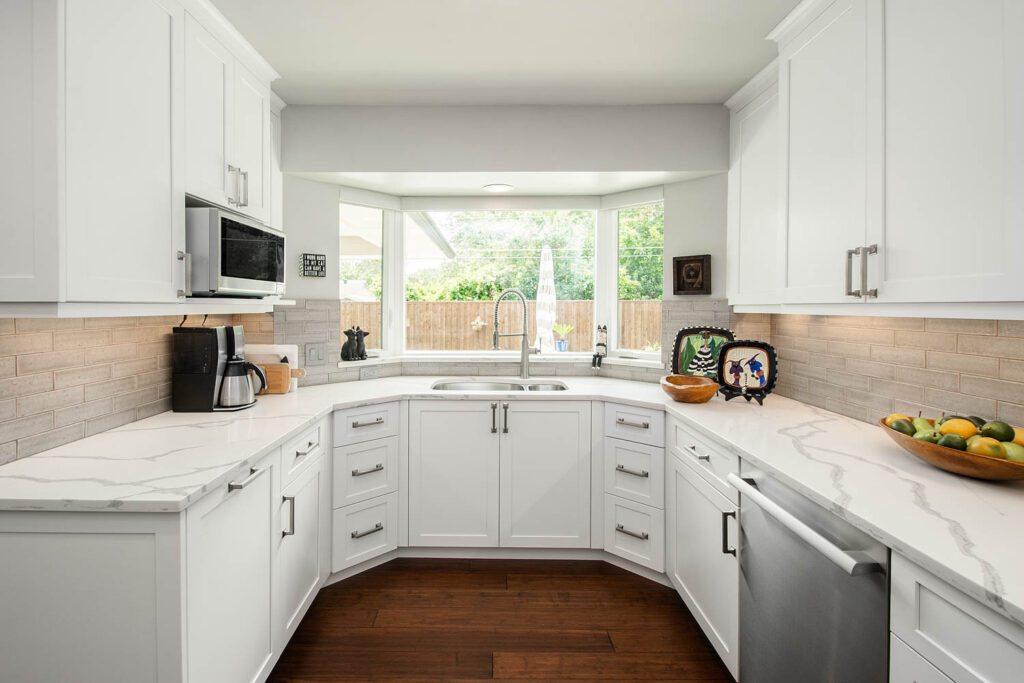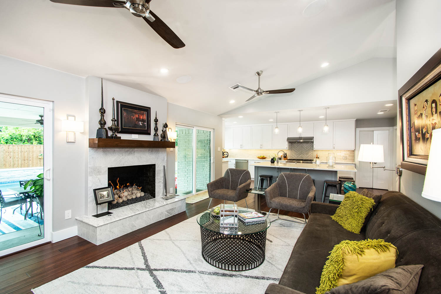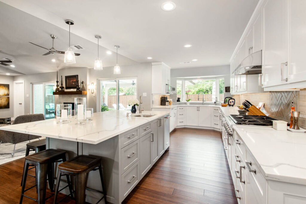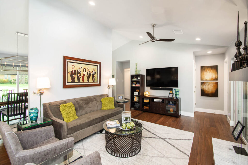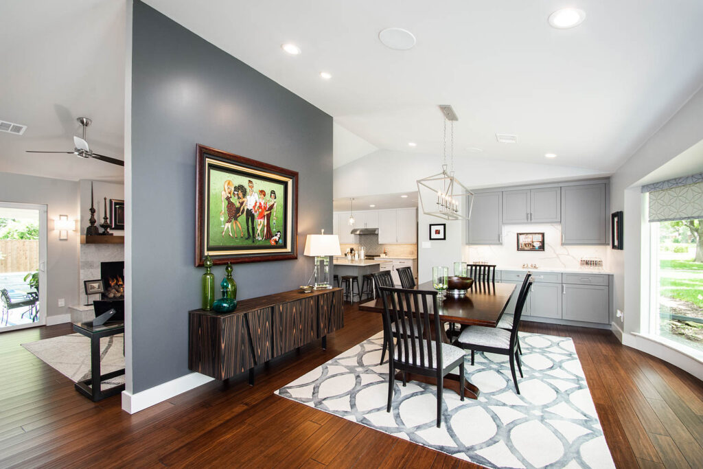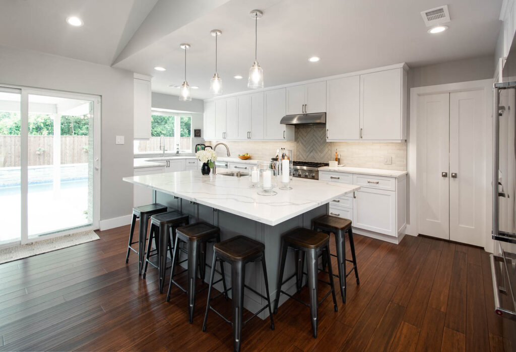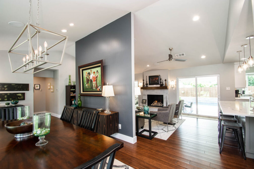 Our clients also wanted to keep some walls for their fun, one-of-a-kind New Orleans artwork. They did not want to be able to see the kitchen from the entryway, and they wanted a bar area built-in somewhere—they just weren’t sure where. Our designers did an amazing job on this project, figuring out where to cut and keep walls, where to replace windows with doors, and how to bring the outdoors in to really brighten up the entire space!
