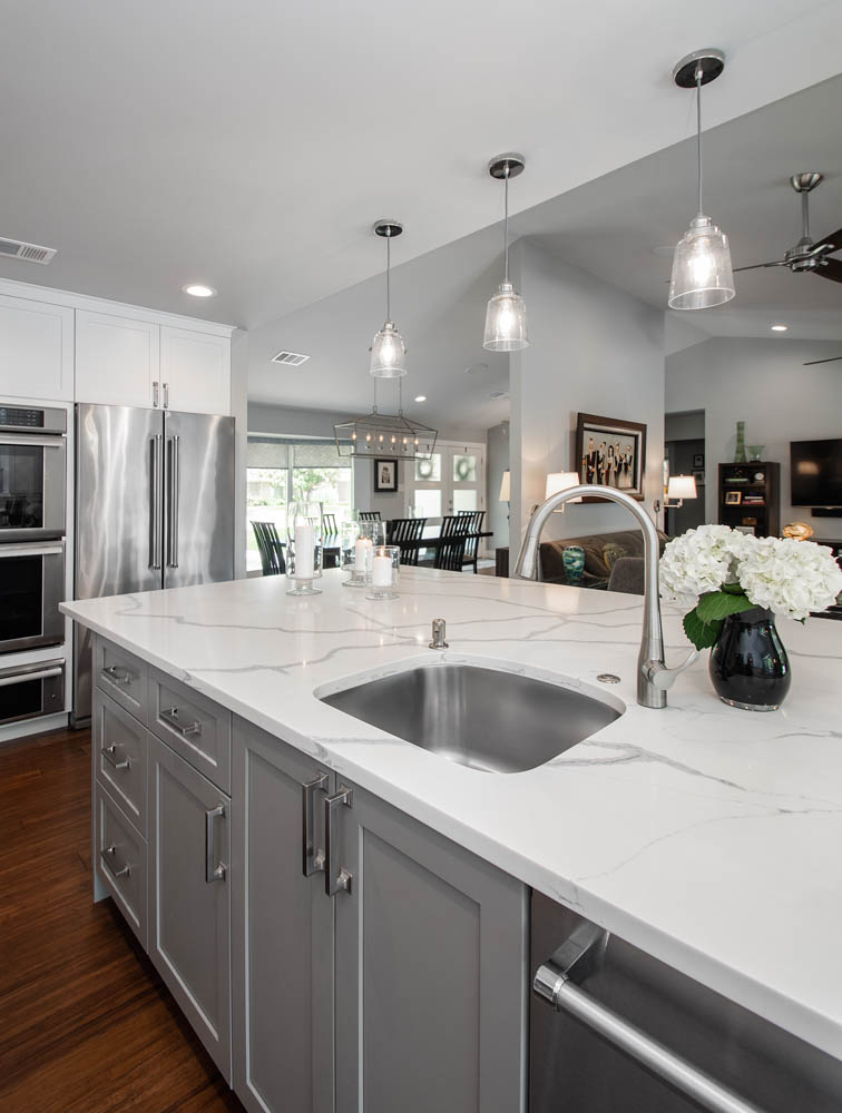 Their original kitchen was small and completely closed off from the rest of the house. They wanted to repurpose the formal living room into the new formal dining room. They also wanted to open up the kitchen to the den and add a large island with seating for casual dining. The original den is now a nice living room open to the kitchen, with a great view of their new pool.