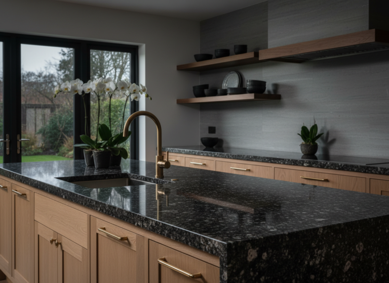 Black Pearl granite is making a strong comeback as homeowners lean into deeper, moodier palettes. Its dark base with subtle flecks of silver and gray adds depth without overwhelming a space.