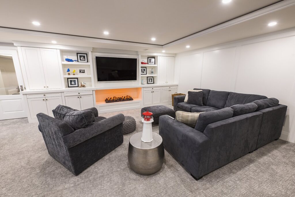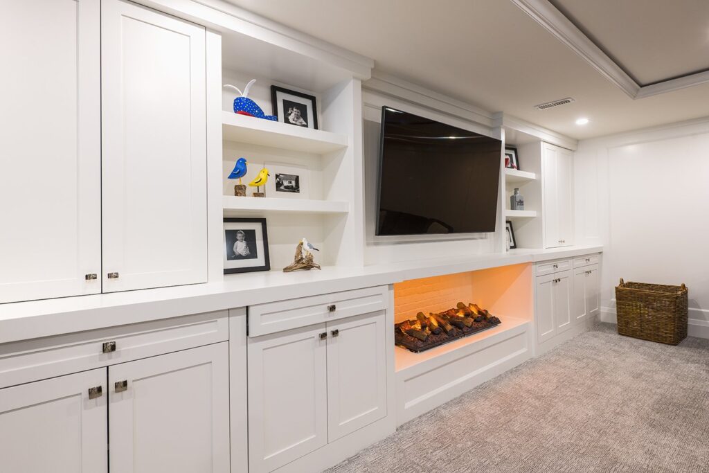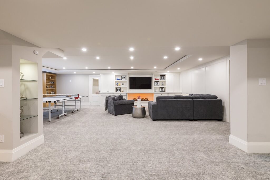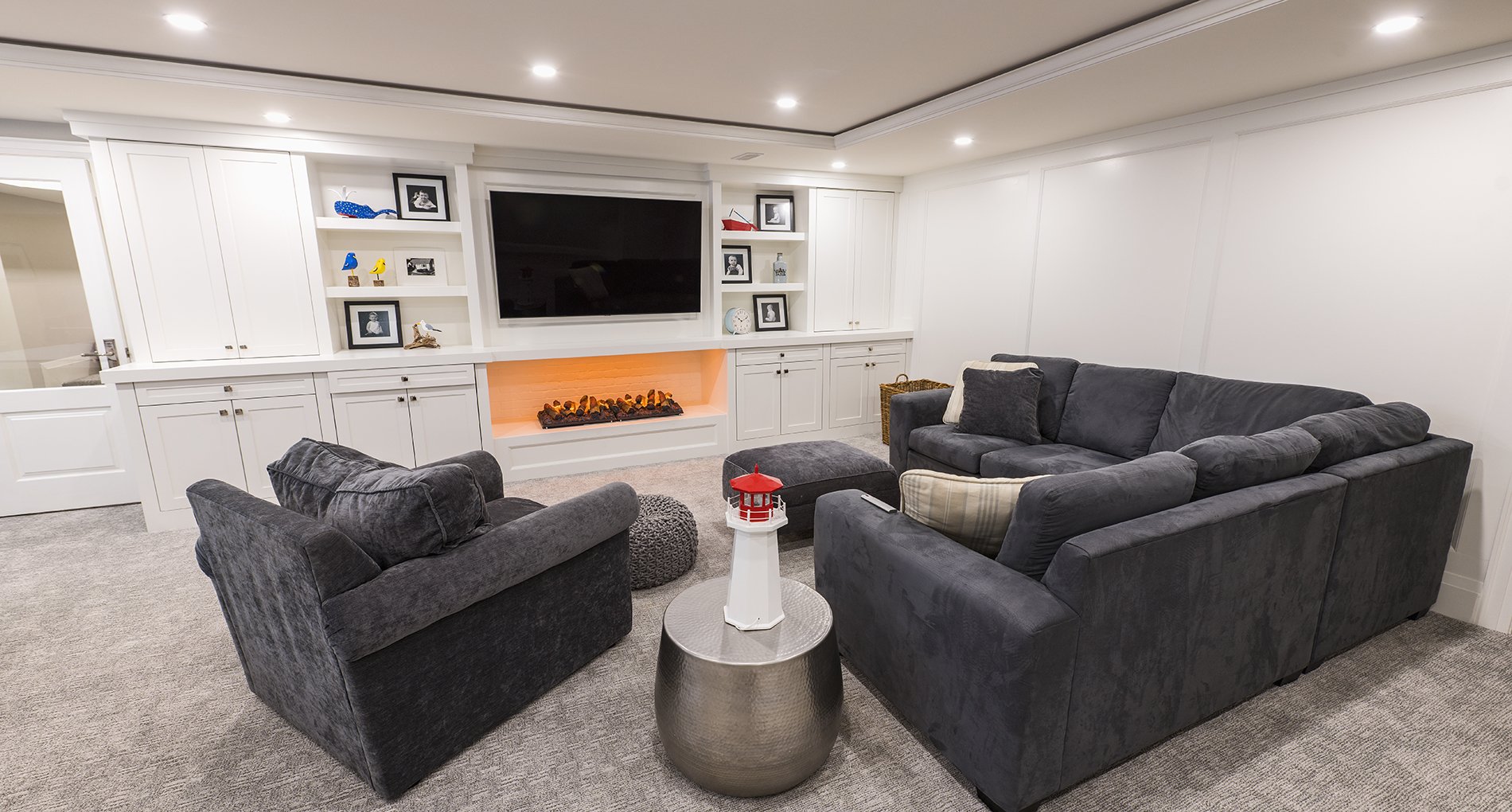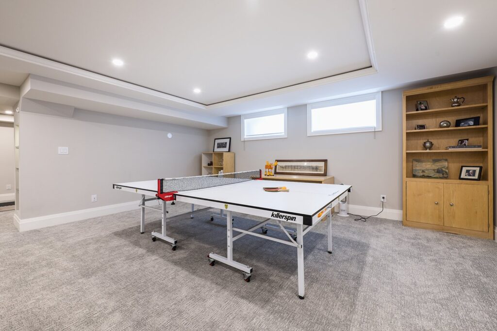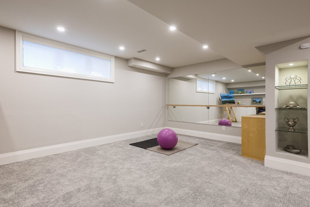 This home renovation features an updated basement including a den with built-in media wall, exercise room, kid’s play area, and a spare bedroom and bathroom. White and cool greys throughout the space with high-end finishes gives this basement a clean, modern look.