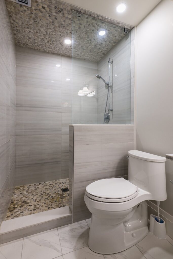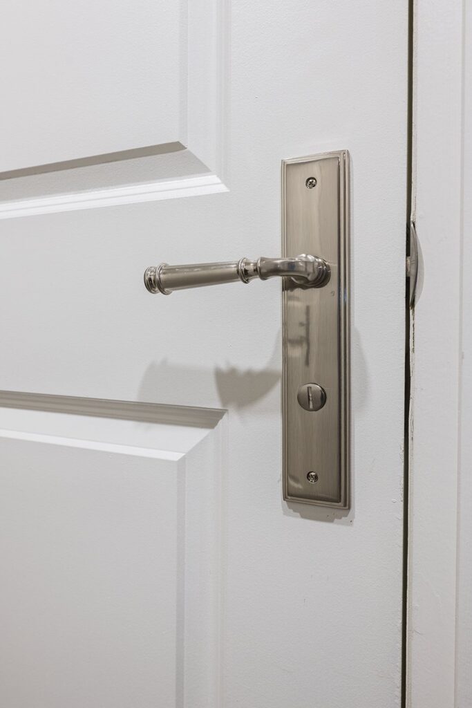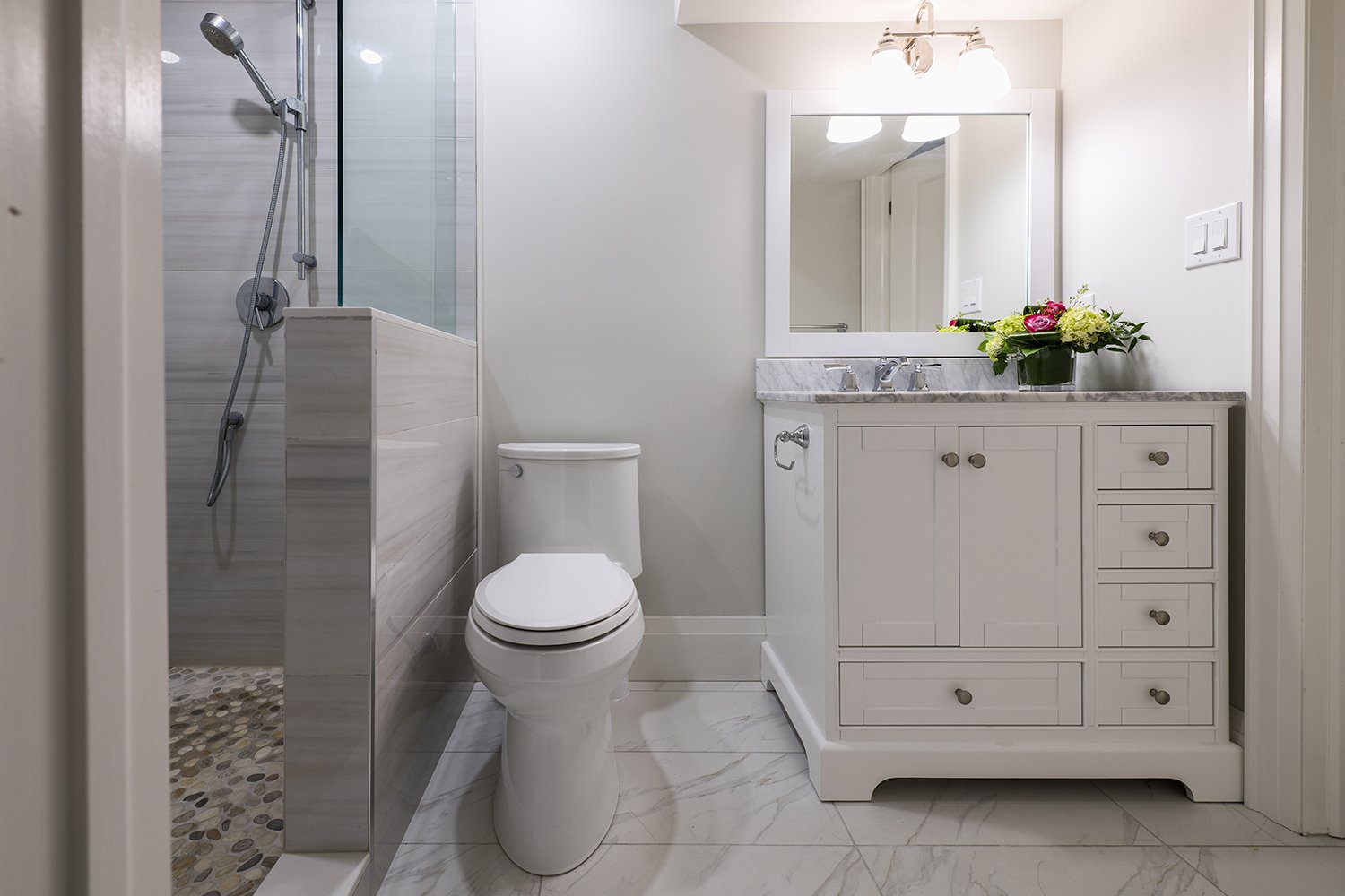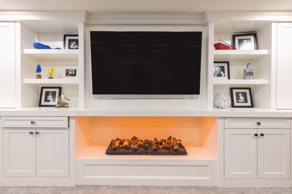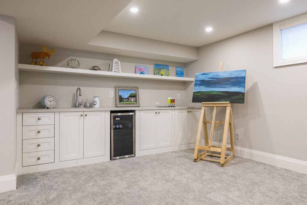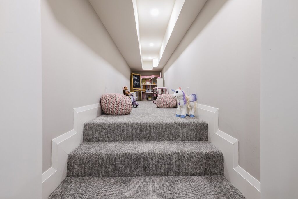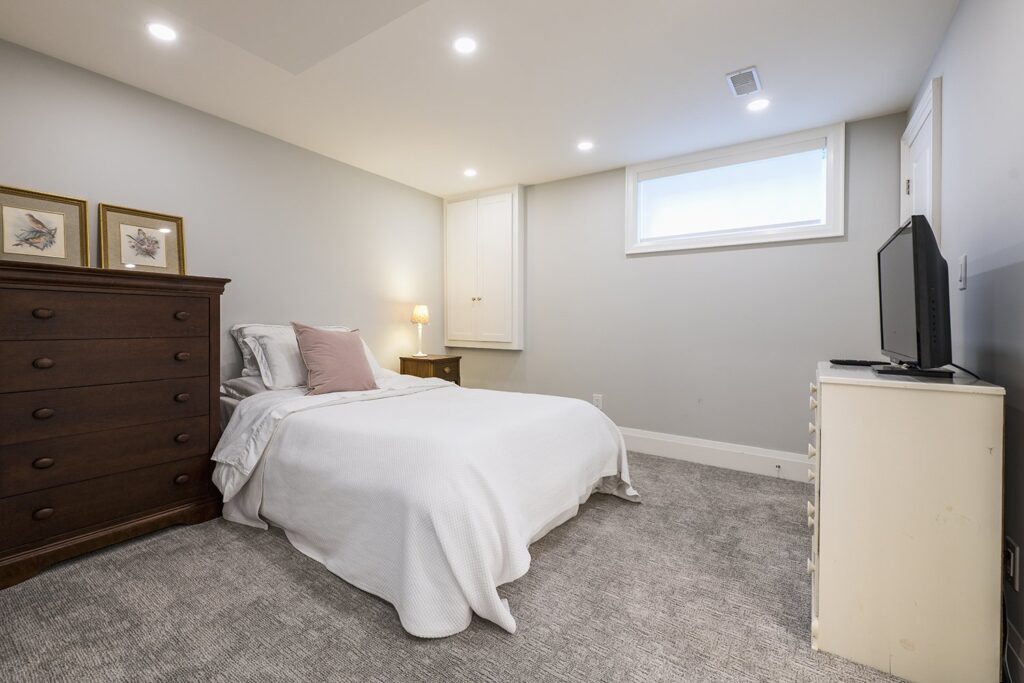 This home renovation features an updated basement including a den with built-in media wall, exercise room, kid’s play area, and a spare bedroom and bathroom. White and cool greys throughout the space with high-end finishes gives this basement a clean, modern look.