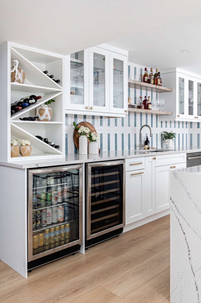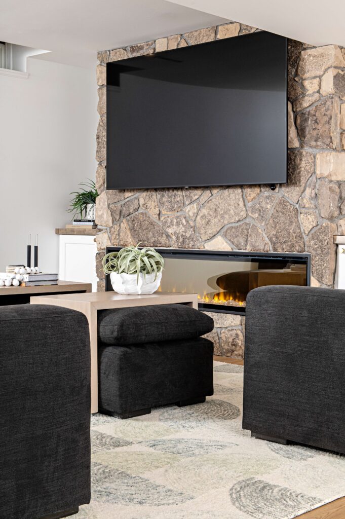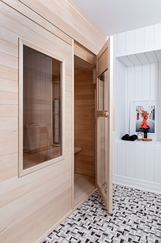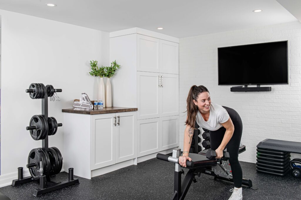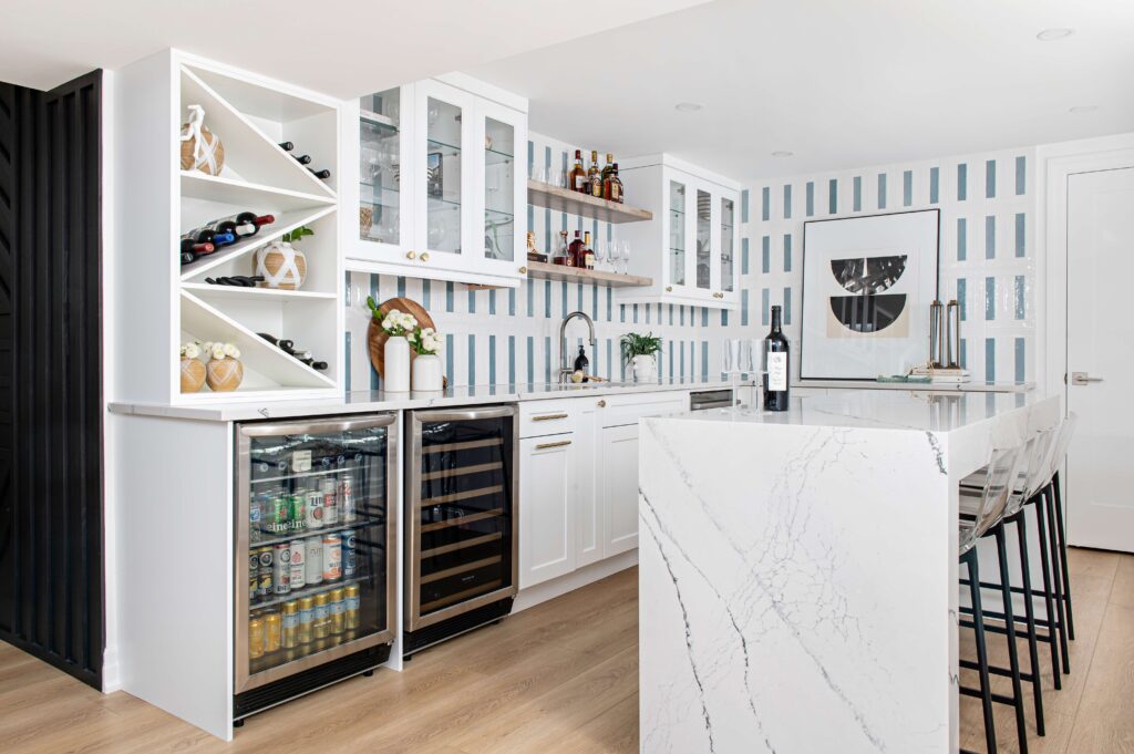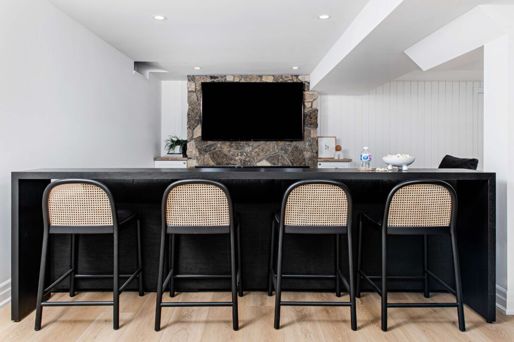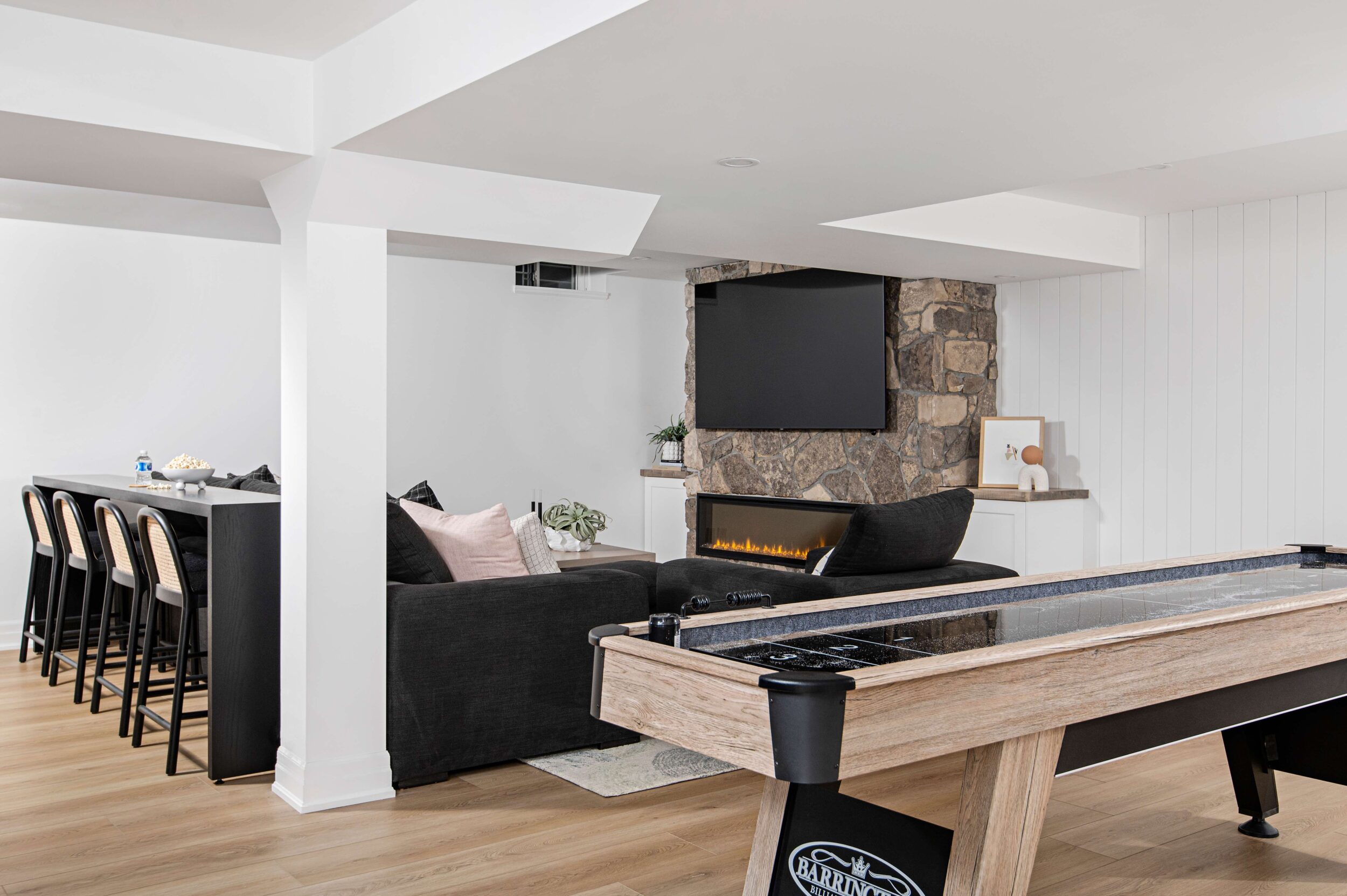 We installed fresh quartz countertops and backsplash in the kitchen and laundry room. And in addition, we decked the lower level out with brand new facilities for our clients to enjoy, including an open-concept family room, an electric fireplace, an at-home gym and sauna, a wet bar area with backsplash and a dishwasher.