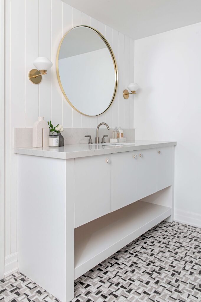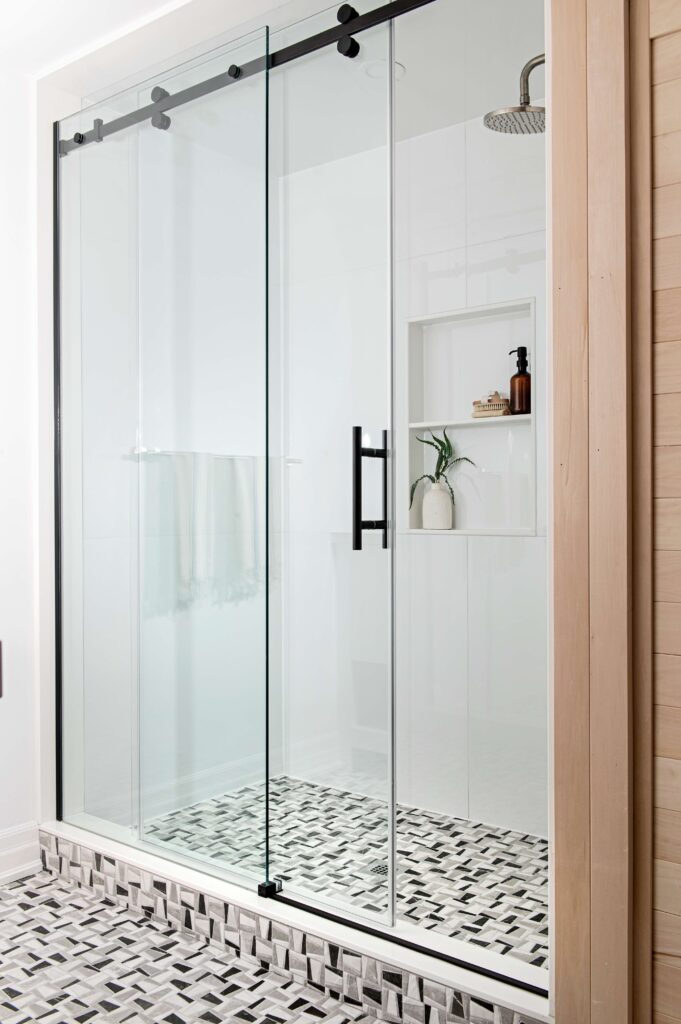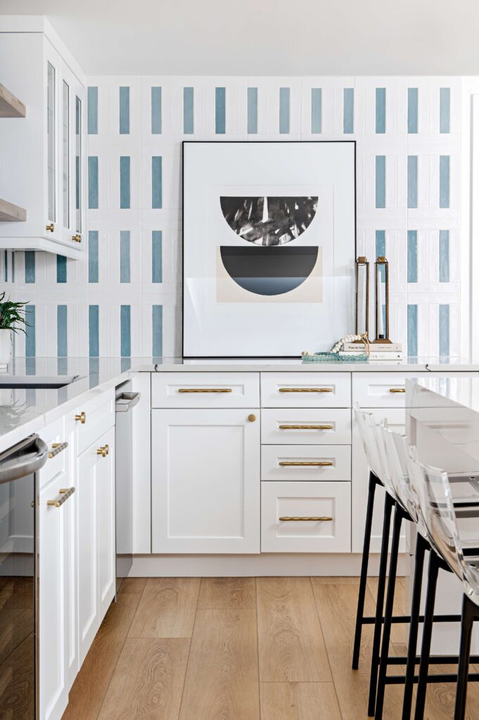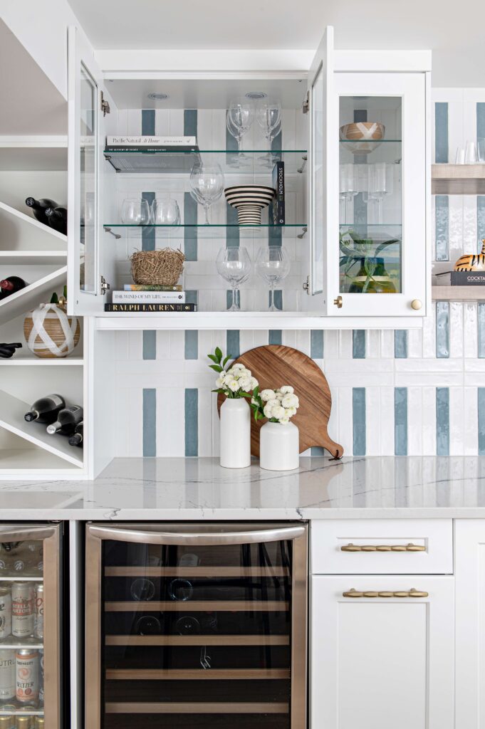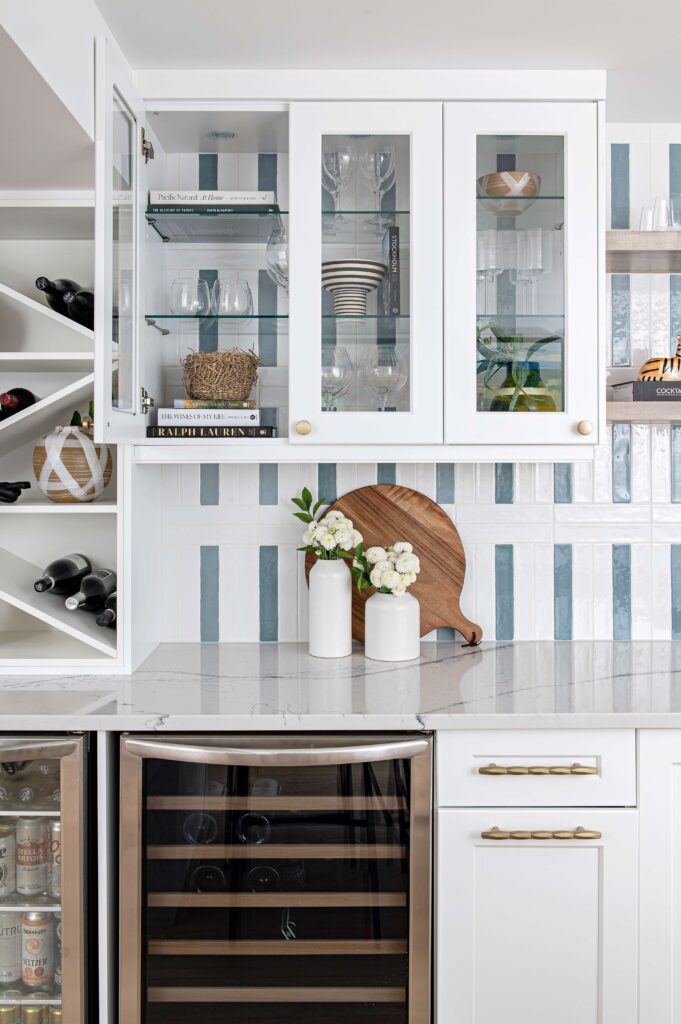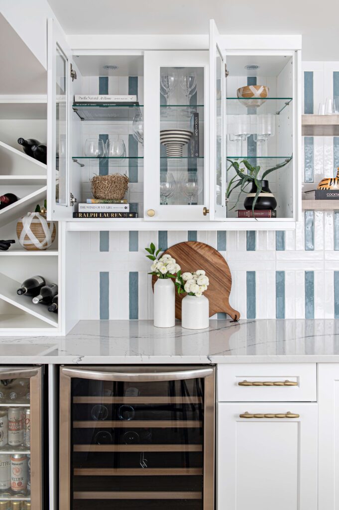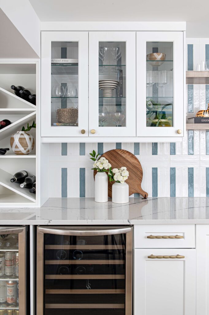 We installed fresh quartz countertops and backsplash in the kitchen and laundry room. And in addition, we decked the lower level out with brand new facilities for our clients to enjoy, including an open-concept family room, an electric fireplace, an at-home gym and sauna, a wet bar area with backsplash and a dishwasher.