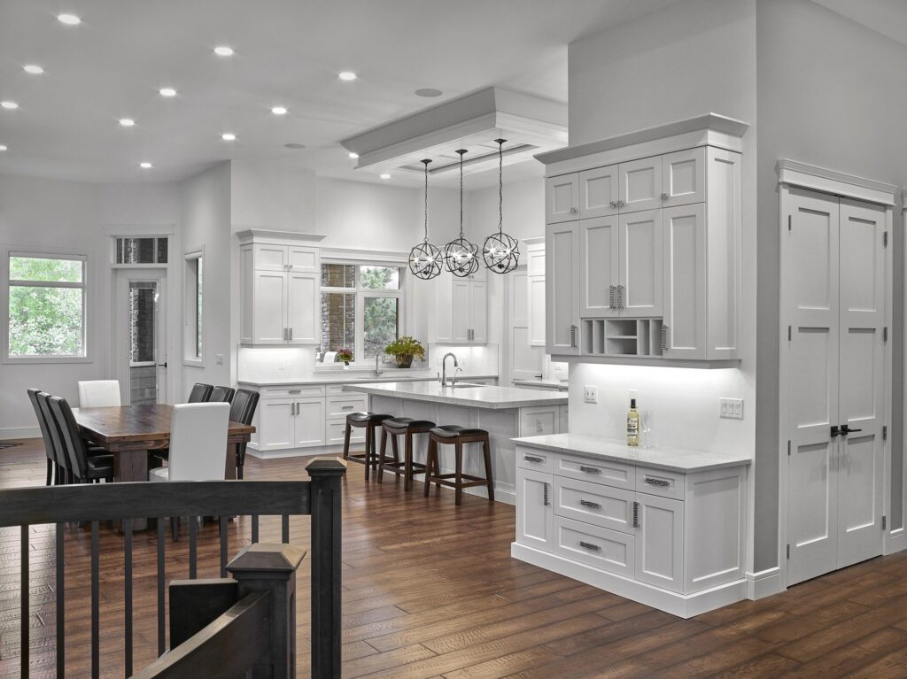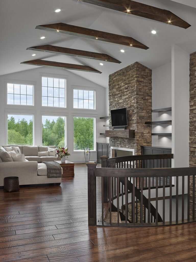 The homeowners wanted to have enough common space so their family of 4 could live comfortably together, with tall ceilings, lots of open space in the kitchen, bright lighting and windows to fully maximize the beautiful acreage setting.