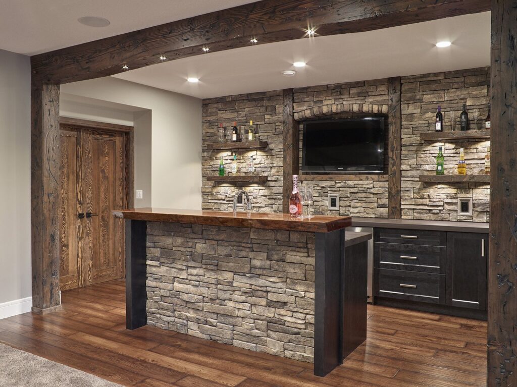 Custom beam work was done on site to add the “rustic” element to many of the rooms, most specifically the bar area. An old wine barrel was used to wrap around a structural post in the basement, continuing the rustic theme and providing a stylish way of covering a necessary structural post.