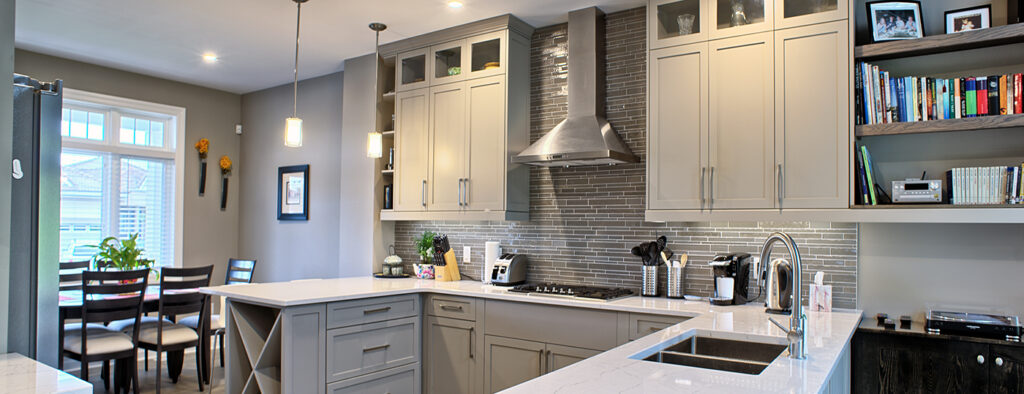 This custom home features an open-concept great room; joining the kitchen, dining, and living room together for a bright and open feel. The light greys and whites, coupled with glass tile backsplash in the kitchen, and other high-end finishes, brings together this modern design.
