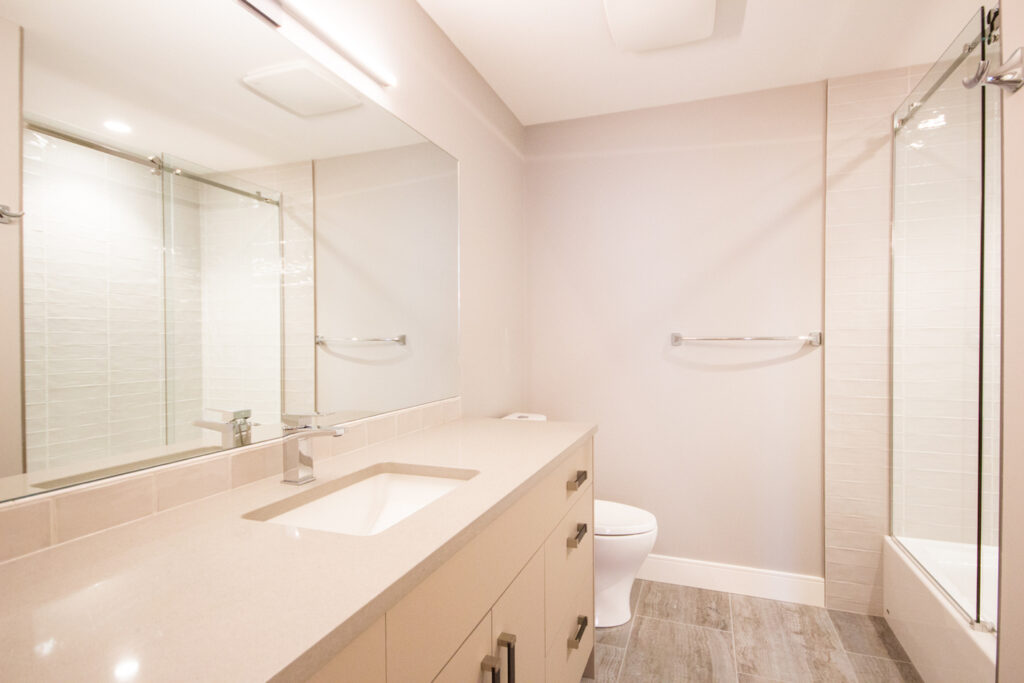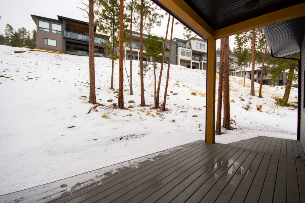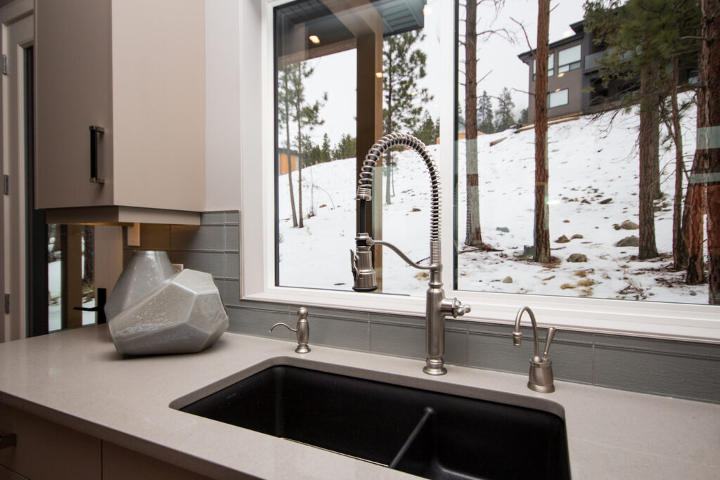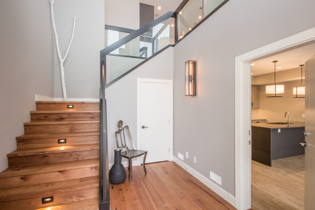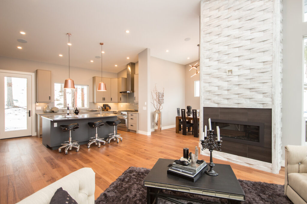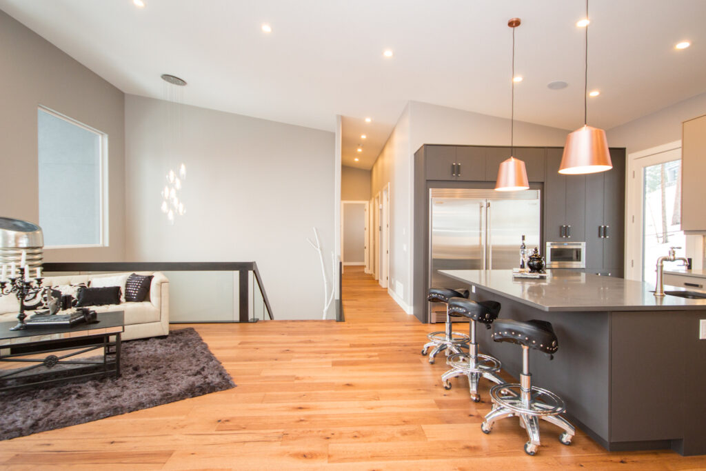 An unique modern custom home featuring an open concept main floor, modern kitchen, large windows, hardwood floors, and high-end finishes. The kitchen has an island with unique bar stool seating and rose gold pendant lights.