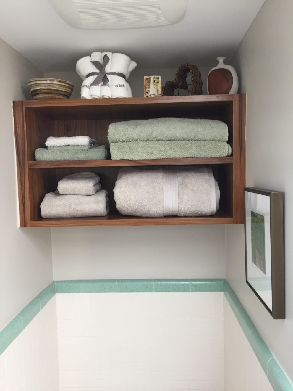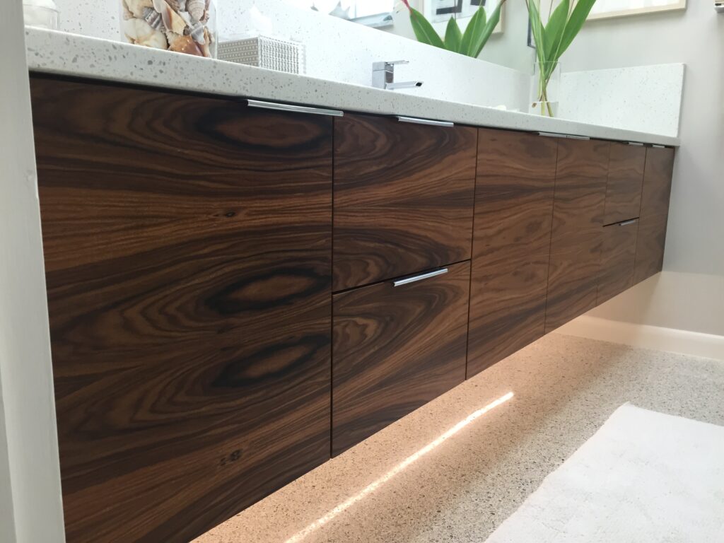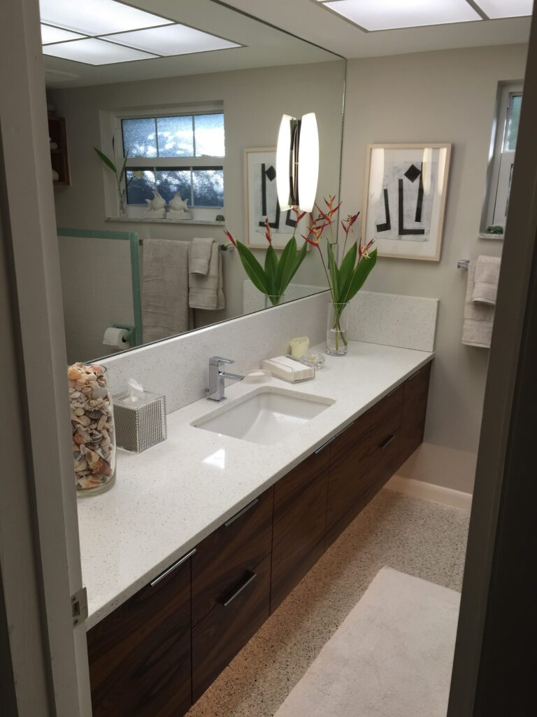 A modern update for a mid-century bathroom with new fixtures, countertops, and under cabinet lighting.