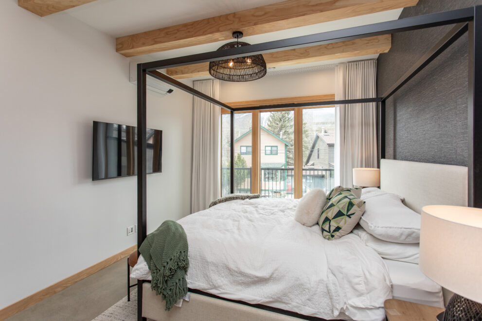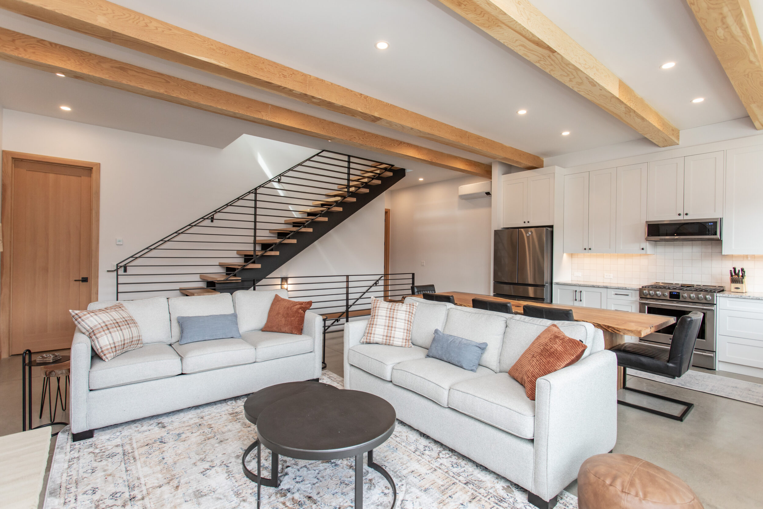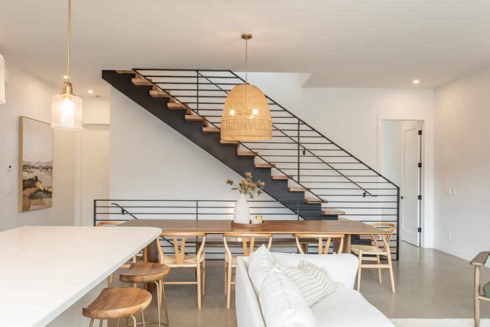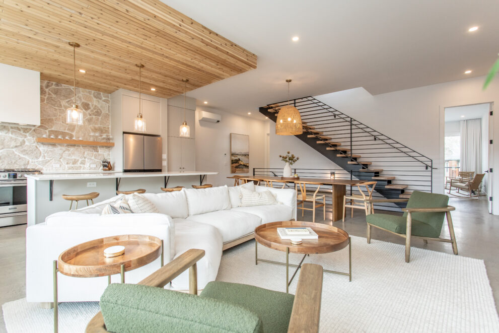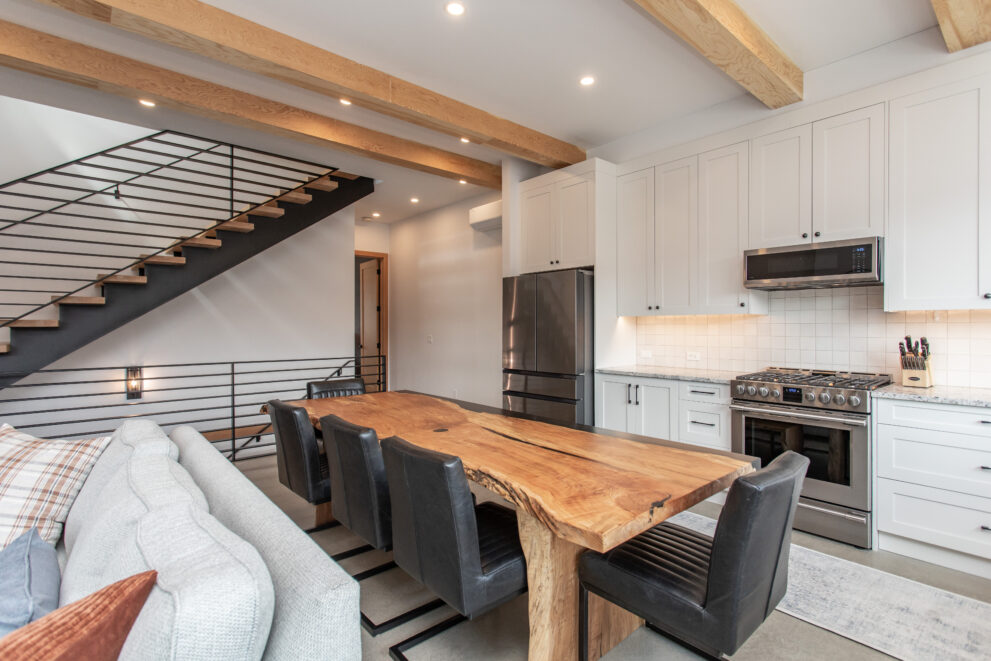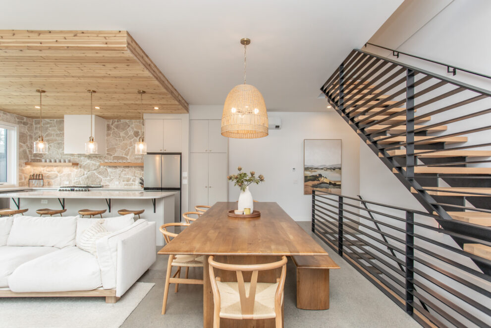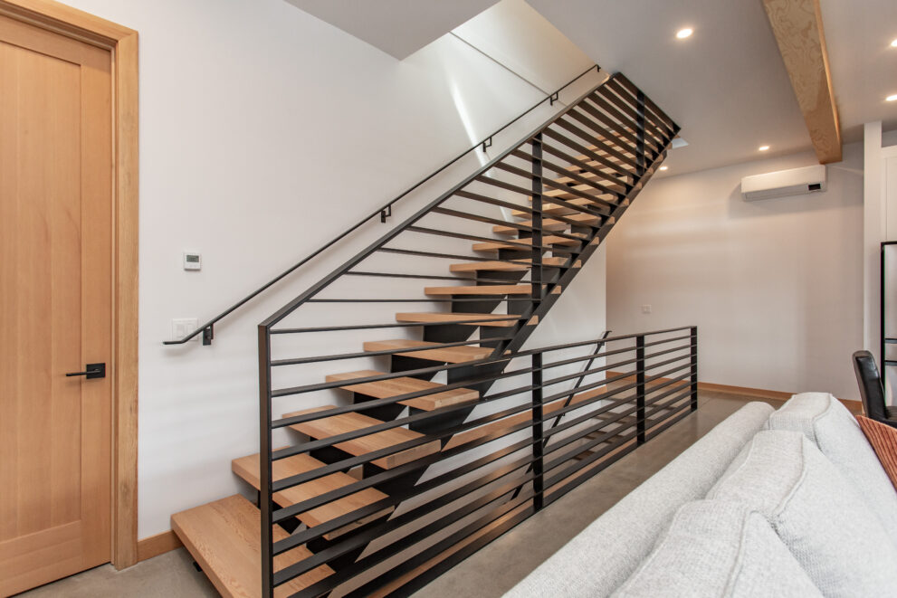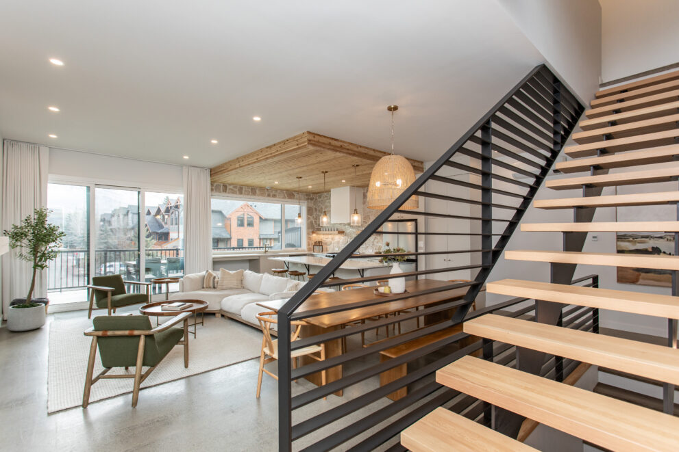 Natural stone and timber elements define both the interior and exterior, creating warmth and architectural continuity rooted in the mountain setting. A feature staircase with open risers and custom-fabricated metal stringers anchors each home, adding a bold yet refined design statement.