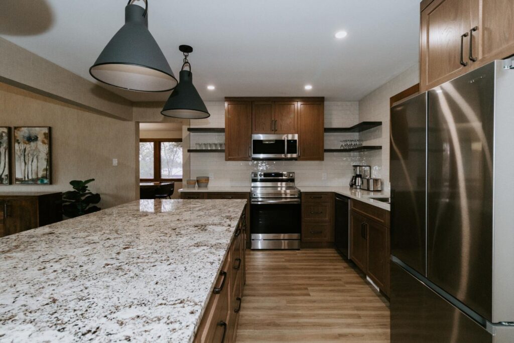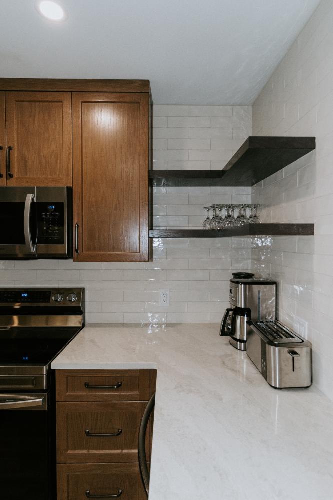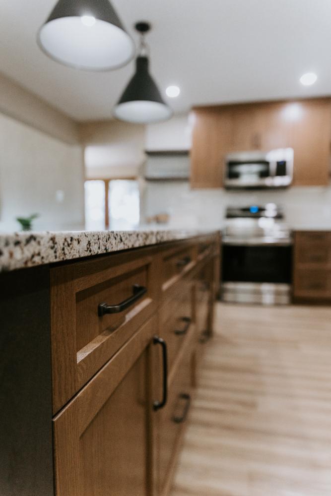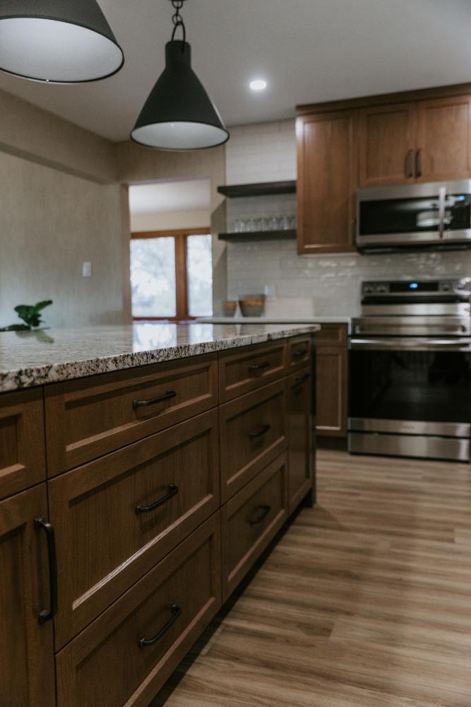 Our team embraced a rustic modern design style for this project, delivering a complete facelift of all interior spaces. The renovation included an updated kitchen, new flooring, refreshed wallpaper, modernized bathrooms, beautiful tile work, and fresh paint throughout.