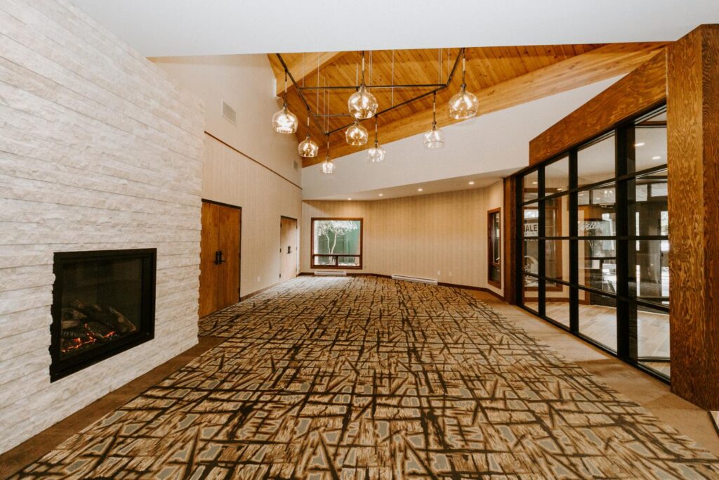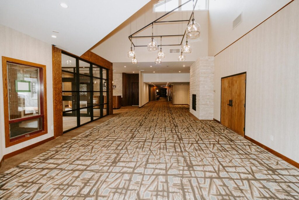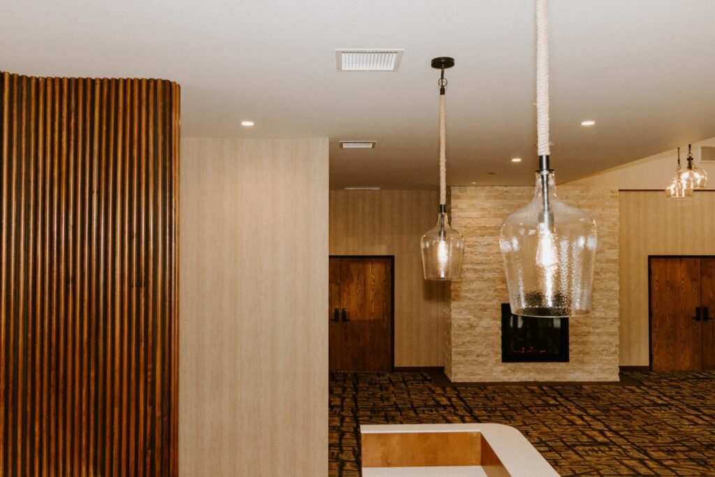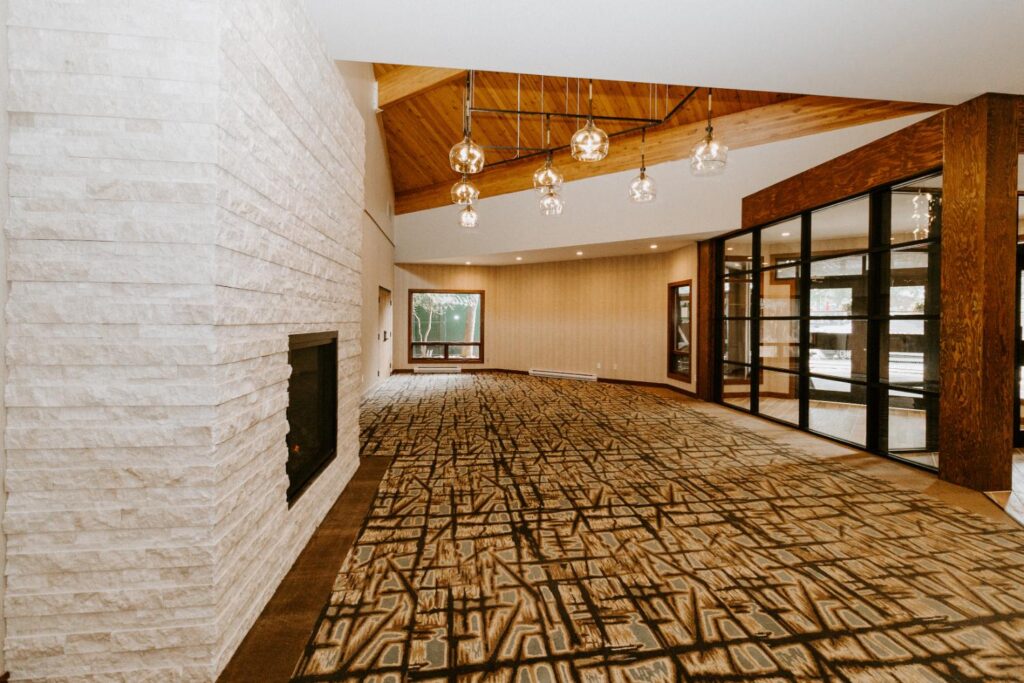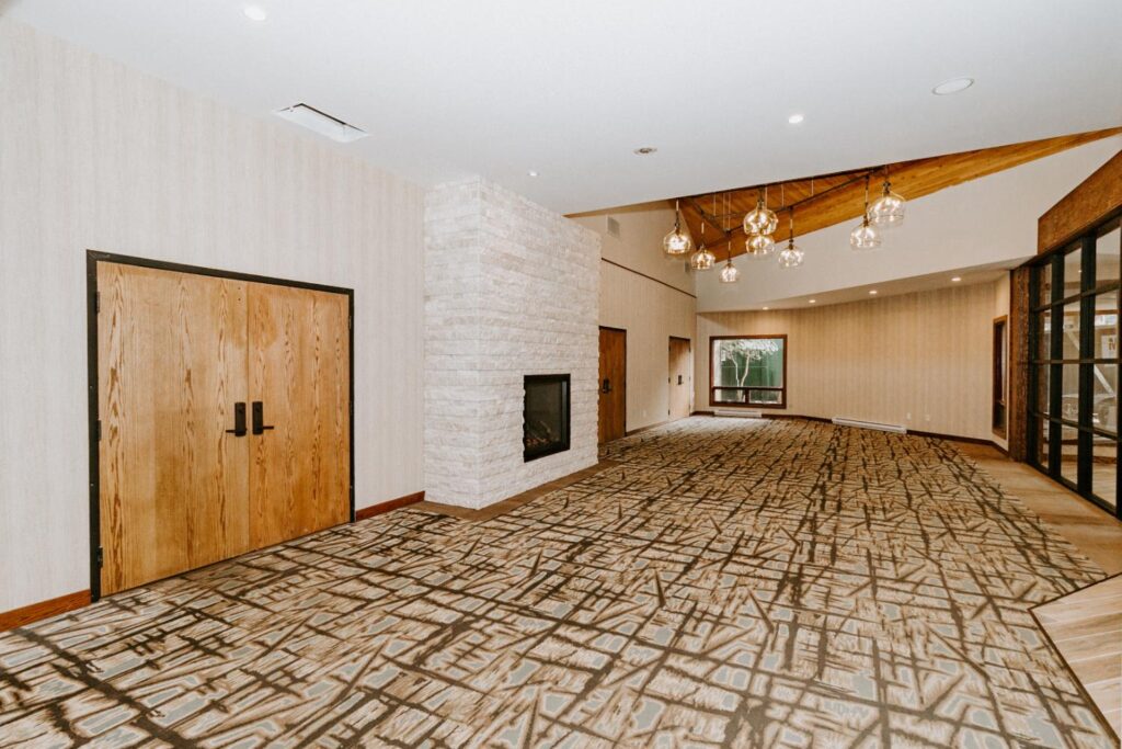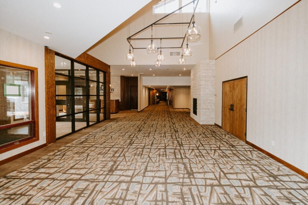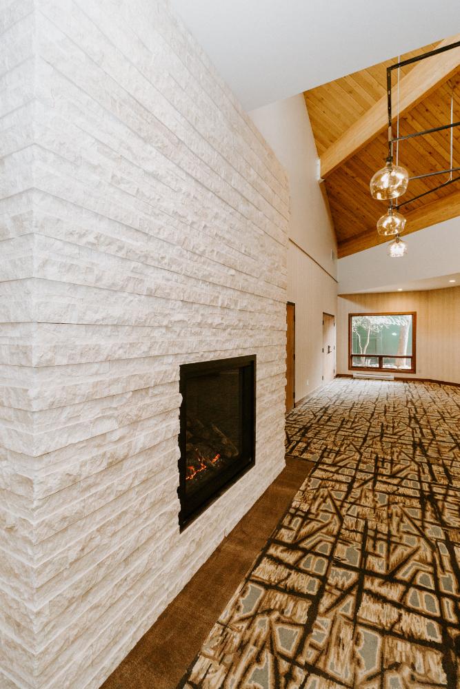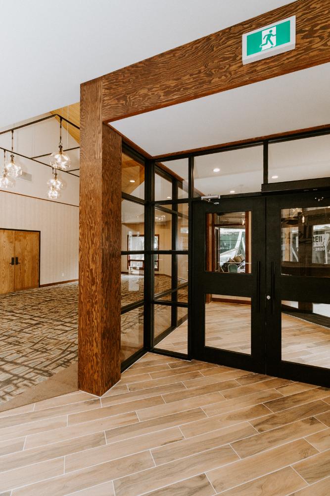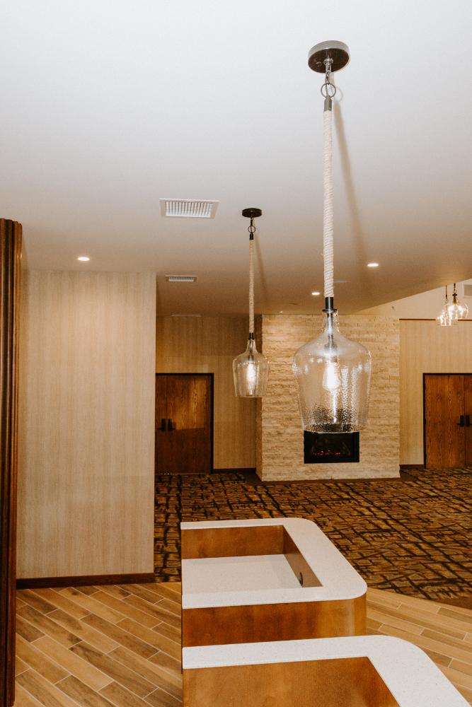 The upgrades included new entry and glass systems, a new fireplace, and a feature check-in reception area. Additionally, we reconfigured the copier room and office, along with upgrading the lighting and wall coverings, to complete the transformation.