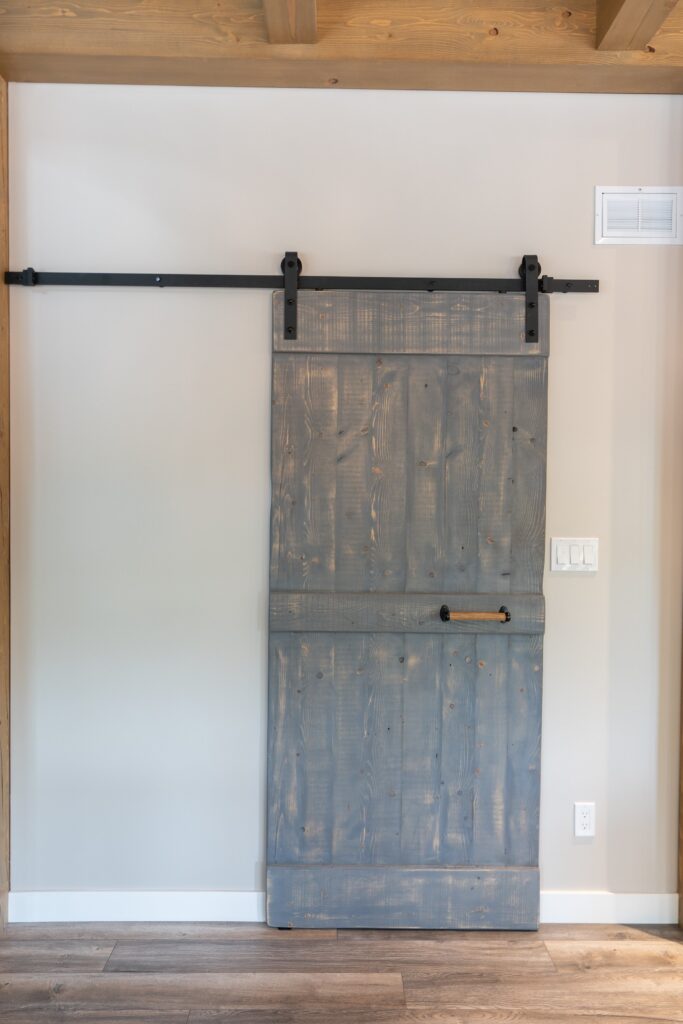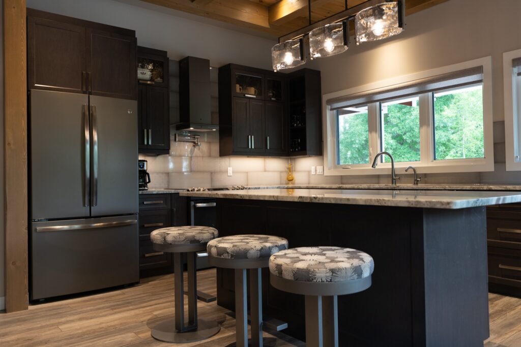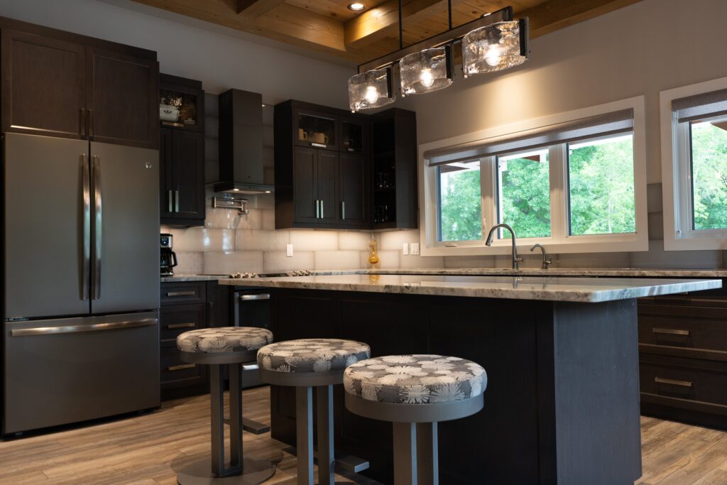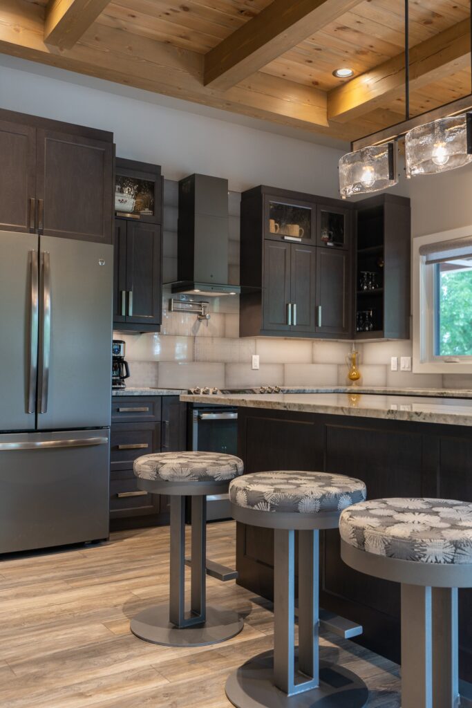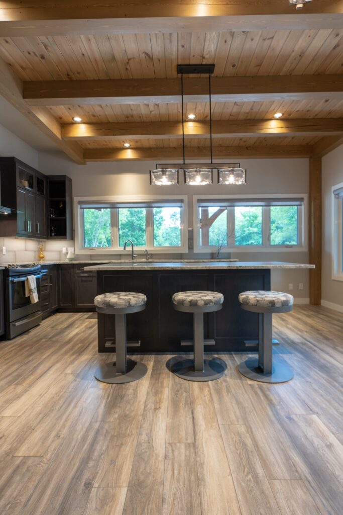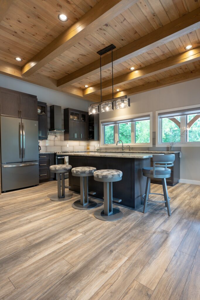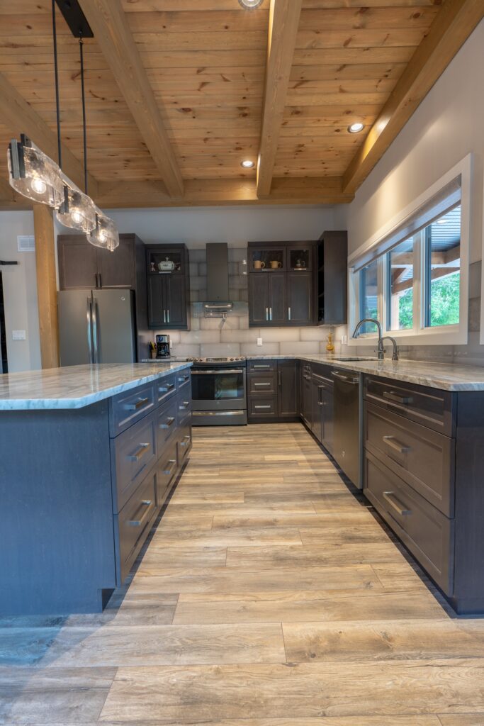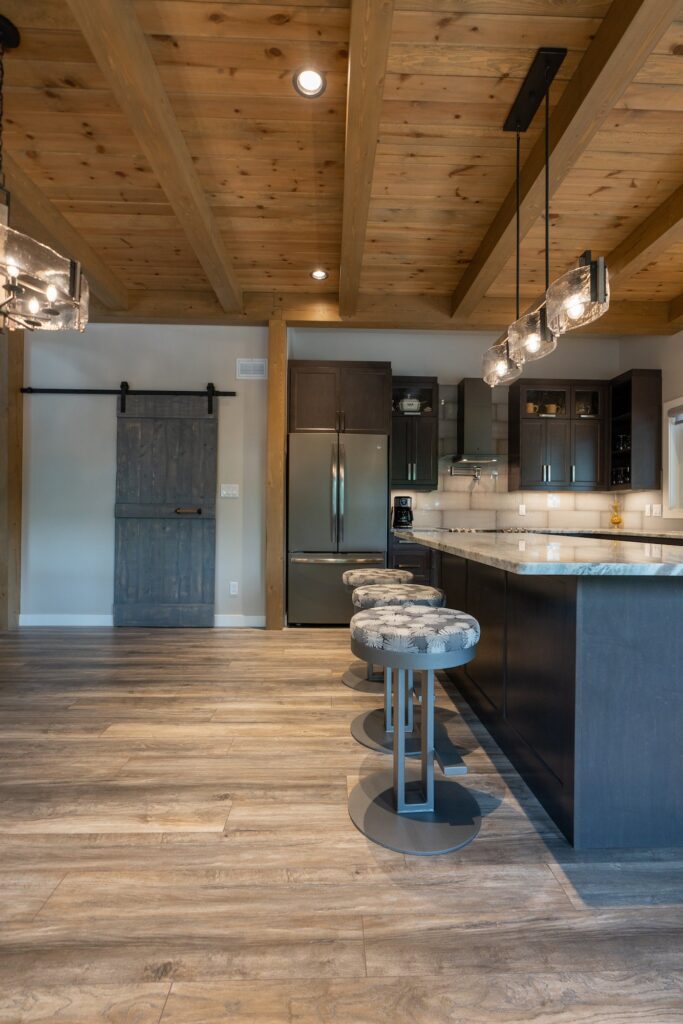 A modern rustic custom home build featuring an open concept living space with a spacious kitchen, living and family room on the main floor.