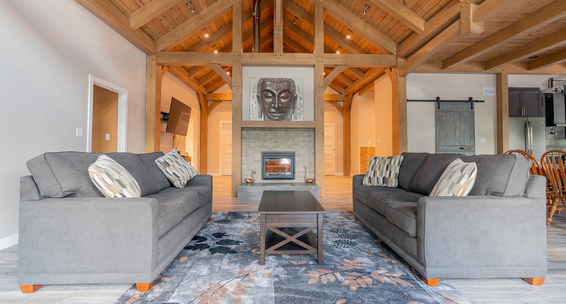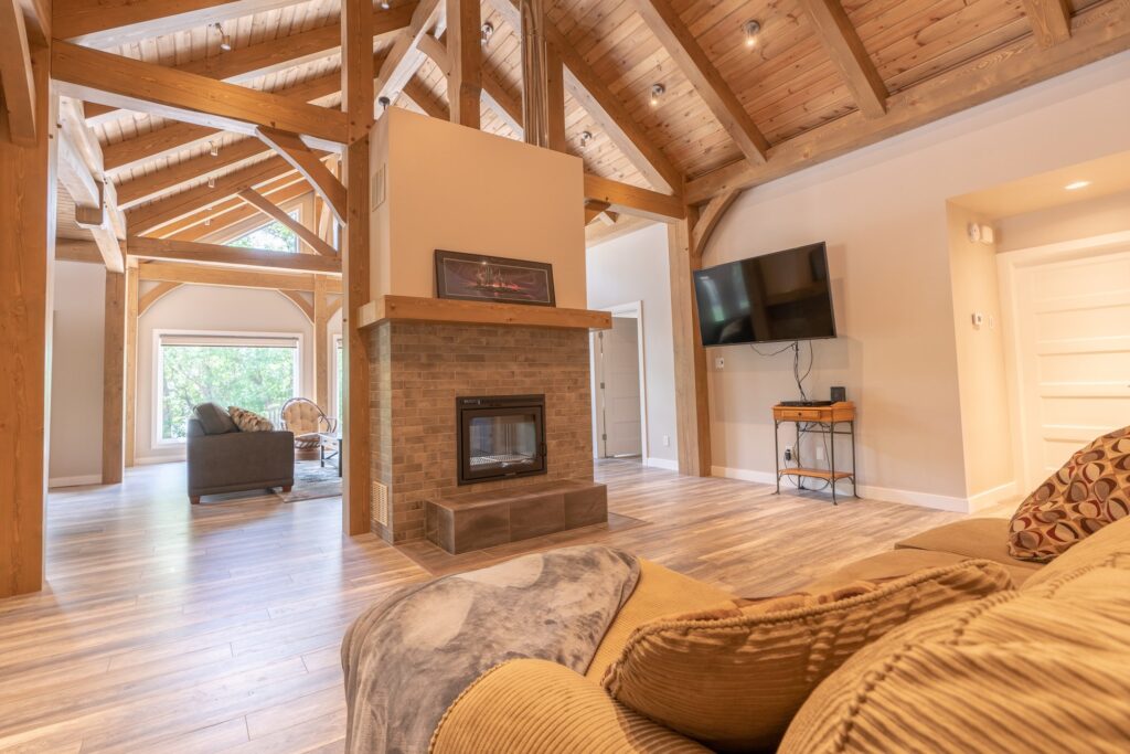 Hardwood floors and exposed wooden beams give the home a rustic feel, which is contrasted by the more modern appliances and finishes in the kitchen.