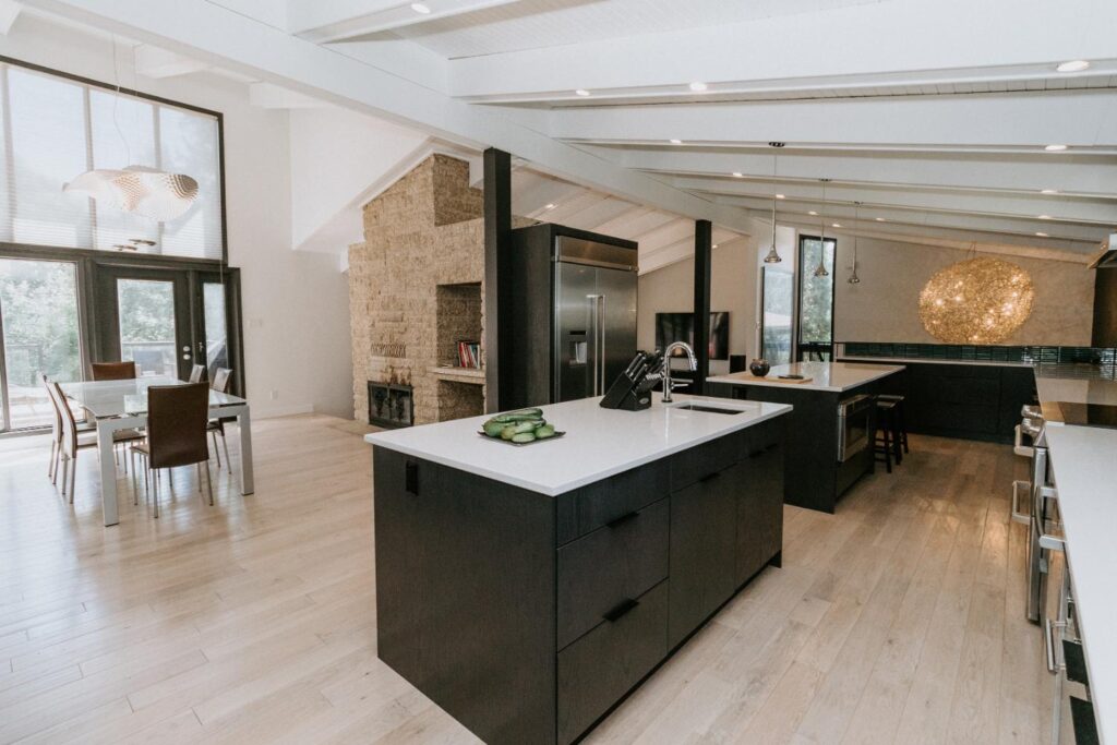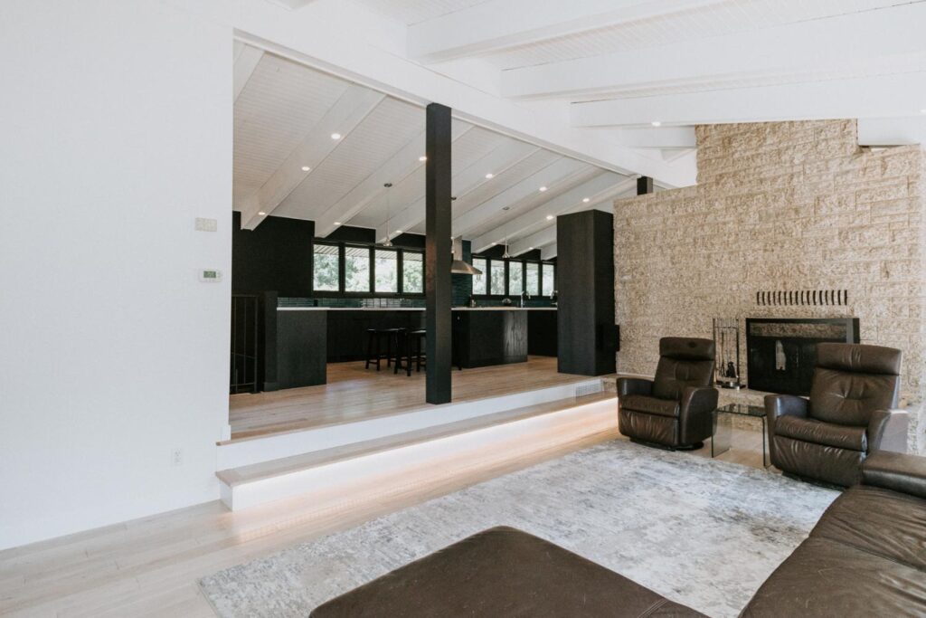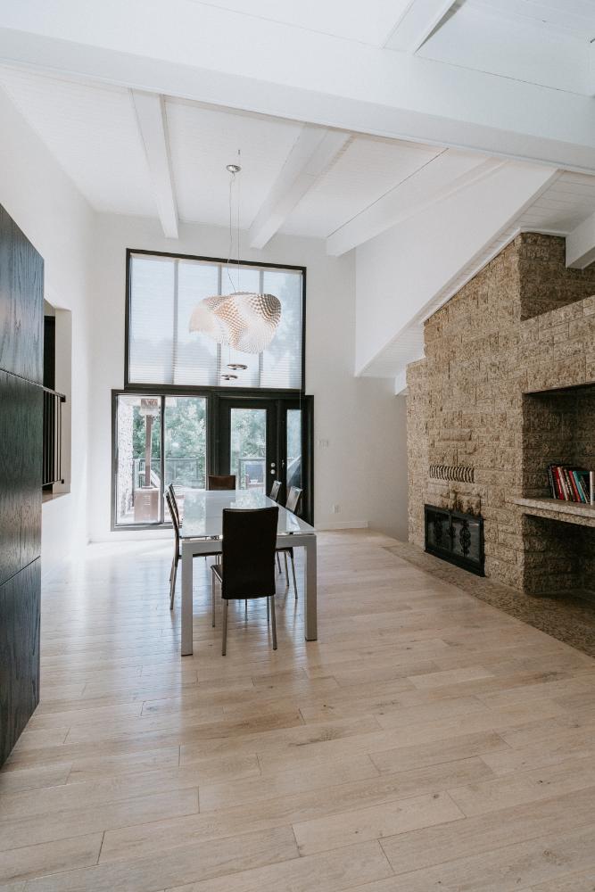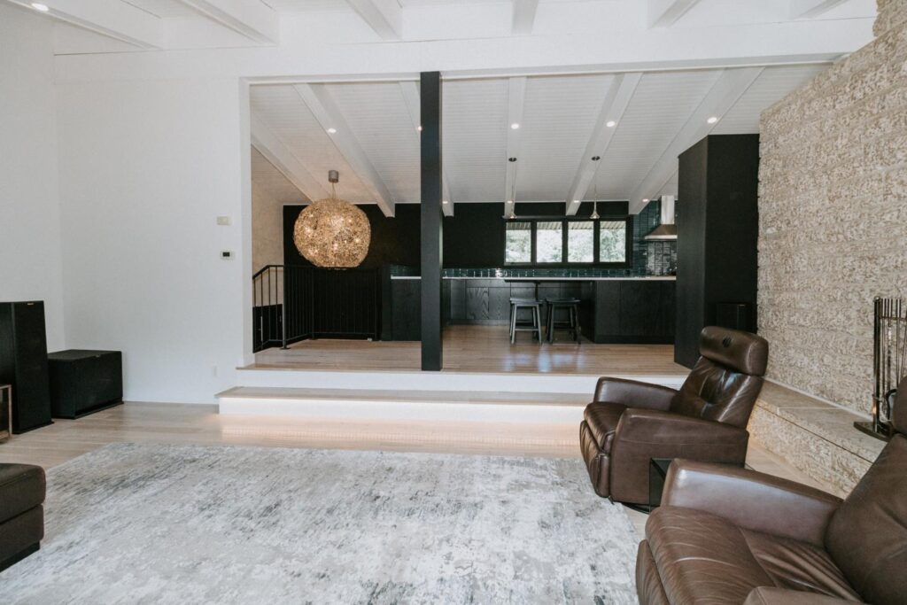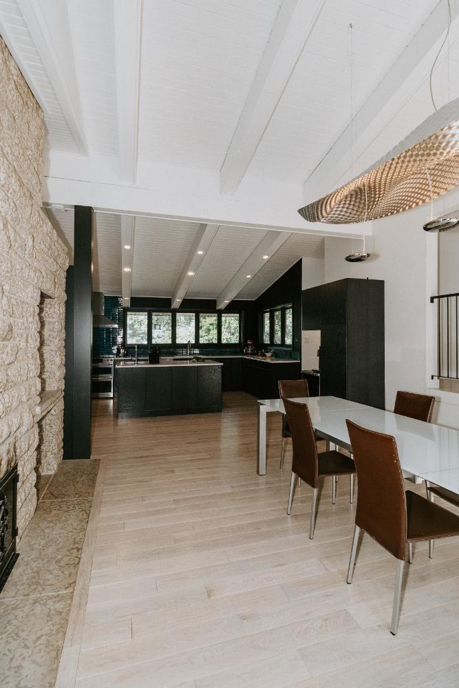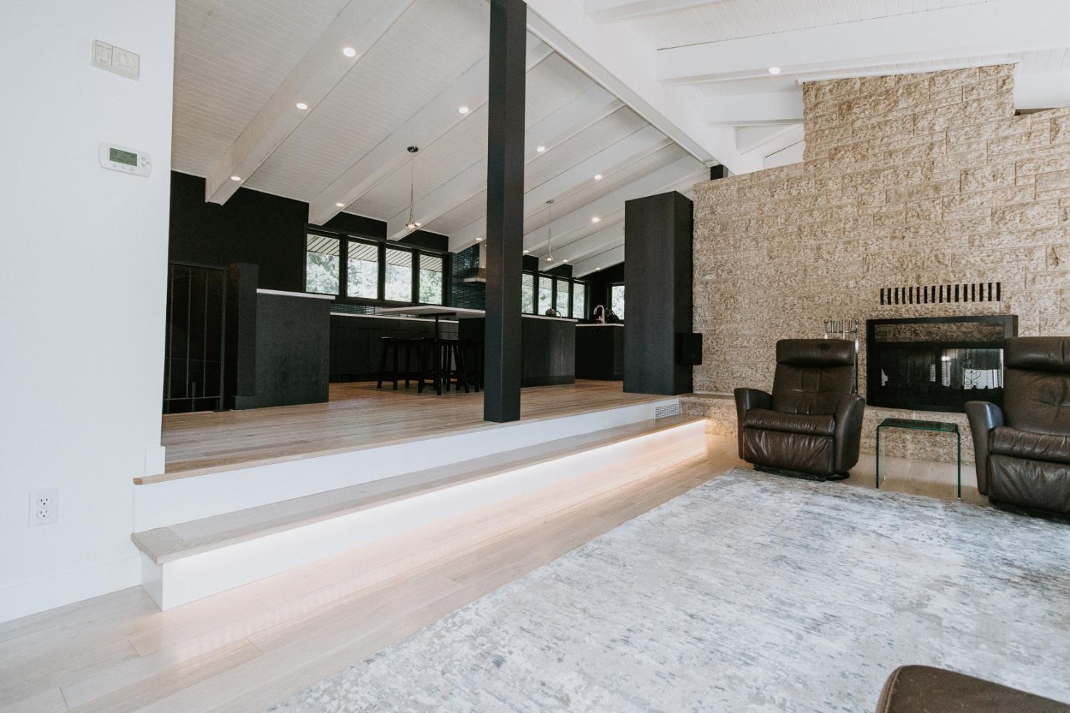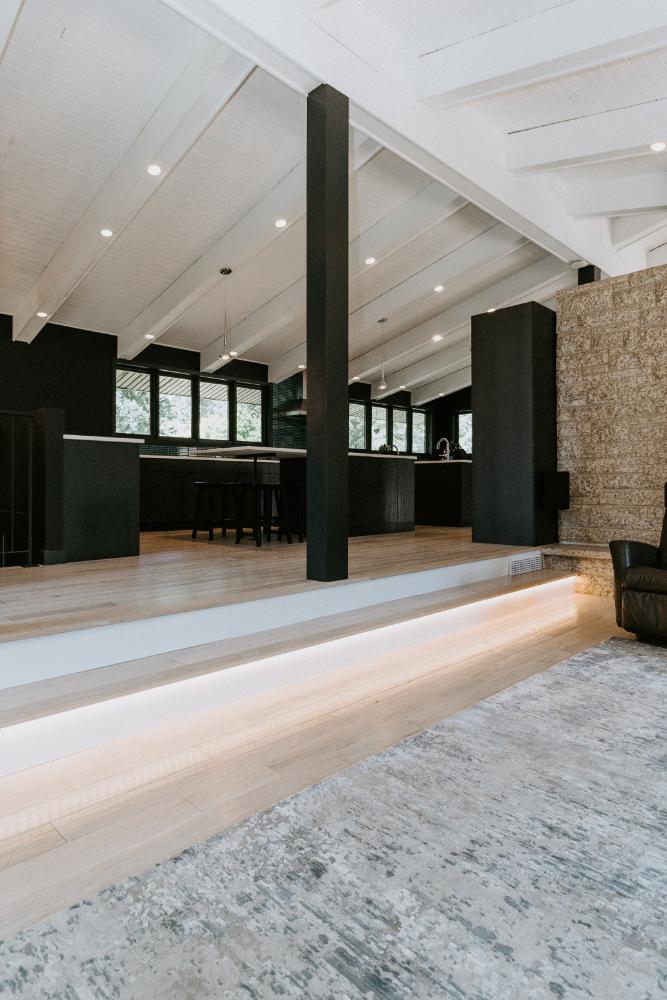 The renovation impacted the entire main floor, excluding the master bedroom and bathroom area. The spaces renovated included the large kitchen, dining area, sunken living room, and front entrance.