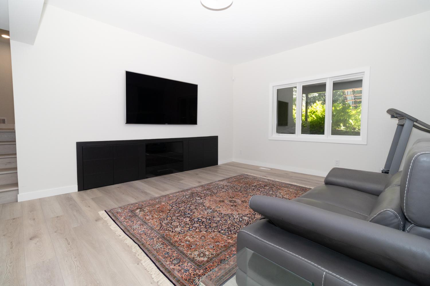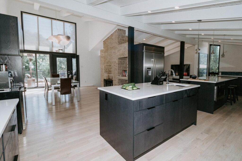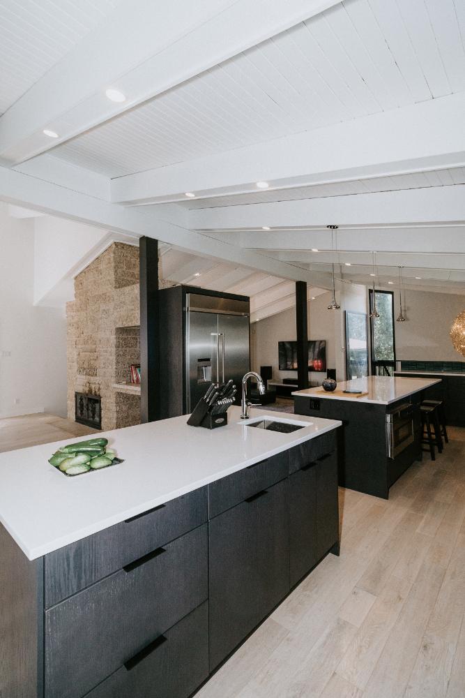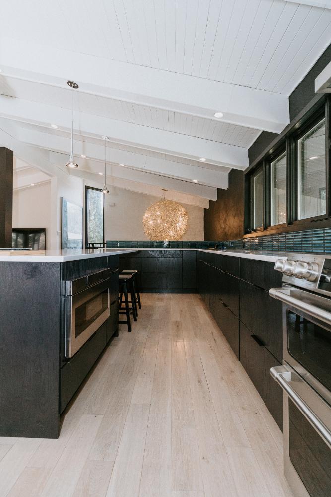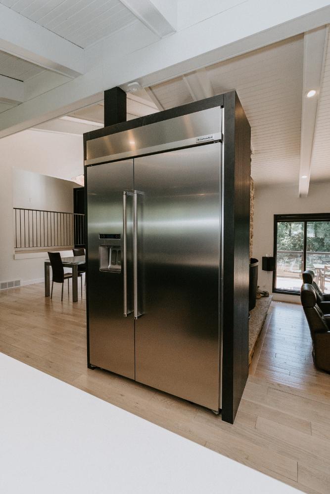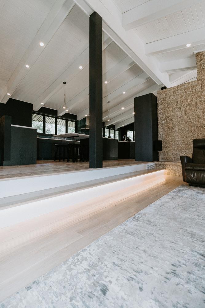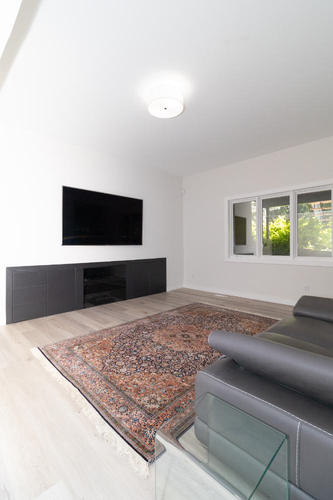 The renovation impacted the entire main floor, excluding the master bedroom and bathroom area. The spaces renovated included the large kitchen, dining area, sunken living room, and front entrance.