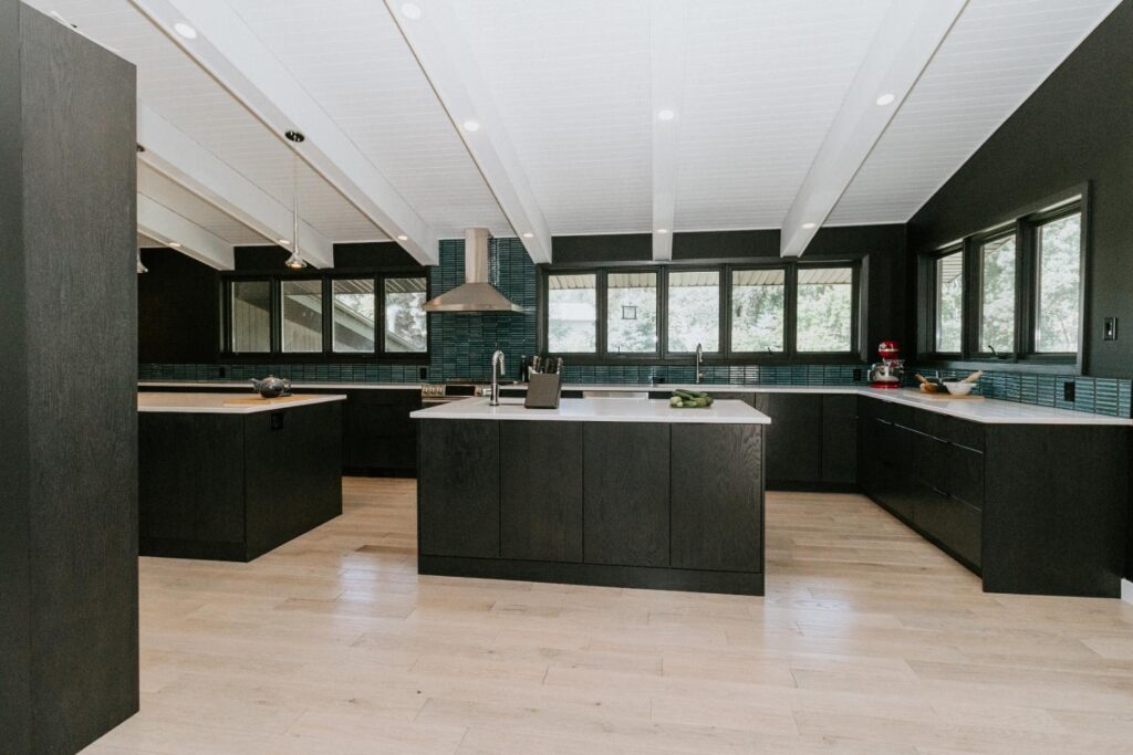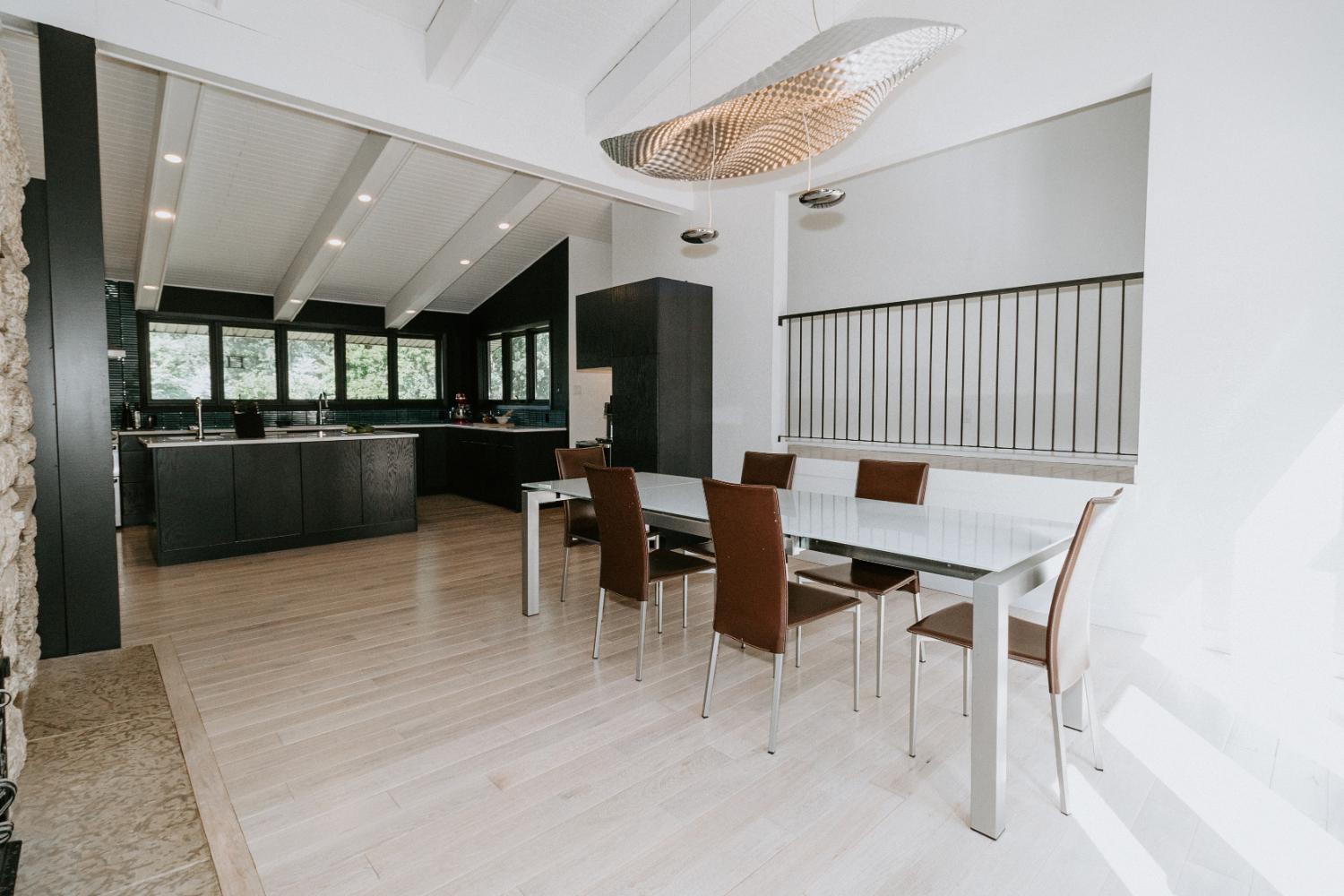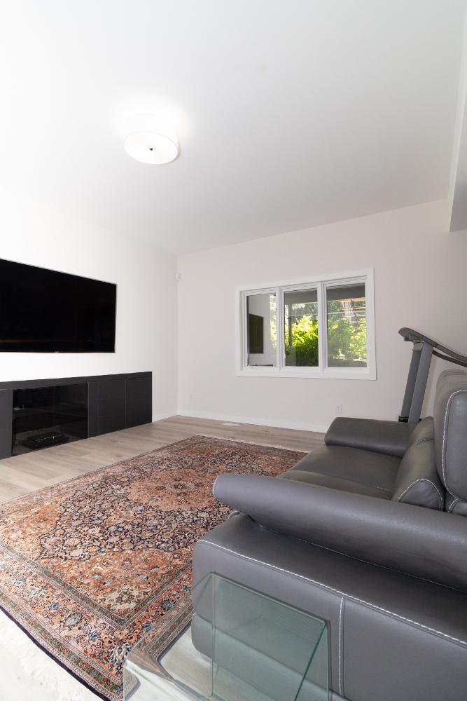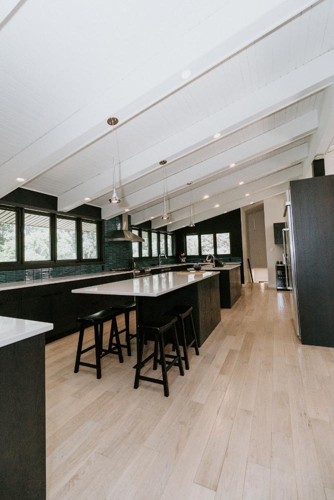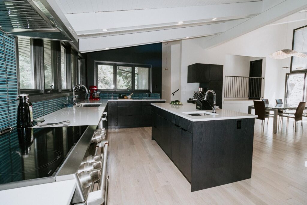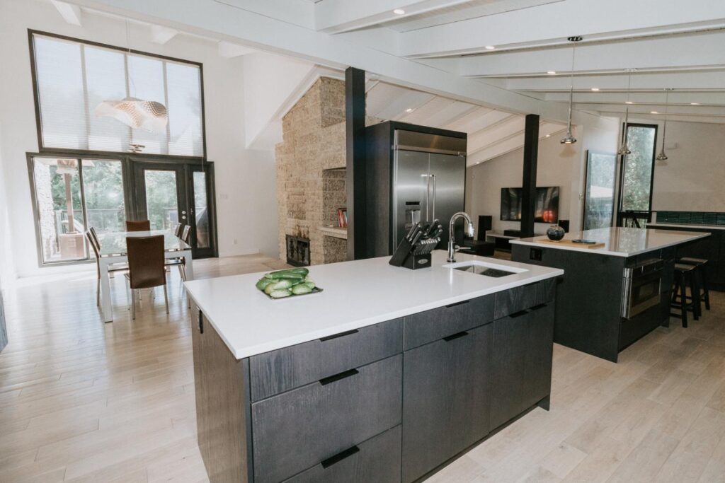 The renovation impacted the entire main floor, excluding the master bedroom and bathroom area. The spaces renovated included the large kitchen, dining area, sunken living room, and front entrance.