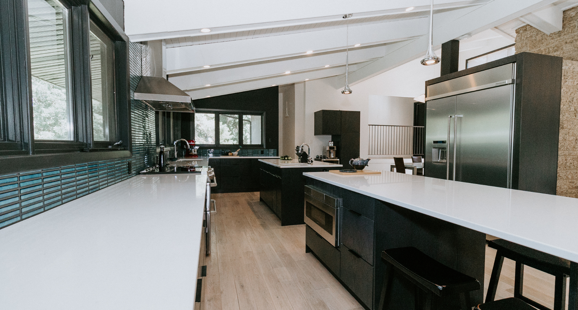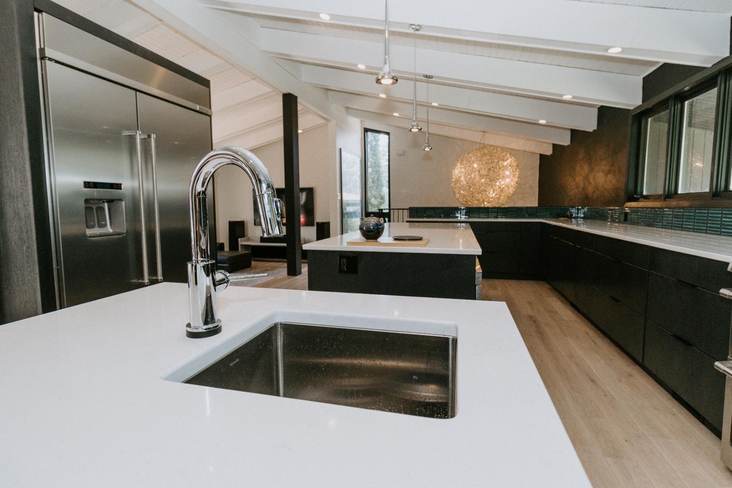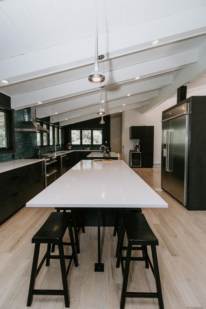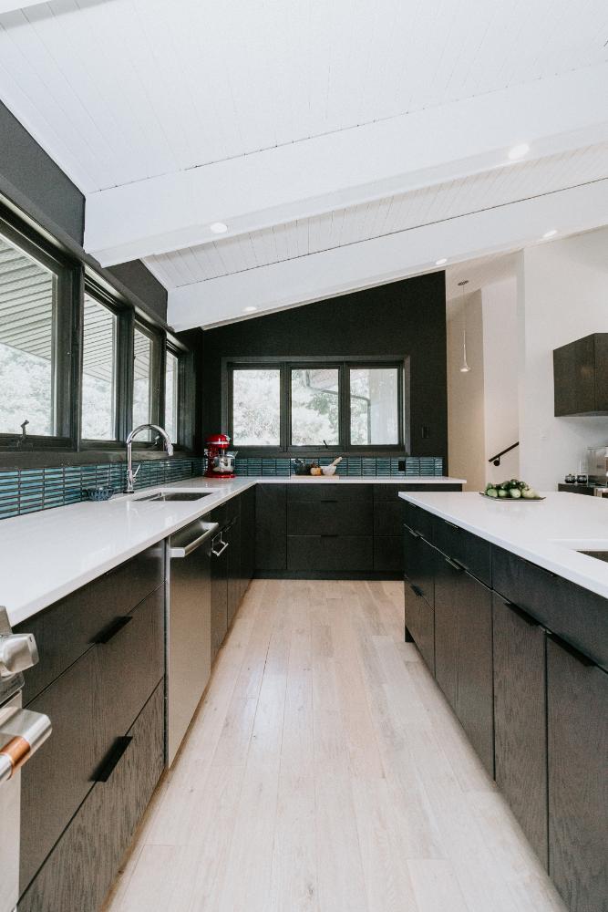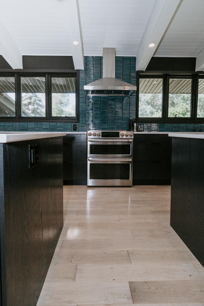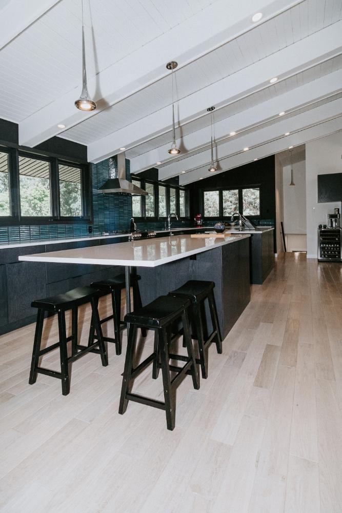 The renovation impacted the entire main floor, excluding the master bedroom and bathroom area. The spaces renovated included the large kitchen, dining area, sunken living room, and front entrance.