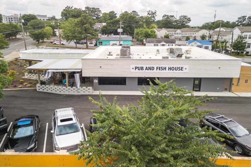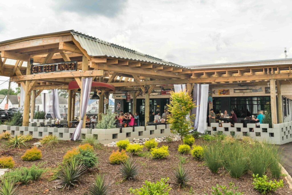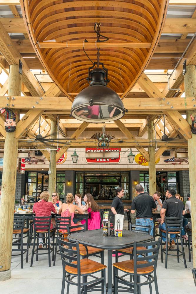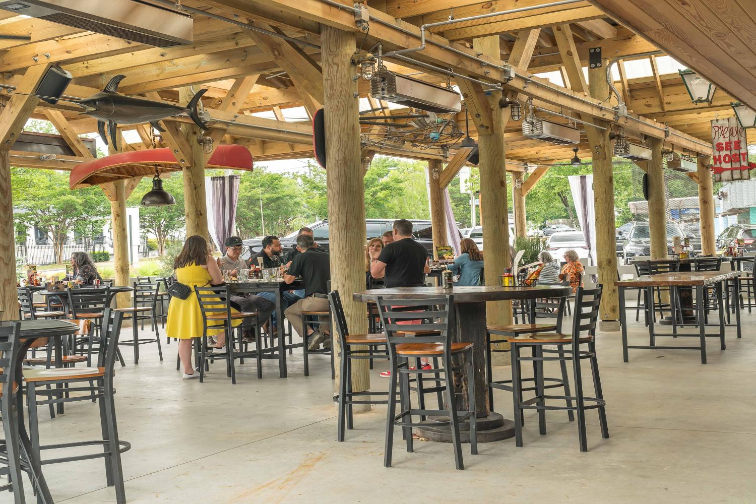 The outdoor patio, featuring a meticulously crafted wood structure with heaters and large fans, provides a comfortable environment year-round, blending tradition with modern comfort.