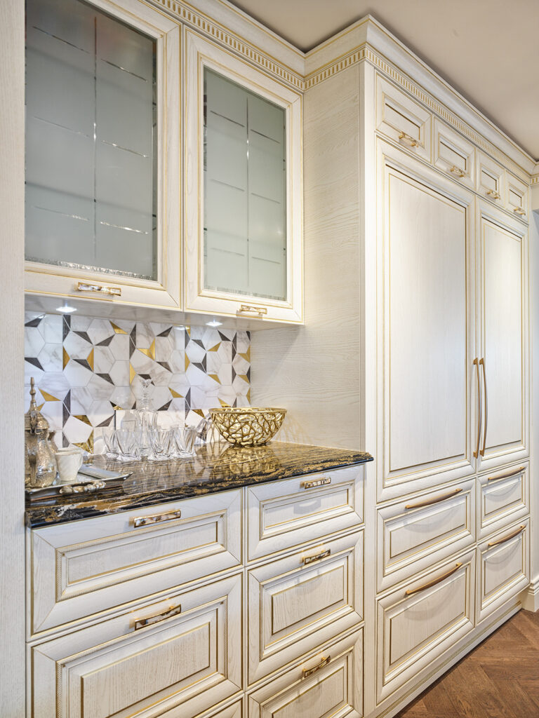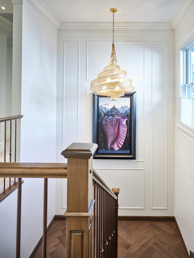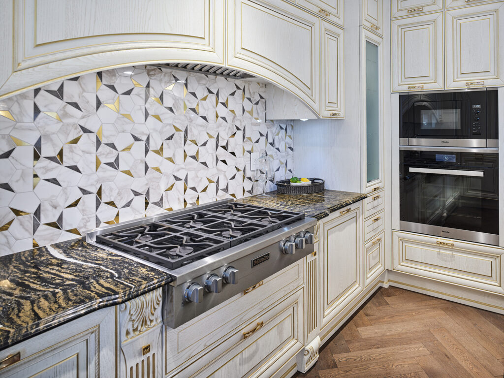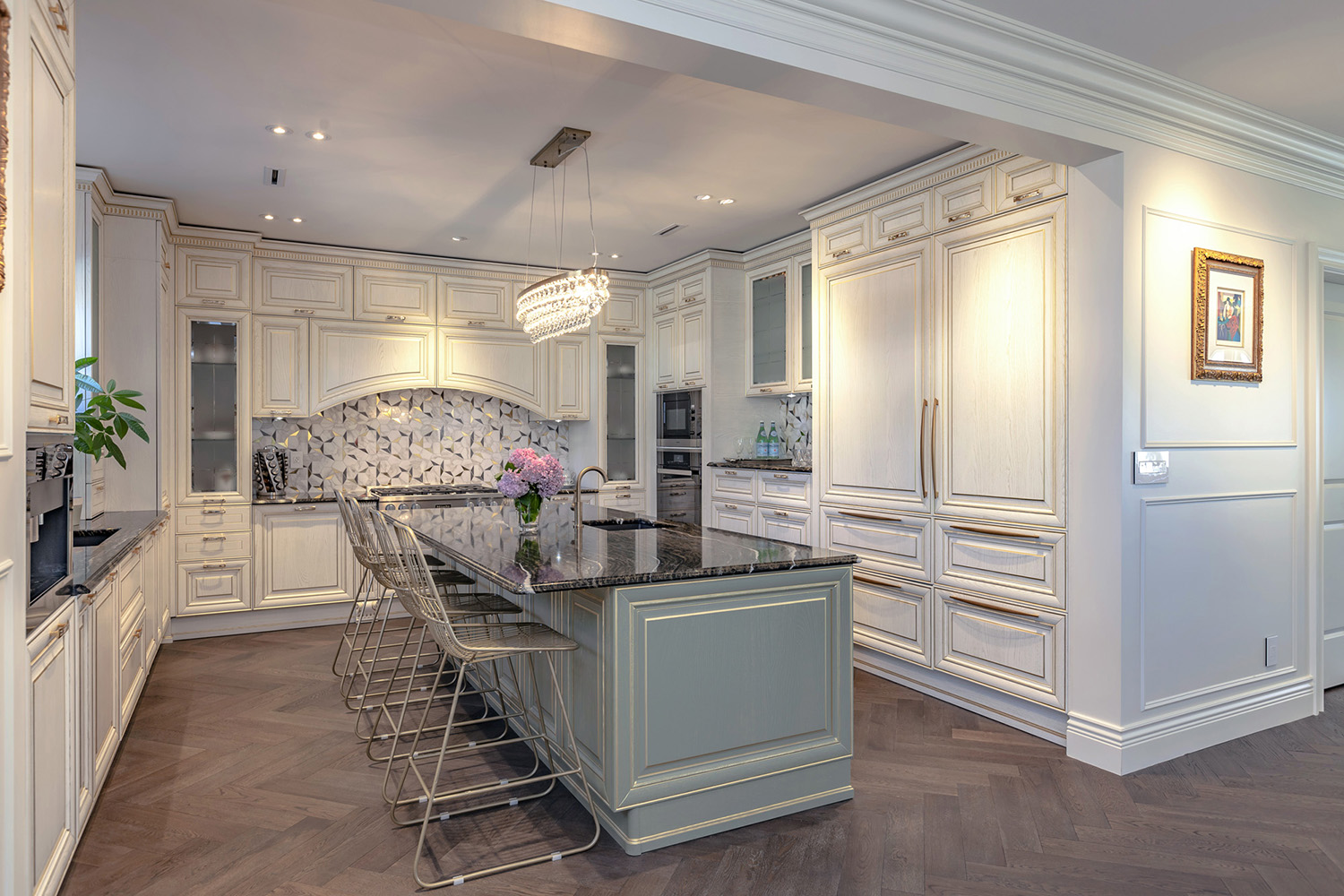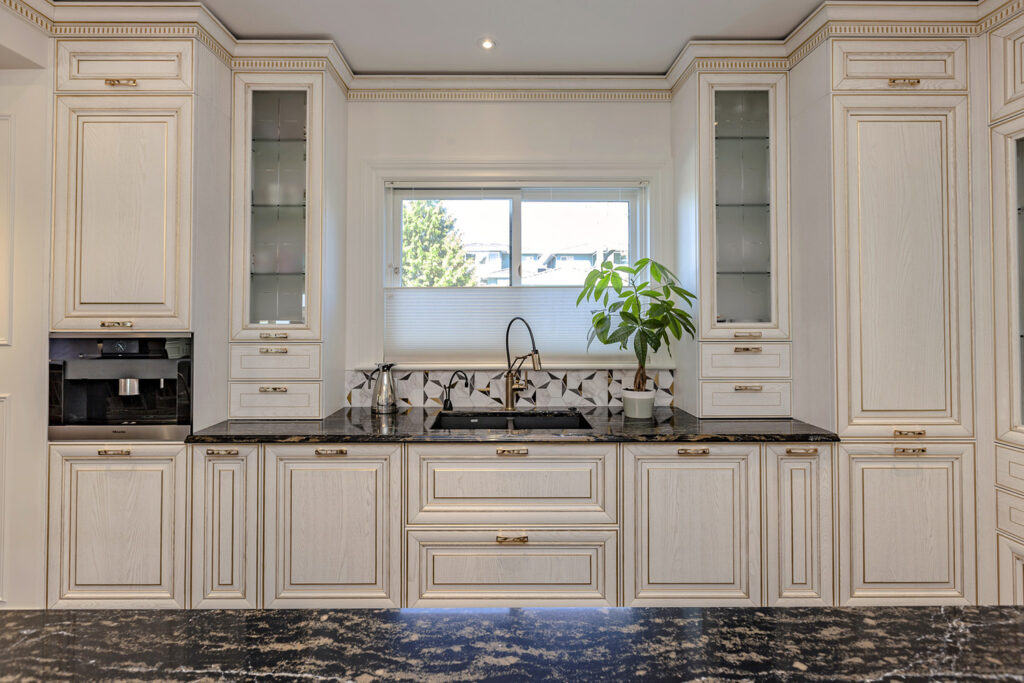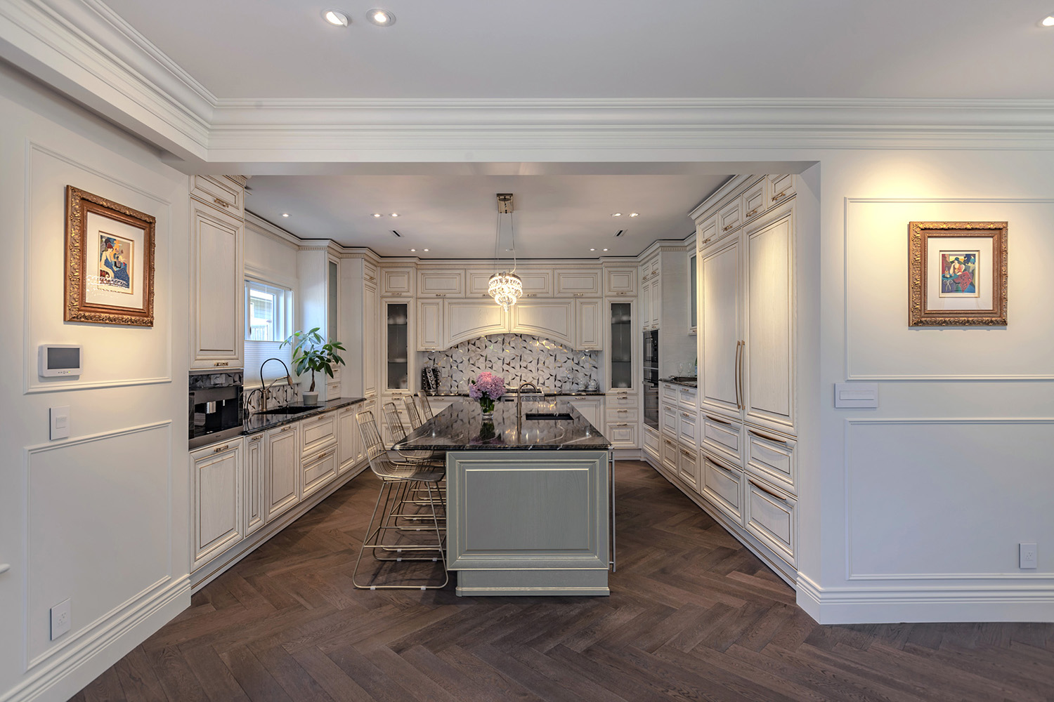 This gorgeous modern custom home features a very custom, high-end kitchen with a luxurious gold colour scheme that is used throughout the home. Hardwood flooring with the white walls and cabinetry gives this home a very modern and welcoming atmosphere.