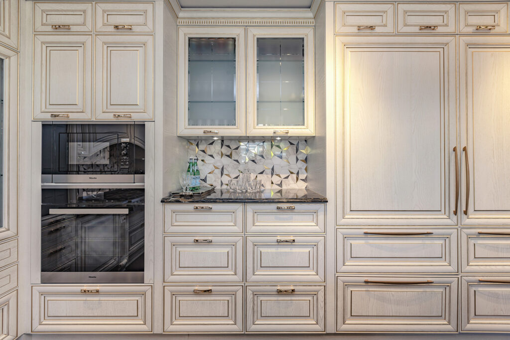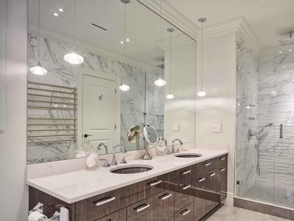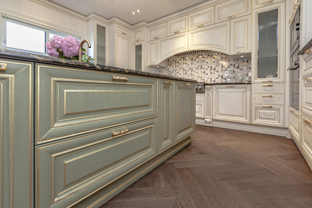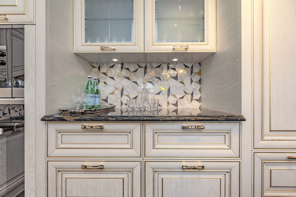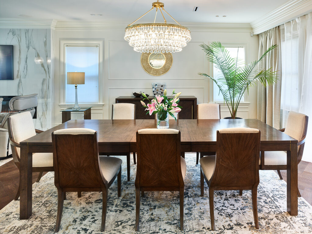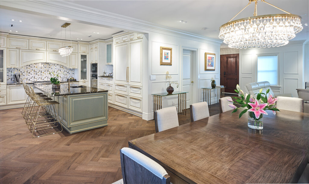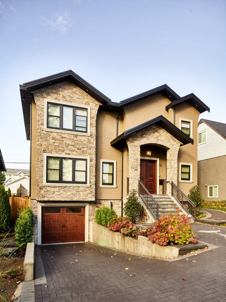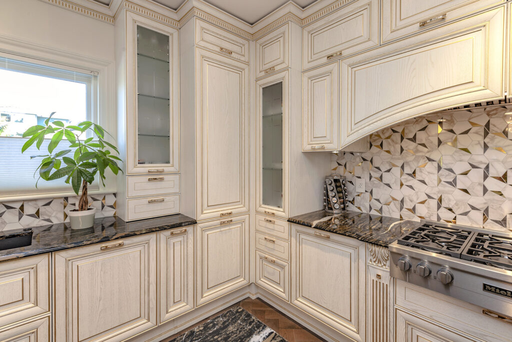 This gorgeous modern custom home features a very custom, high-end kitchen with a luxurious gold colour scheme that is used throughout the home. Hardwood flooring with the white walls and cabinetry gives this home a very modern and welcoming atmosphere.