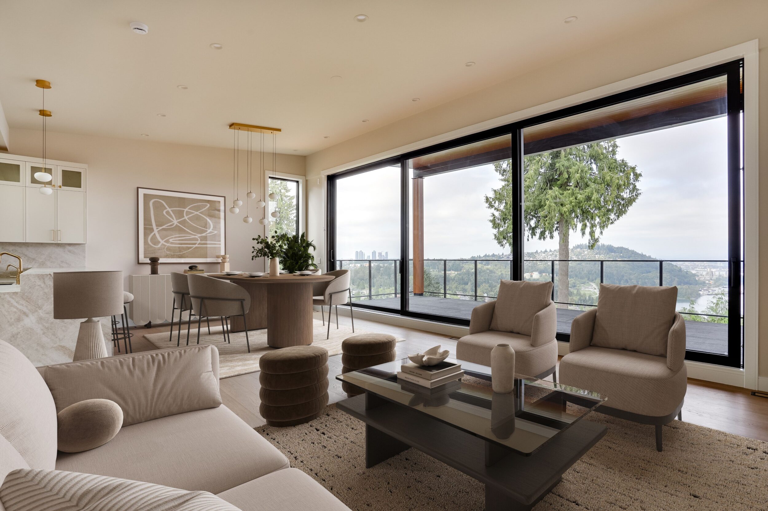 This 4,800-square-foot renovation in Burnaby was designed to fully embrace its spectacular setting while transforming the home for modern living. The design centres around a dramatic connection between indoor and outdoor spaces. A striking 26-foot opening with three large sliding glass panels leads from the main living area onto an expansive patio, perfectly framing sweeping views of Burrard Inlet and the surrounding landscape. Whether open to the fresh air or closed for comfort, the wall of glass ensures the view remains a constant and breathtaking feature of the home.