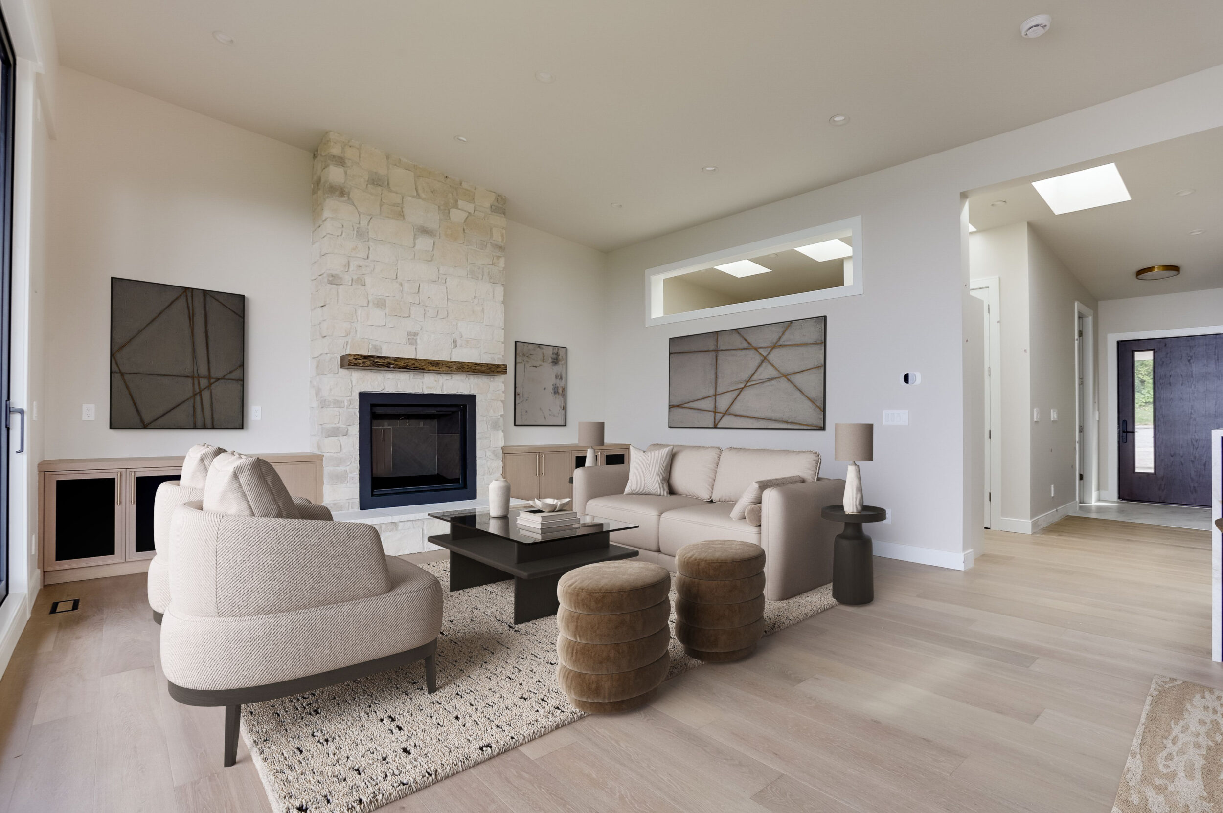 Inside, the main level was reimagined to create an open, welcoming flow for everyday living and entertaining. A spacious kitchen with an abundance of custom storage anchors the space. It connects to a bright dining area and an expansive living room with a fireplace. Together, these spaces create a warm and inviting environment for hosting family and friends.