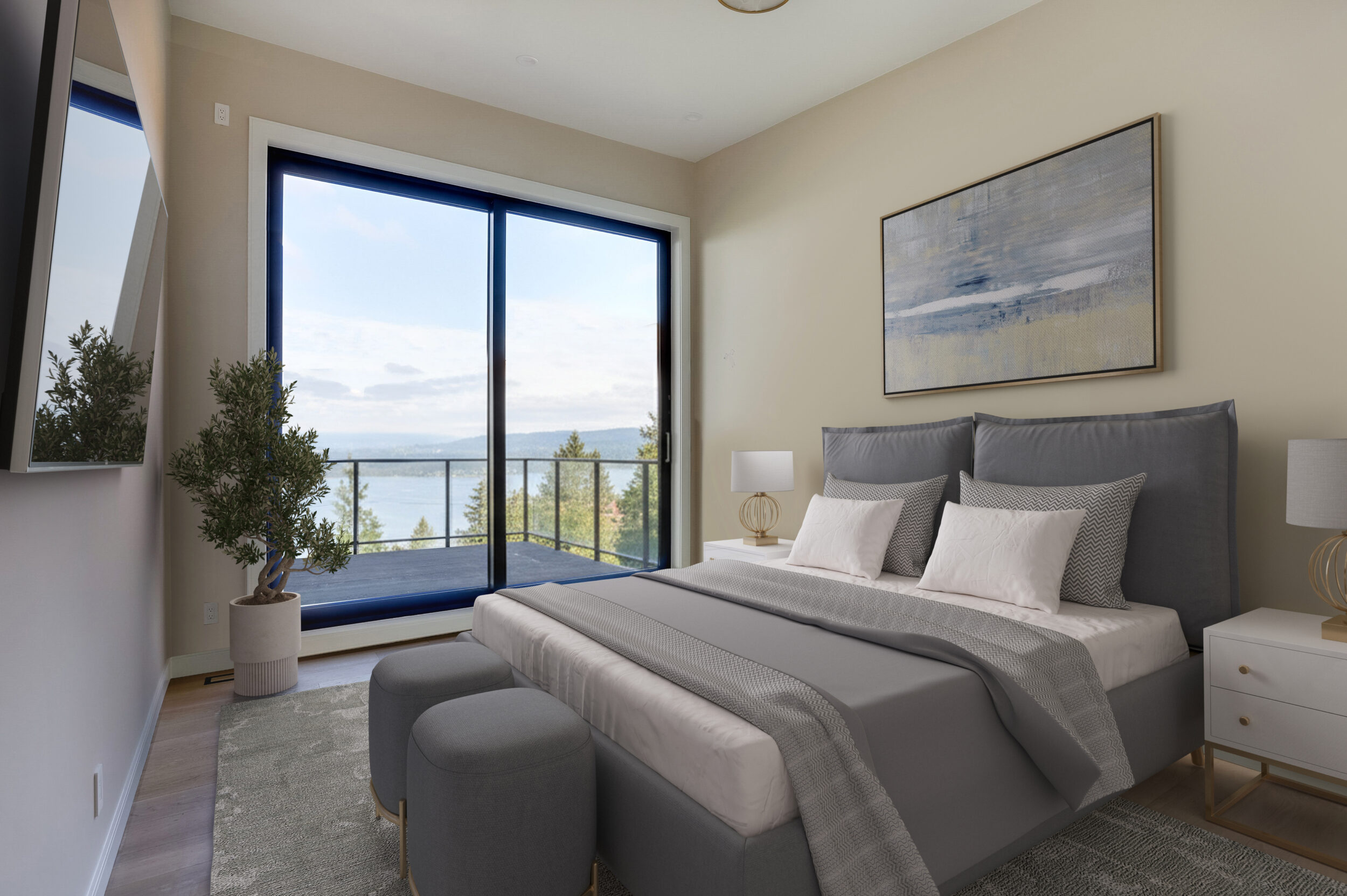 The primary bedroom features sliding glass doors leading onto the patio overlooking Burrard Inlet.