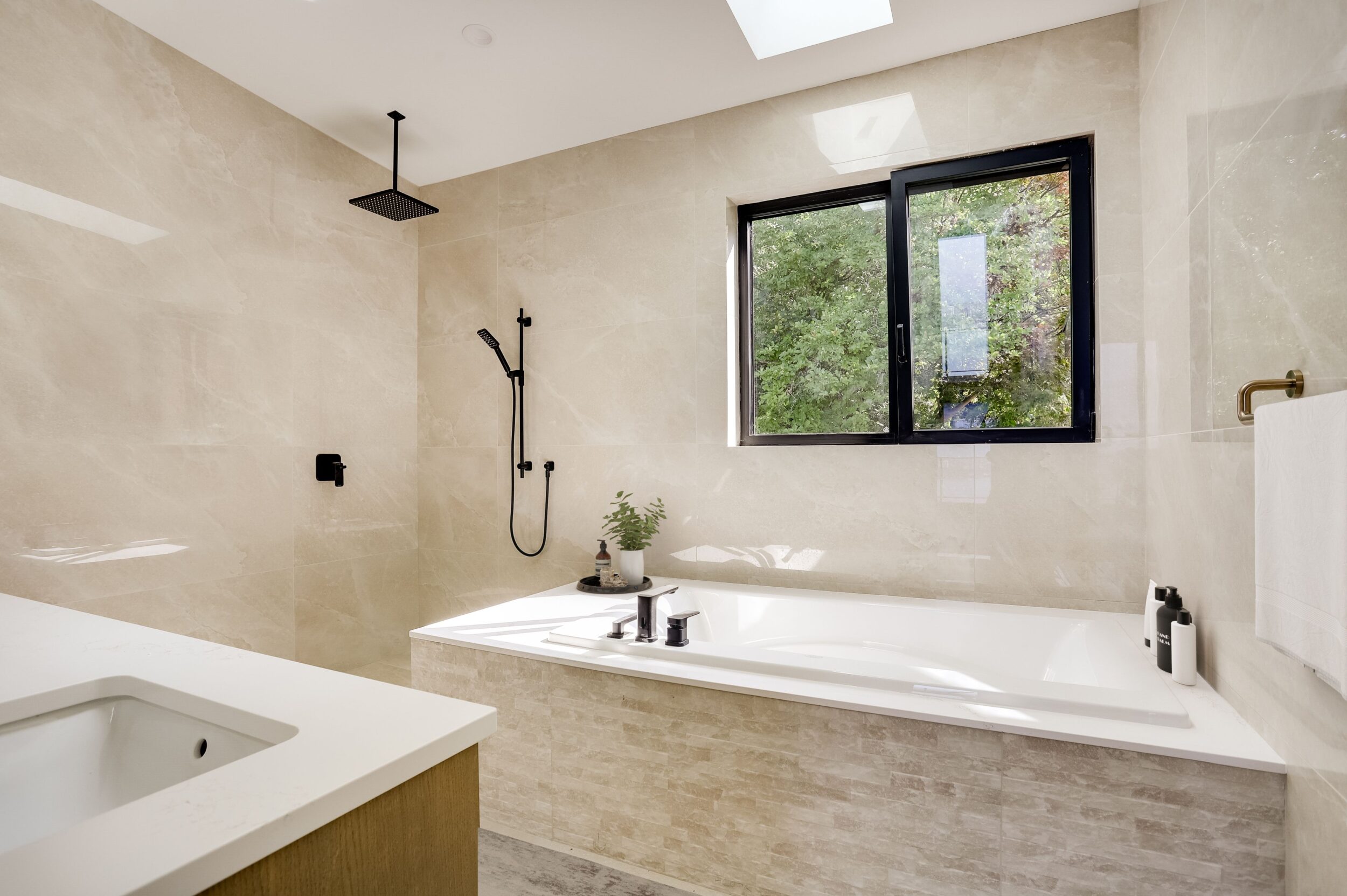 Spacious primary bathroom with a rain shower and soaker tub.