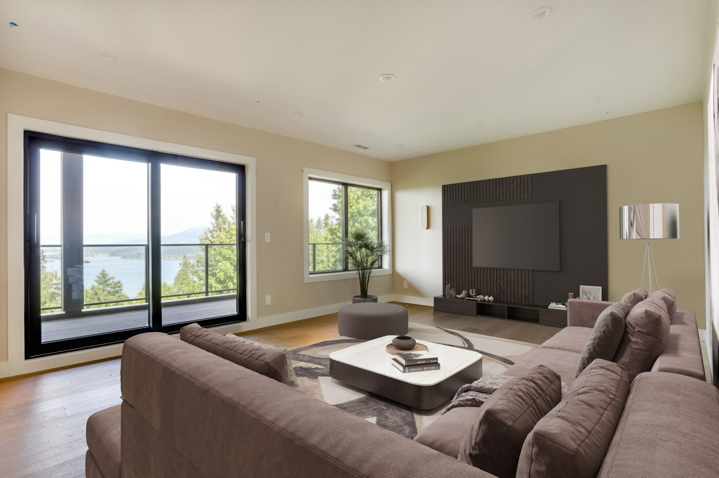 Large media room on the lower floor also has sliding glass doors leading onto the lower deck.