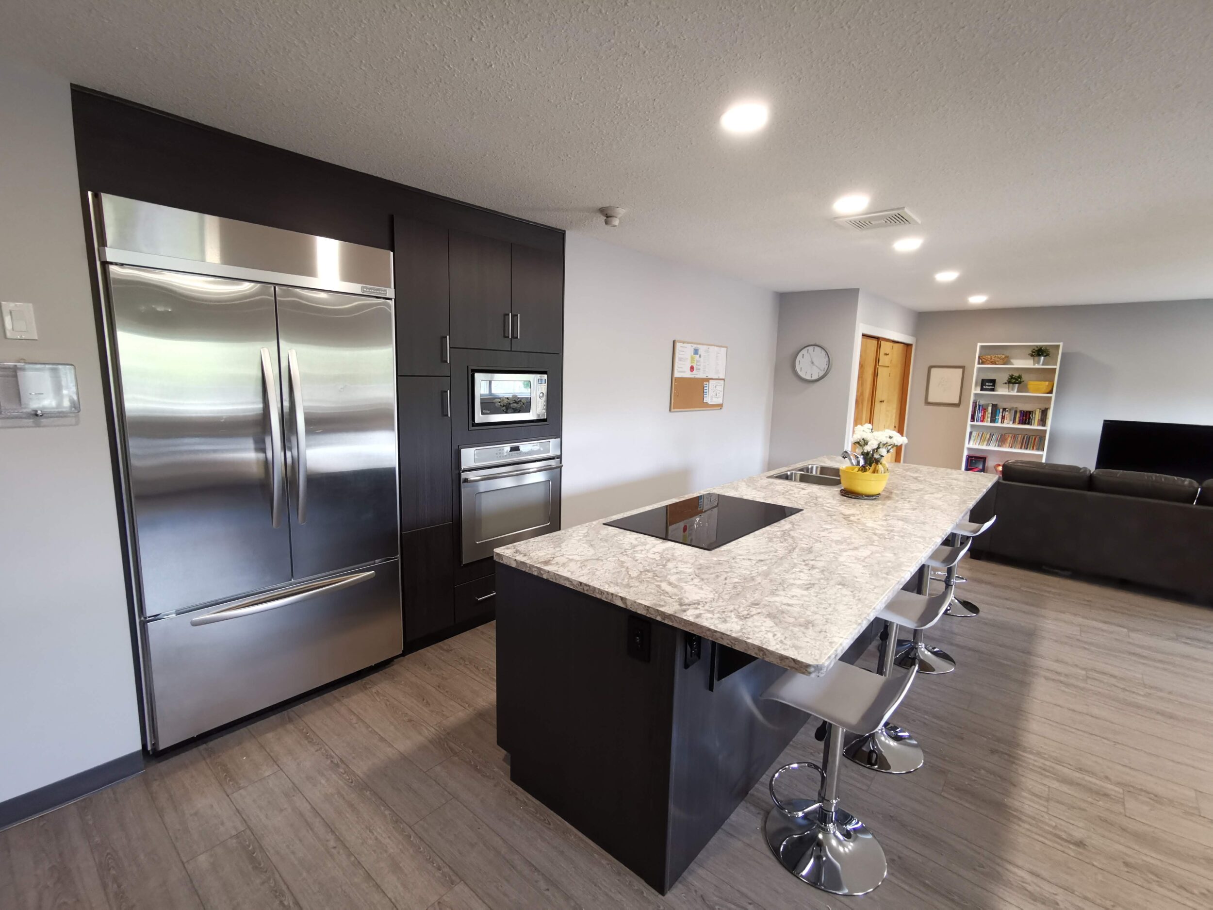 We kept the kitchen design simple, but efficient. We made the island as large as possible without having a seam in the countertop, which made it hit the twelve-foot mark. A beautiful built-in fridge and oven on the wall side of the kitchen allowed the staff and residents a very efficient workspace that brought everything together.