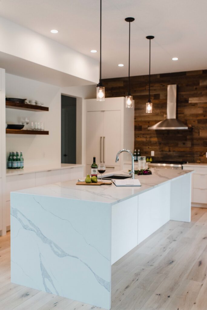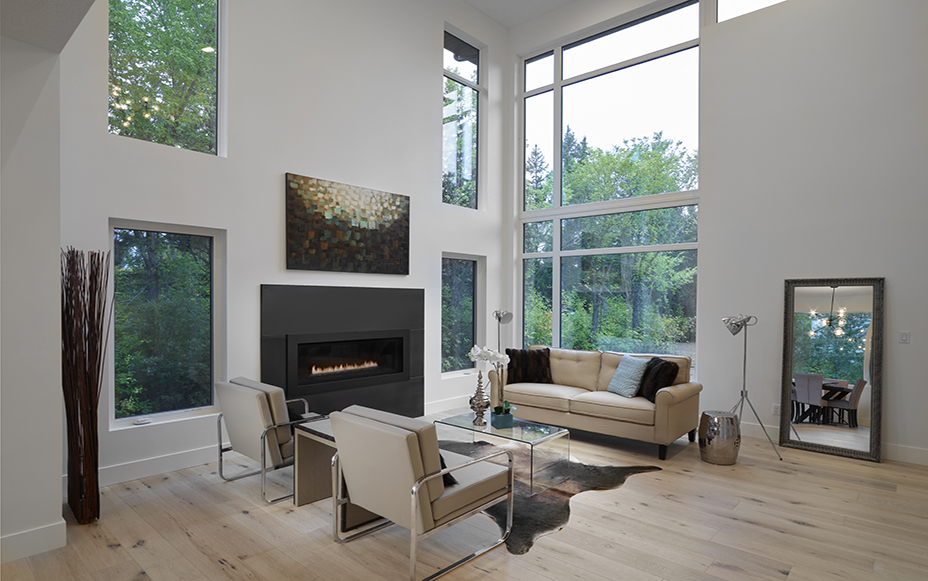This contemporary custom home features and open concept layout, contemporary design, and luxurious finishes. The main living space has a unique, contemporary window layout that is nicely complimented by the high ceilings. The modern light wood floors and white walls bring a very bright and open feel that continues through to the kitchen/dining area. A unique element to this kitchen is the reclaimed wood feature wall. This adds a more rustic feel to the home that matches nicely to the dark tiled ribbon fireplace.