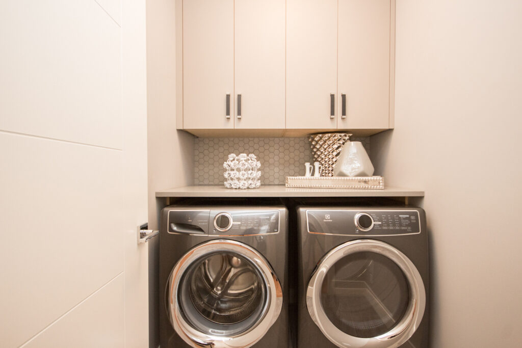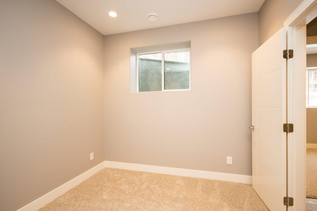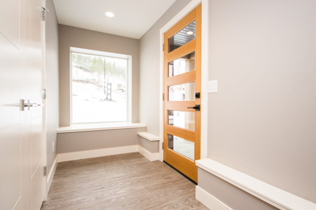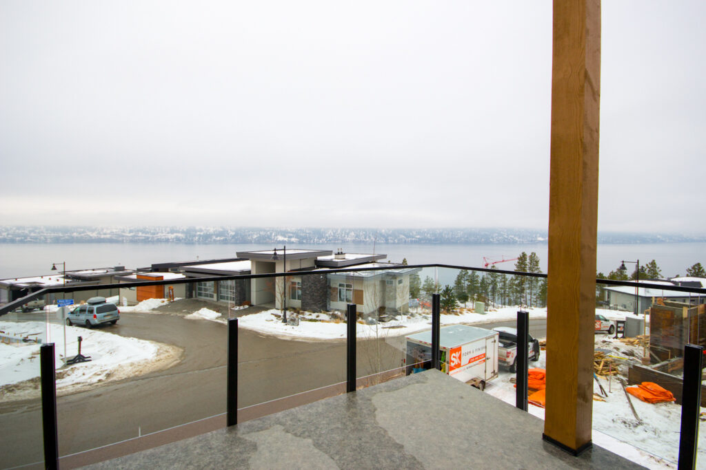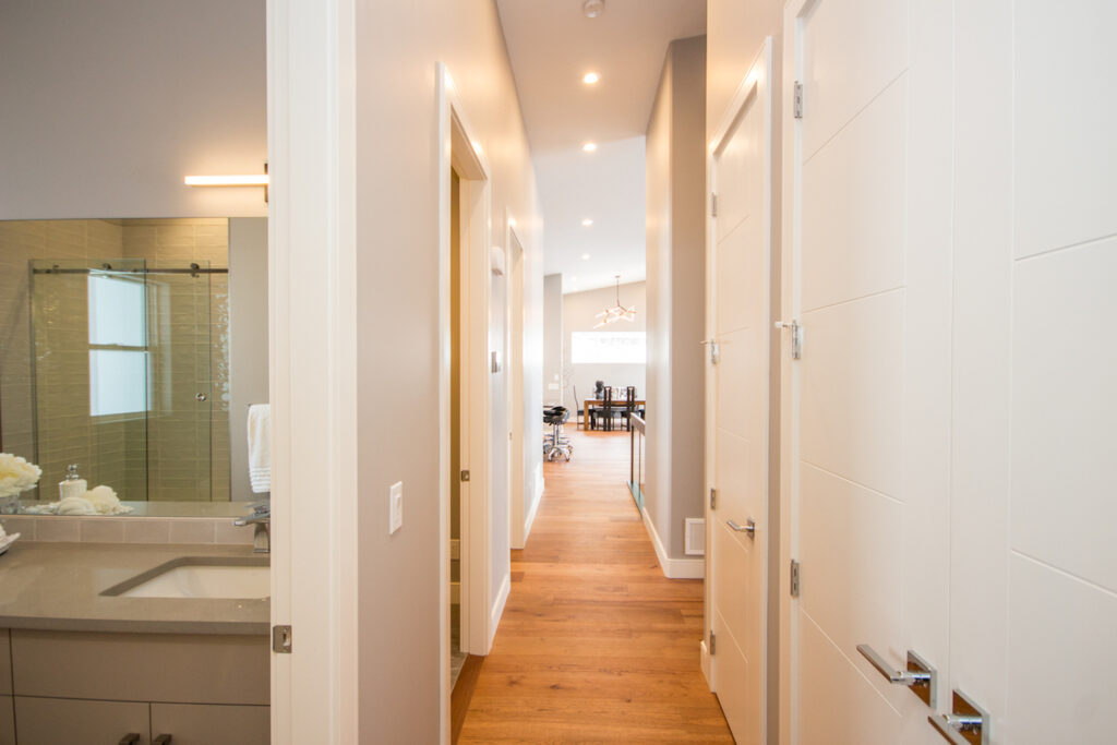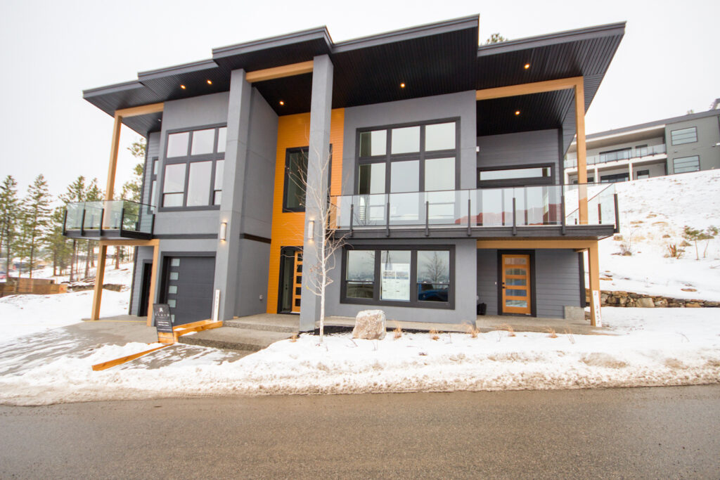 An unique modern custom home featuring an open concept main floor, modern kitchen, large windows, hardwood floors, and high-end finishes. The kitchen has an island with unique bar stool seating and rose gold pendant lights.