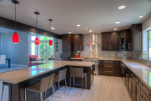 Homeowners often believe that wallpaper is too fragile for the heat and humidity in a custom kitchen. This may be true of regular wallpaper, but speciality wallpaper exists that is sturdy enough to do kitchen or bathroom duty. To be especially safe, the wallpaper can be paired with a colorful backsplash. Putting up wallpaper can be a chore, so get in touch with a professional for help.