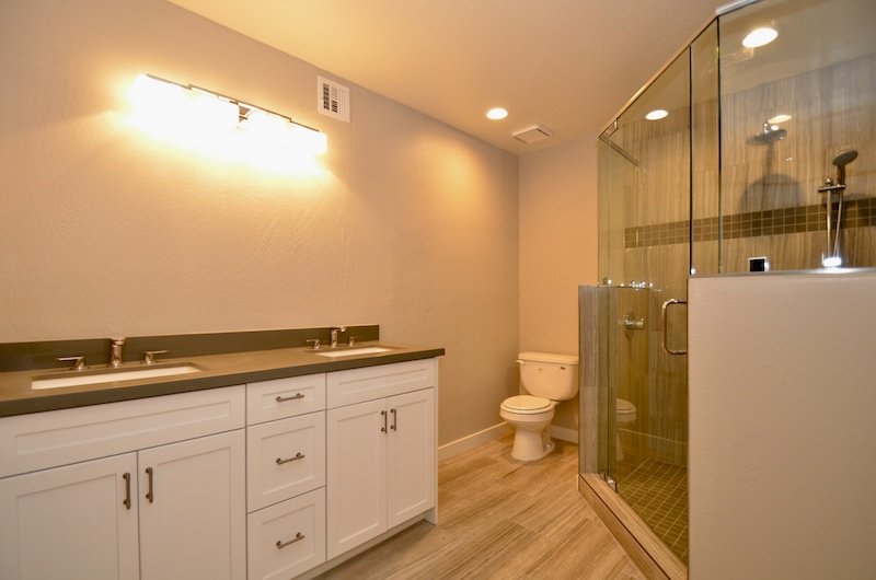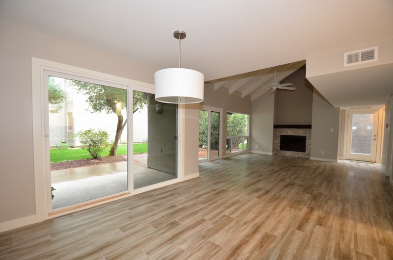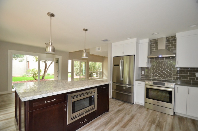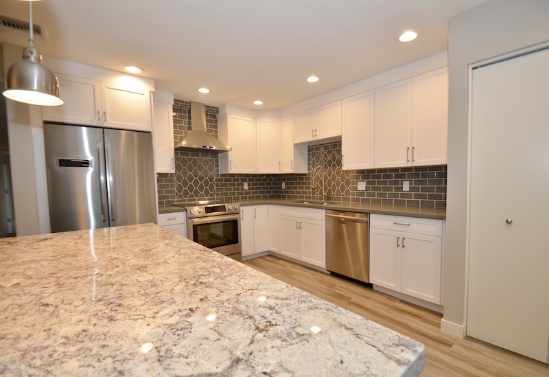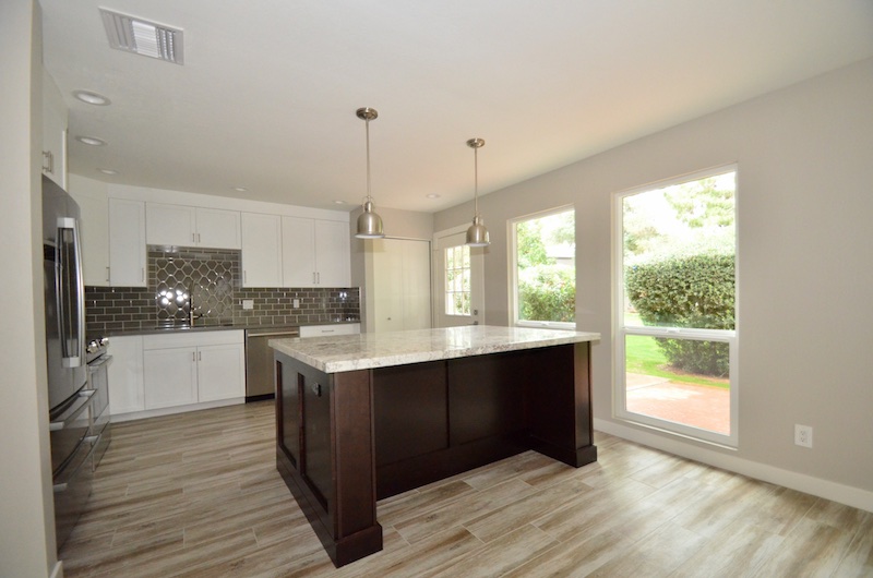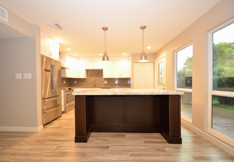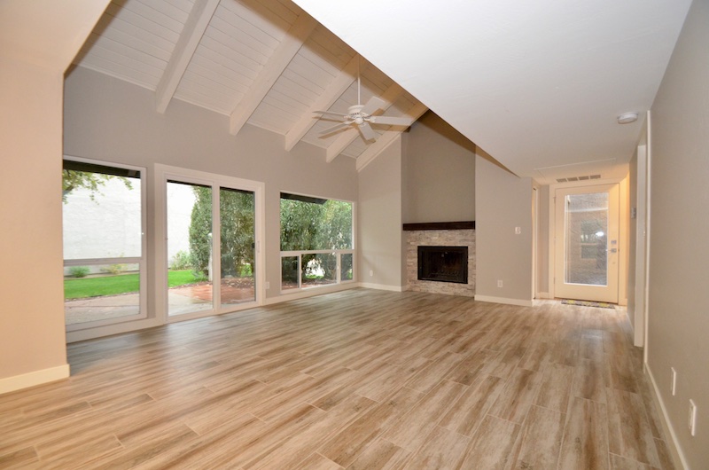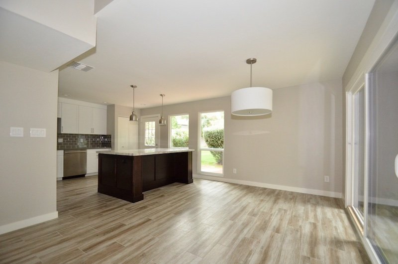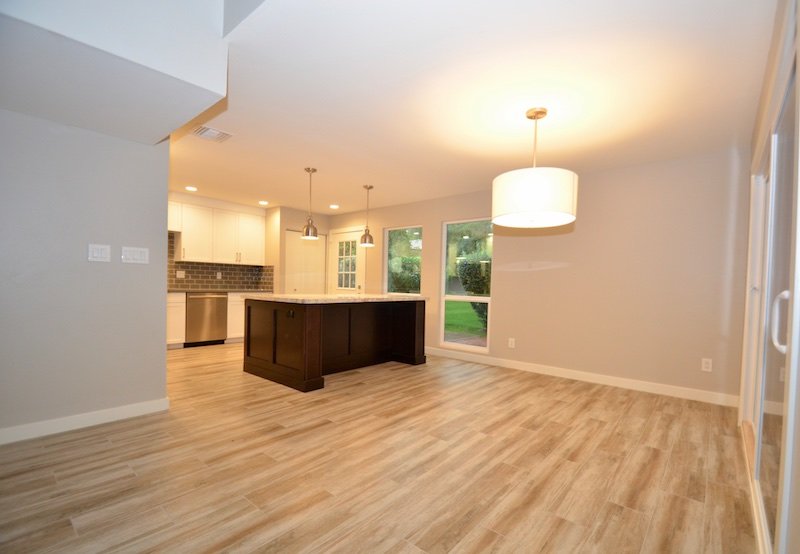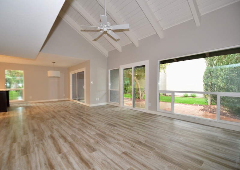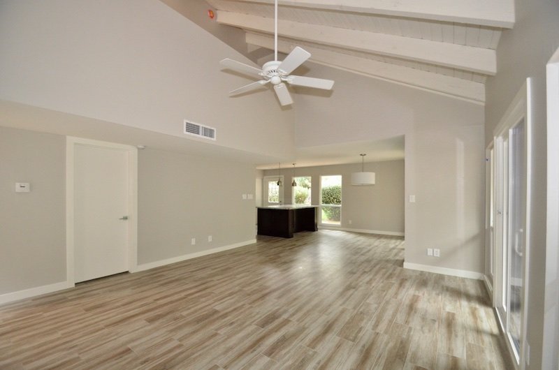 A mid-century modern home remodel with an open concept layout, vaulted ceilings, and light laminate floors throughout. The kitchen was completely gutted to start fresh with all new fixtures, appliances, and a glass subway tile backsplash. The open concept design creates an airy feel throughout the home from the front entry to the main living room area.