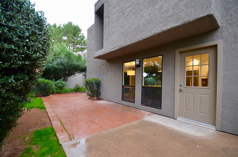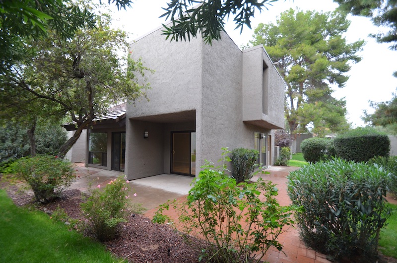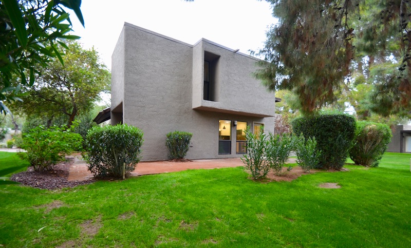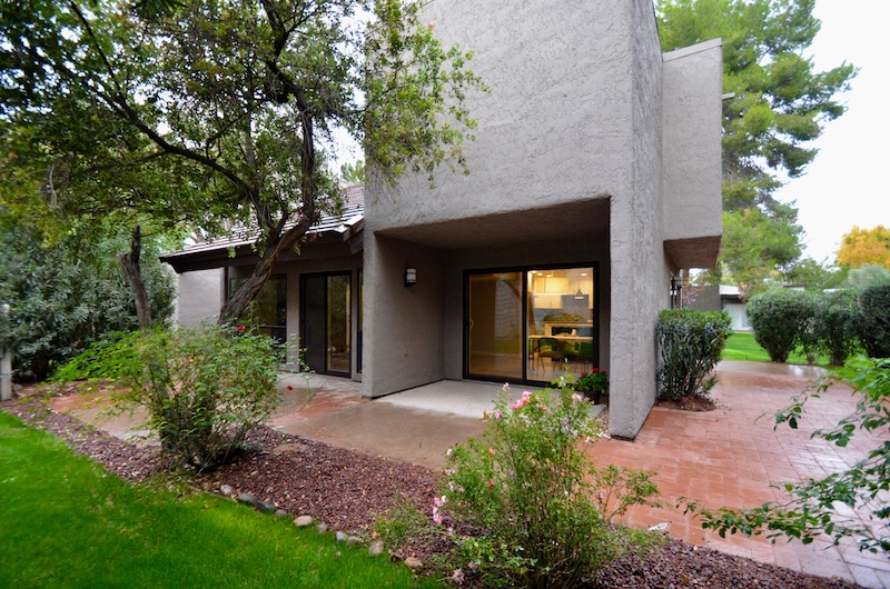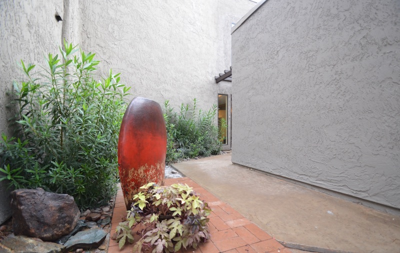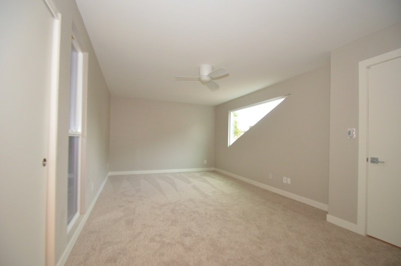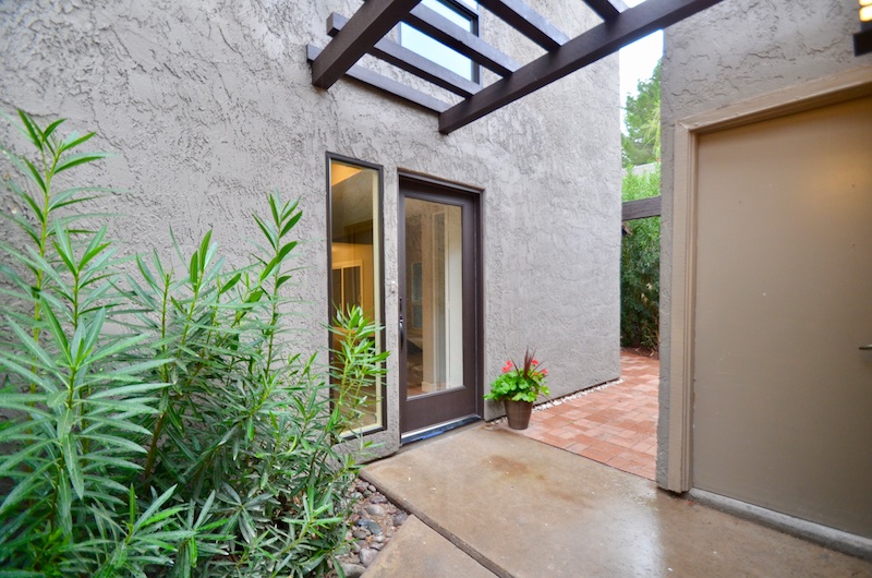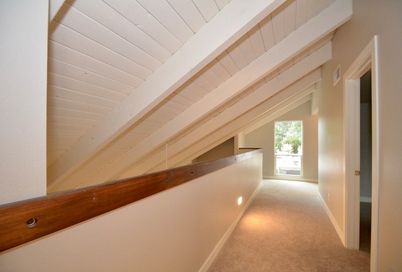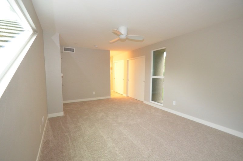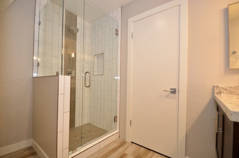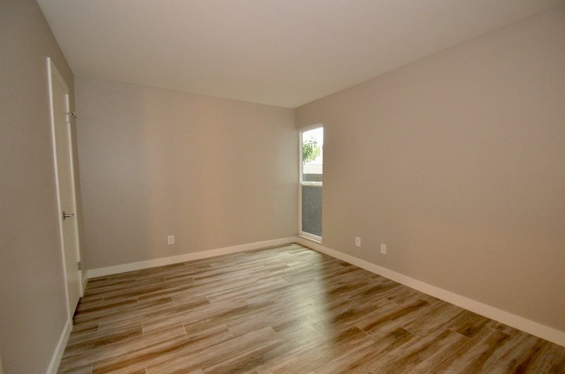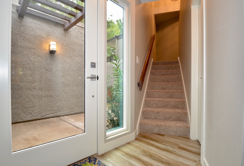 A mid-century modern home remodel with an open concept layout, vaulted ceilings, and light laminate floors throughout. The kitchen was completely gutted to start fresh with all new fixtures, appliances, and a glass subway tile backsplash. The open concept design creates an airy feel throughout the home from the front entry to the main living room area.