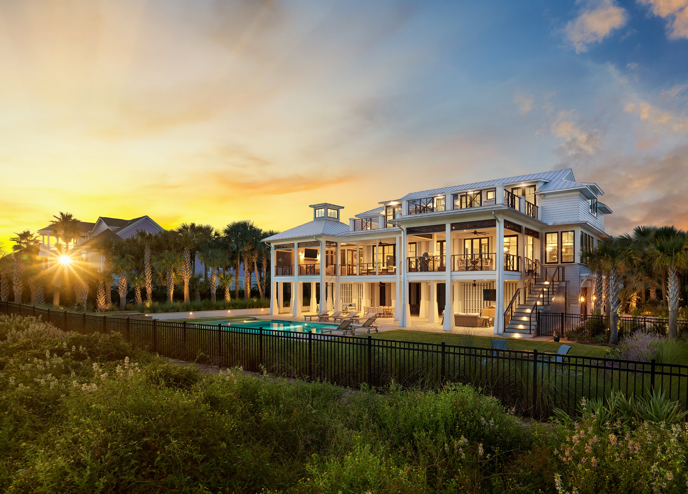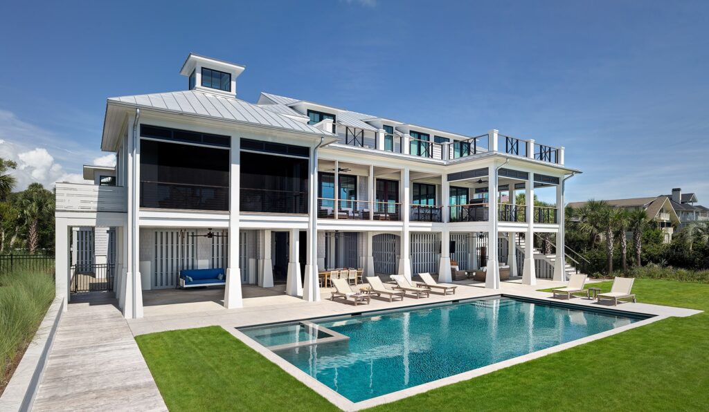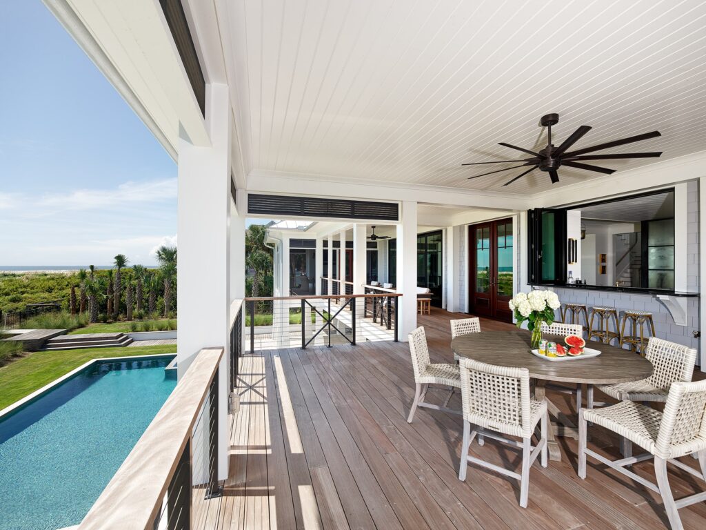 This fully elevated home features a ground-level entertainment area flowing to a pool, a main-level master suite with private porch, and a top-floor walkout porch with 180-degree ocean views.